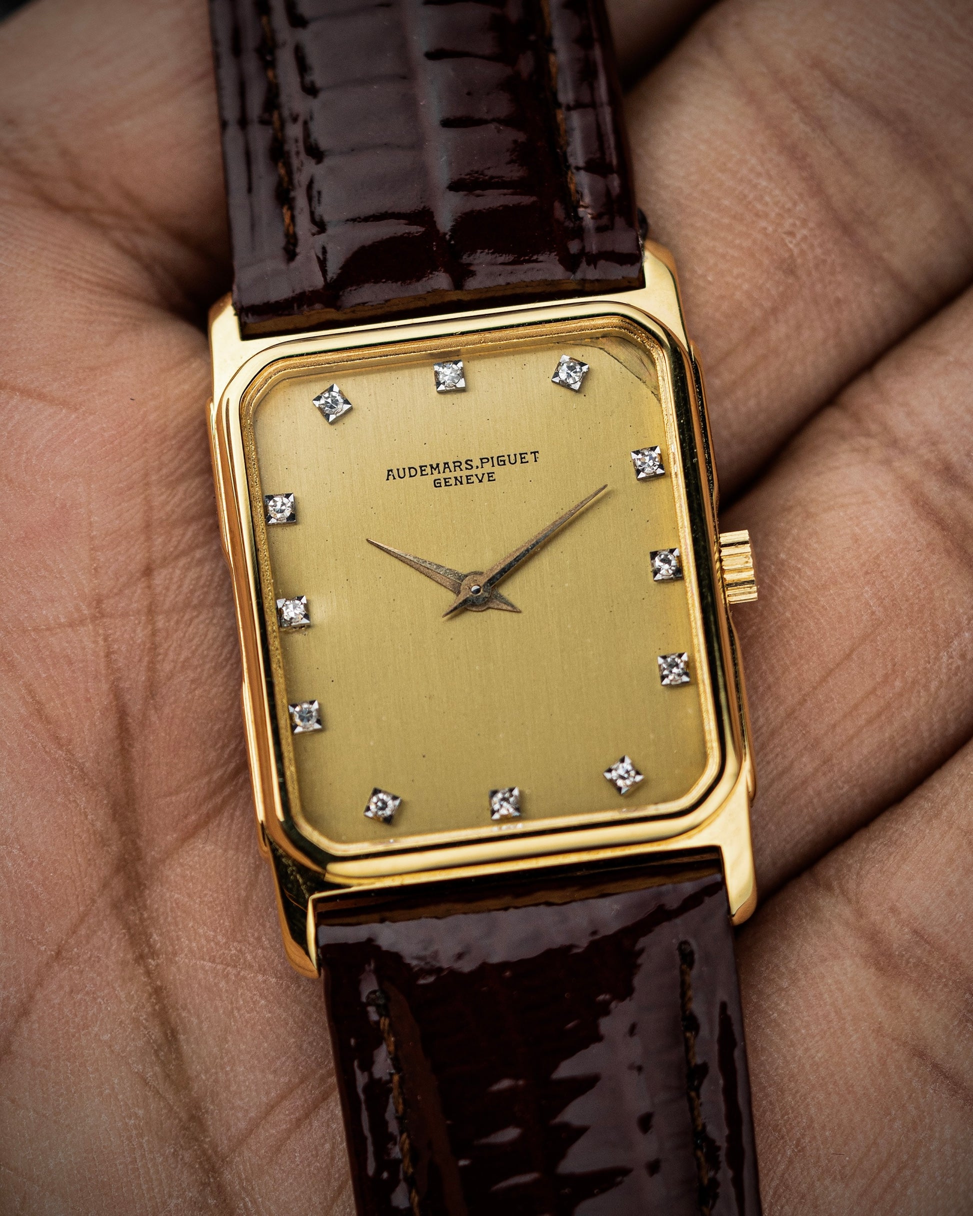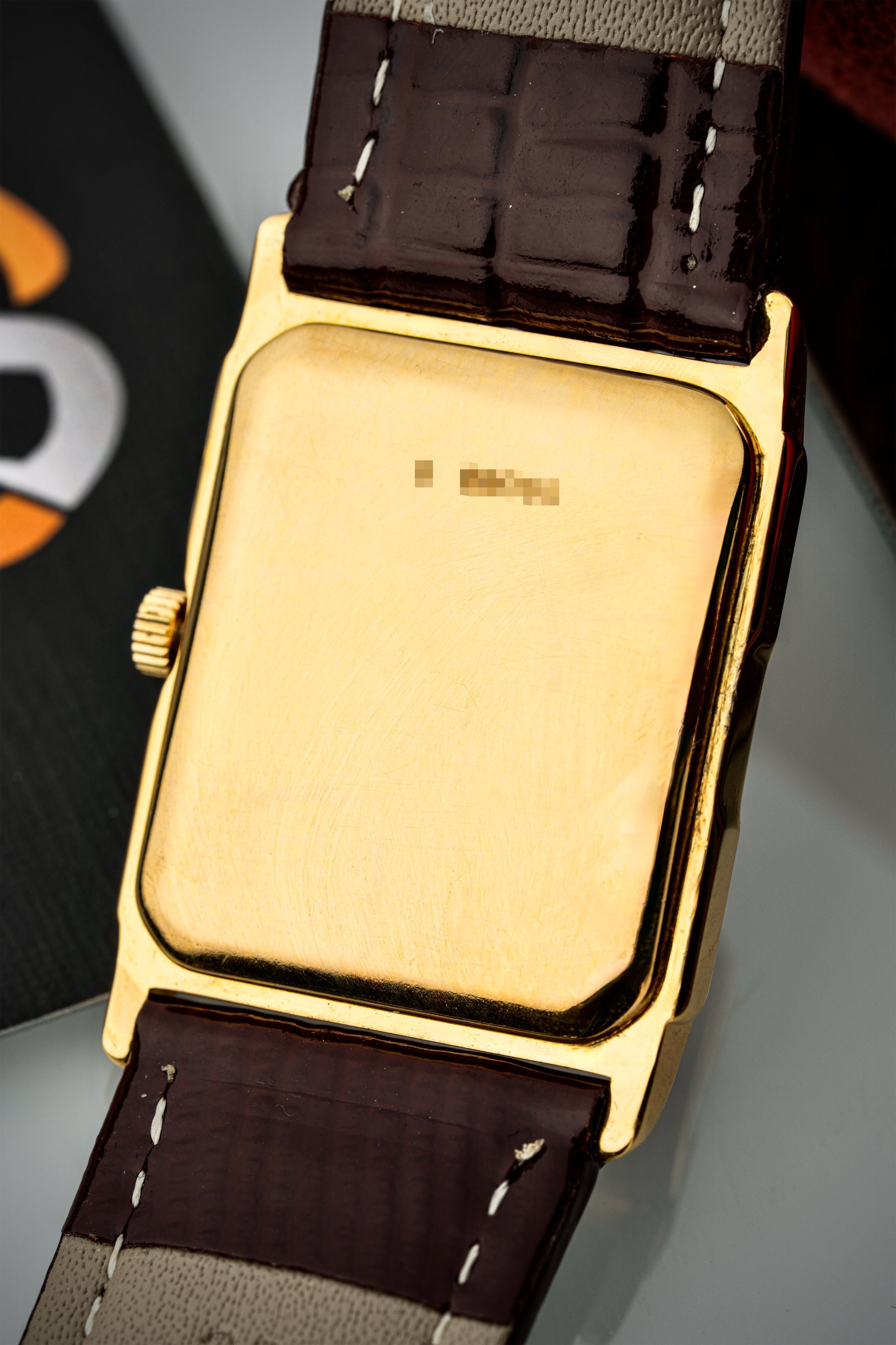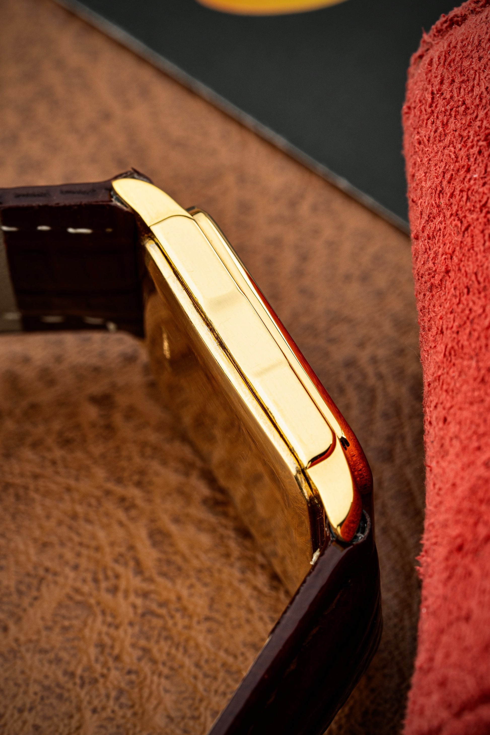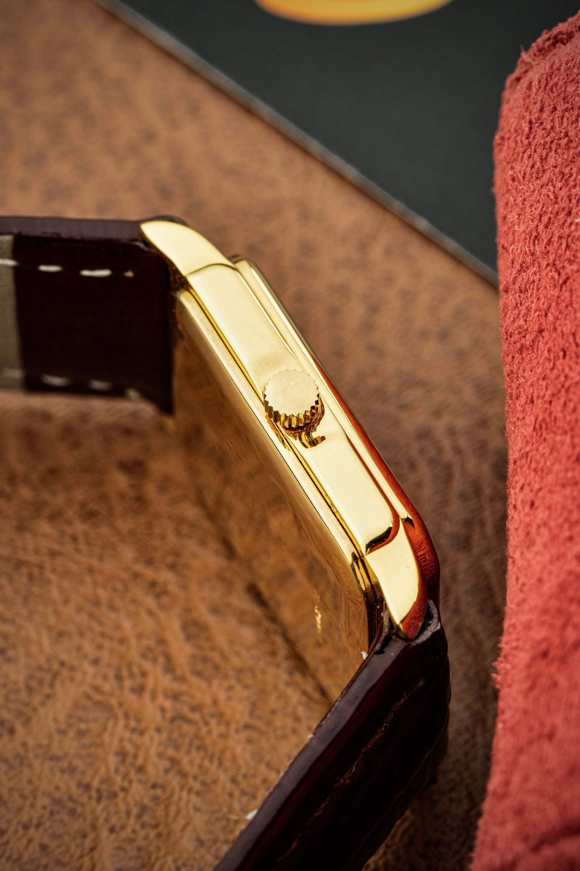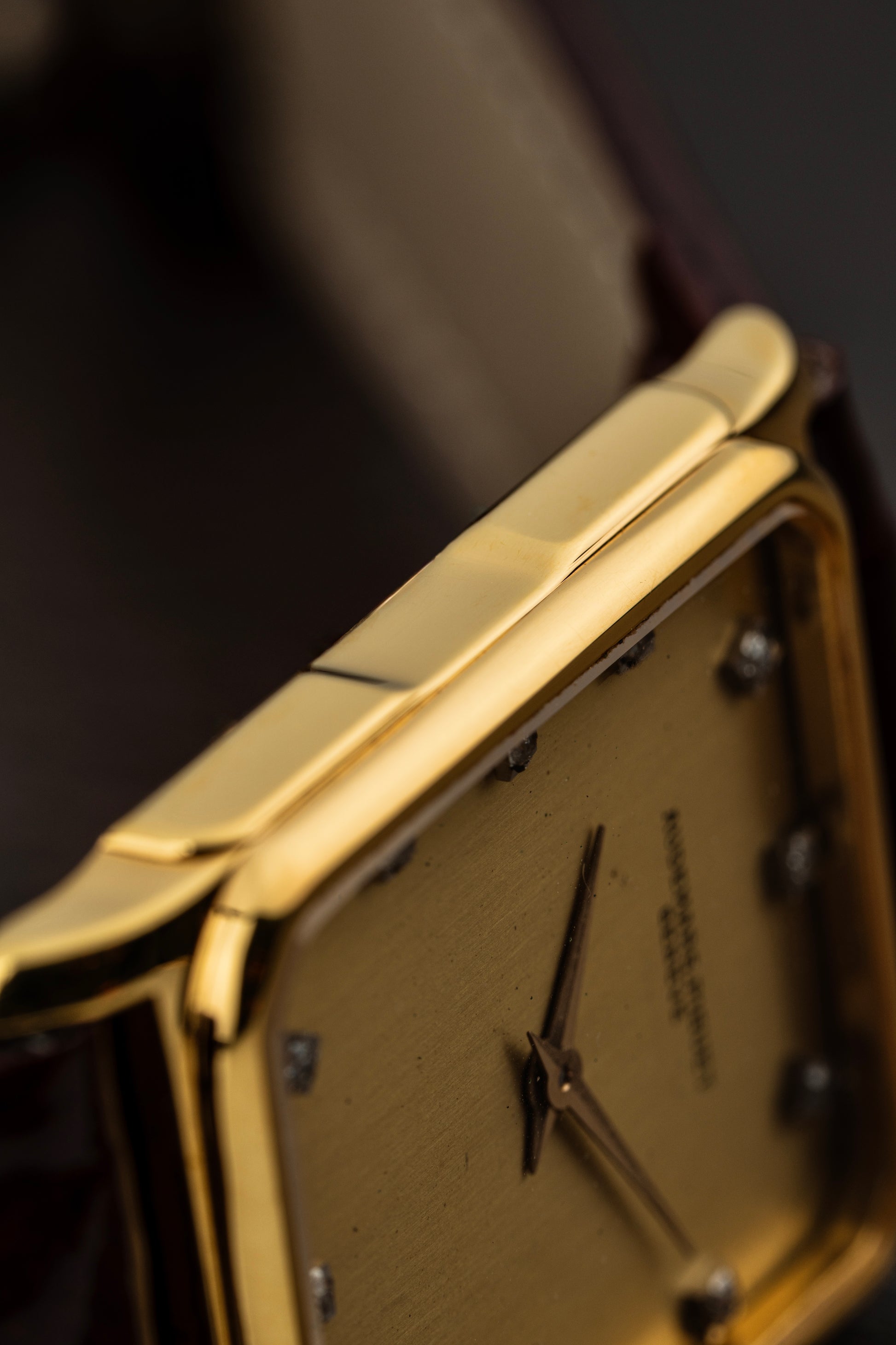 The rectangular 18k yellow gold case exudes vintage charm, with clean lines and a polished finish that highlights its refined geometry. Measuring elegantly on the wrist, the case is complemented by a finely knurled crown, adding a touch of detail to the otherwise minimalist design.