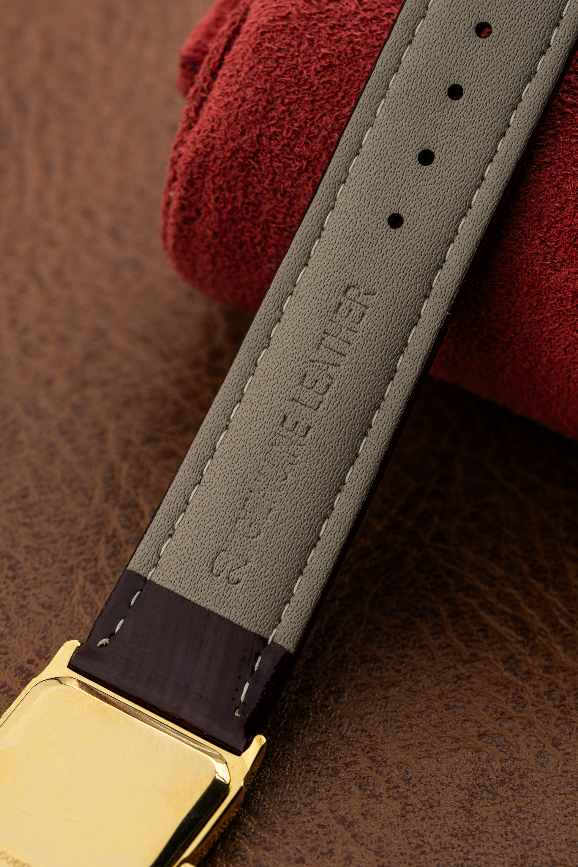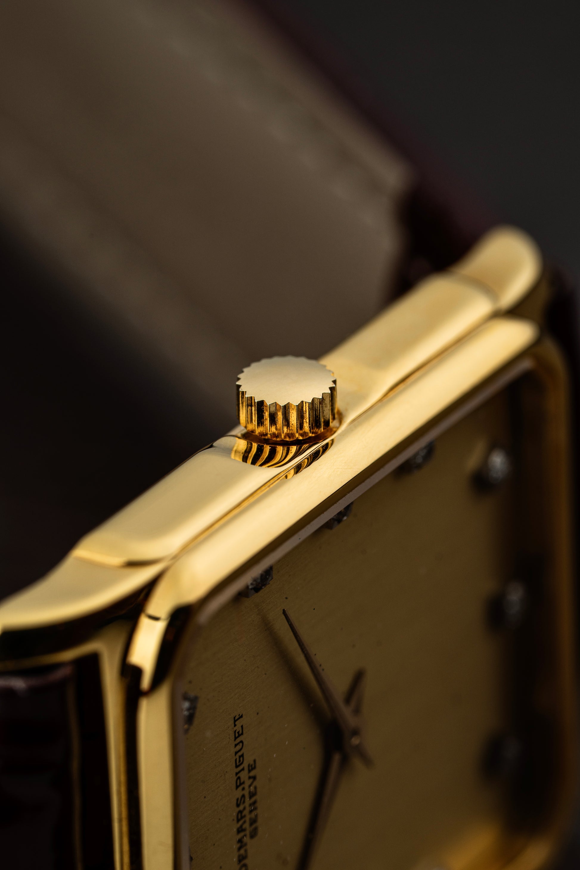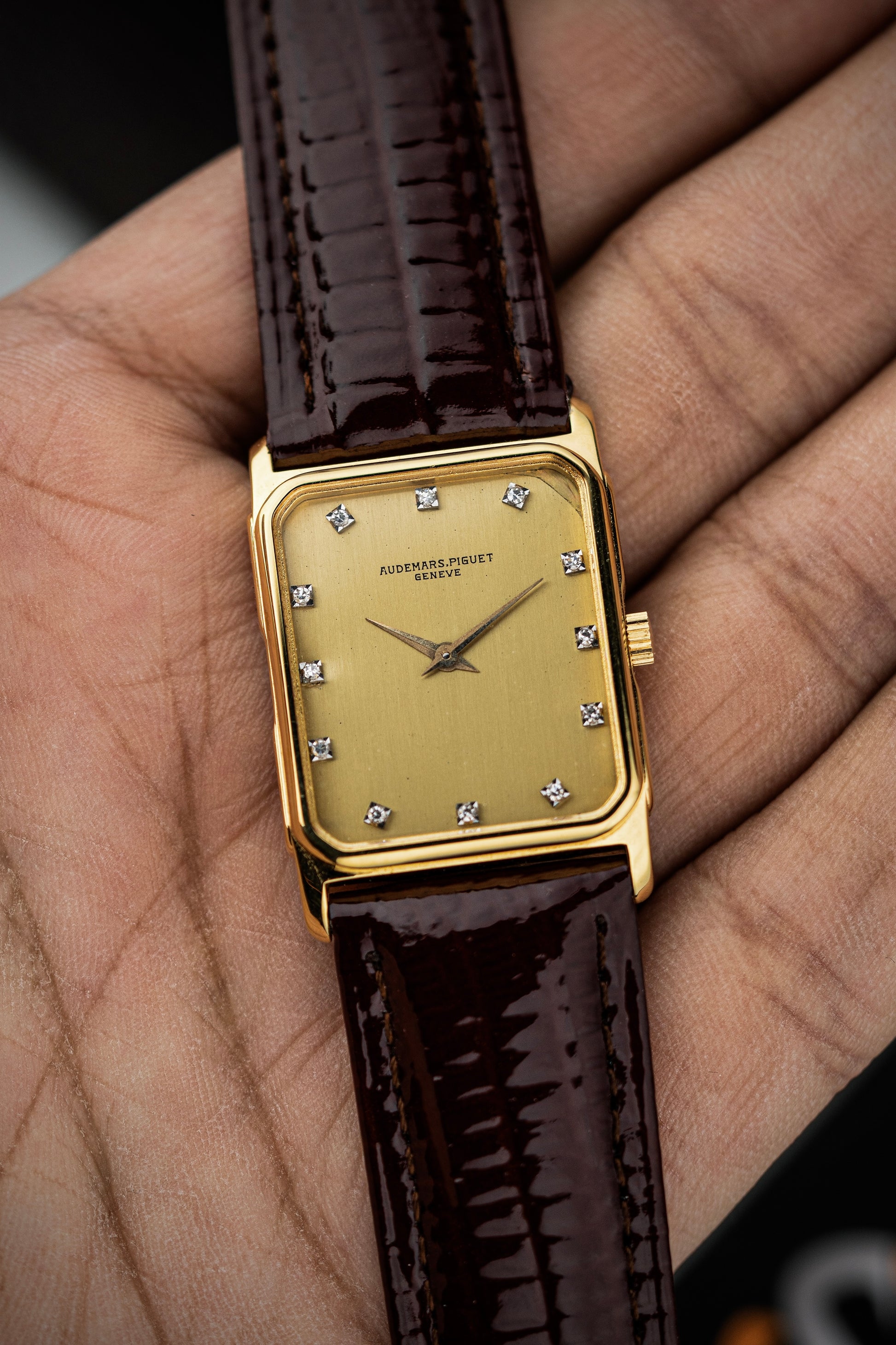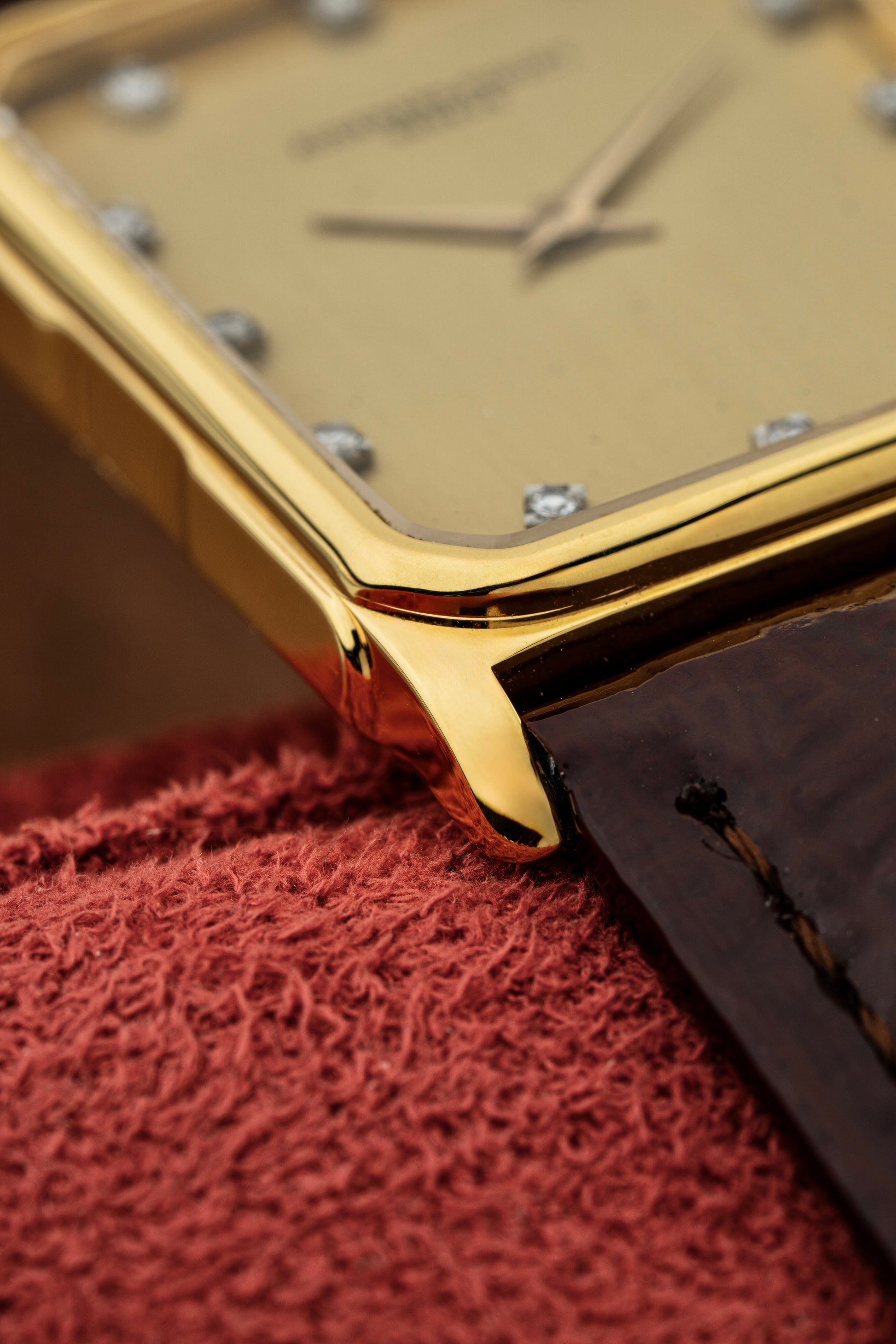 The rectangular 18k yellow gold case exudes vintage charm, with clean lines and a polished finish that highlights its refined geometry. Measuring elegantly on the wrist, the case is complemented by a finely knurled crown, adding a touch of detail to the otherwise minimalist design.