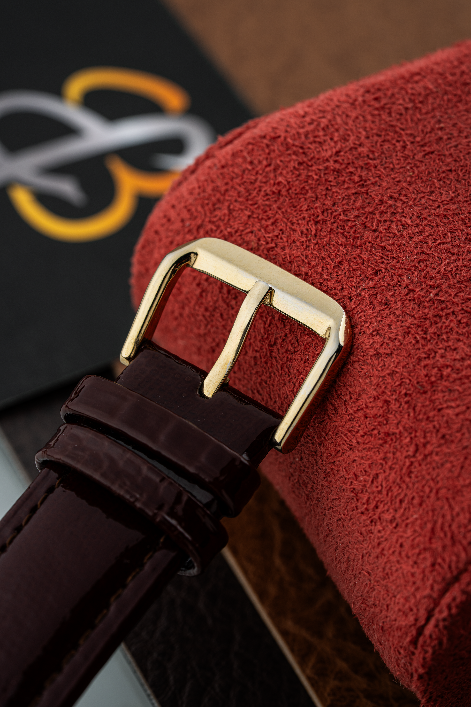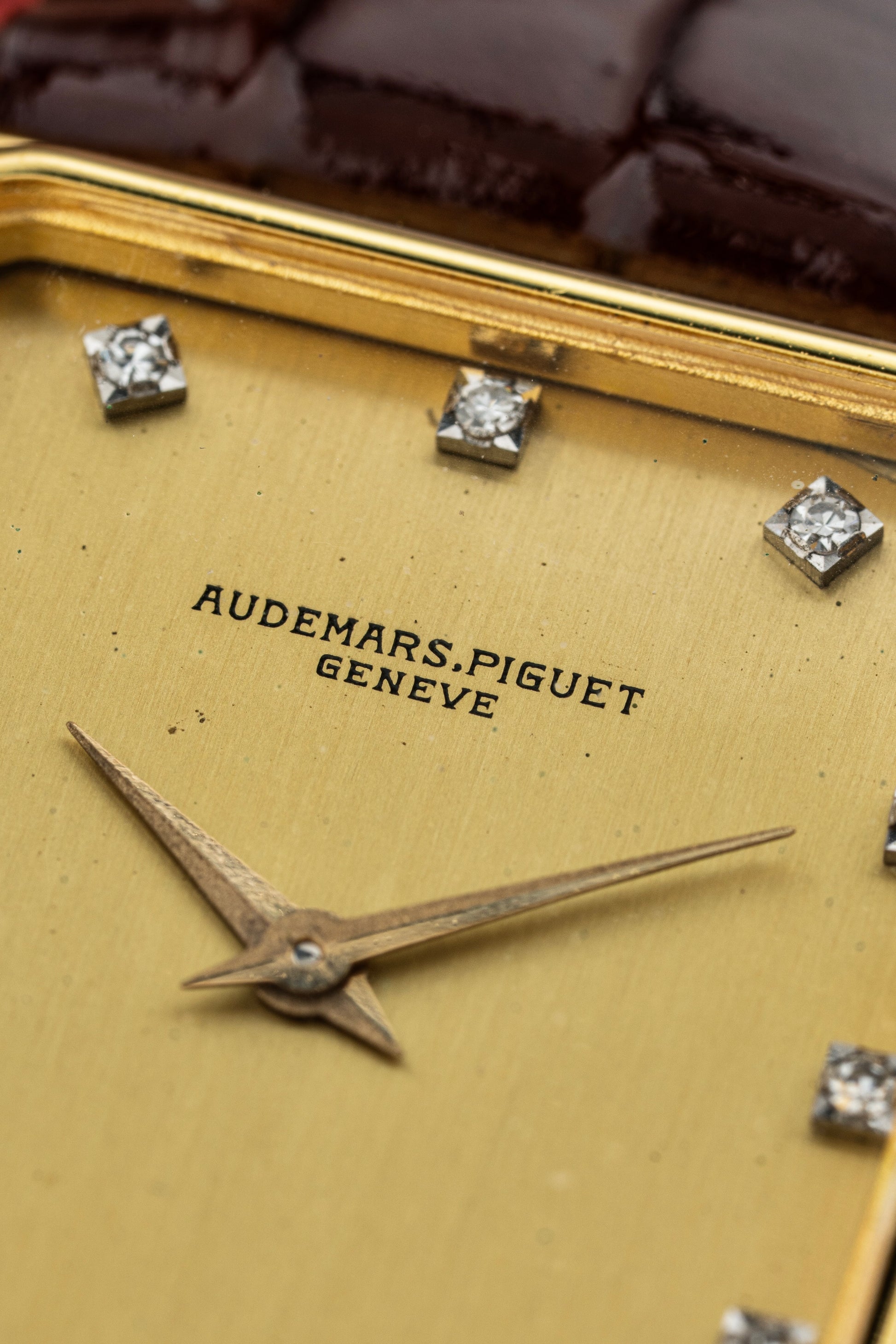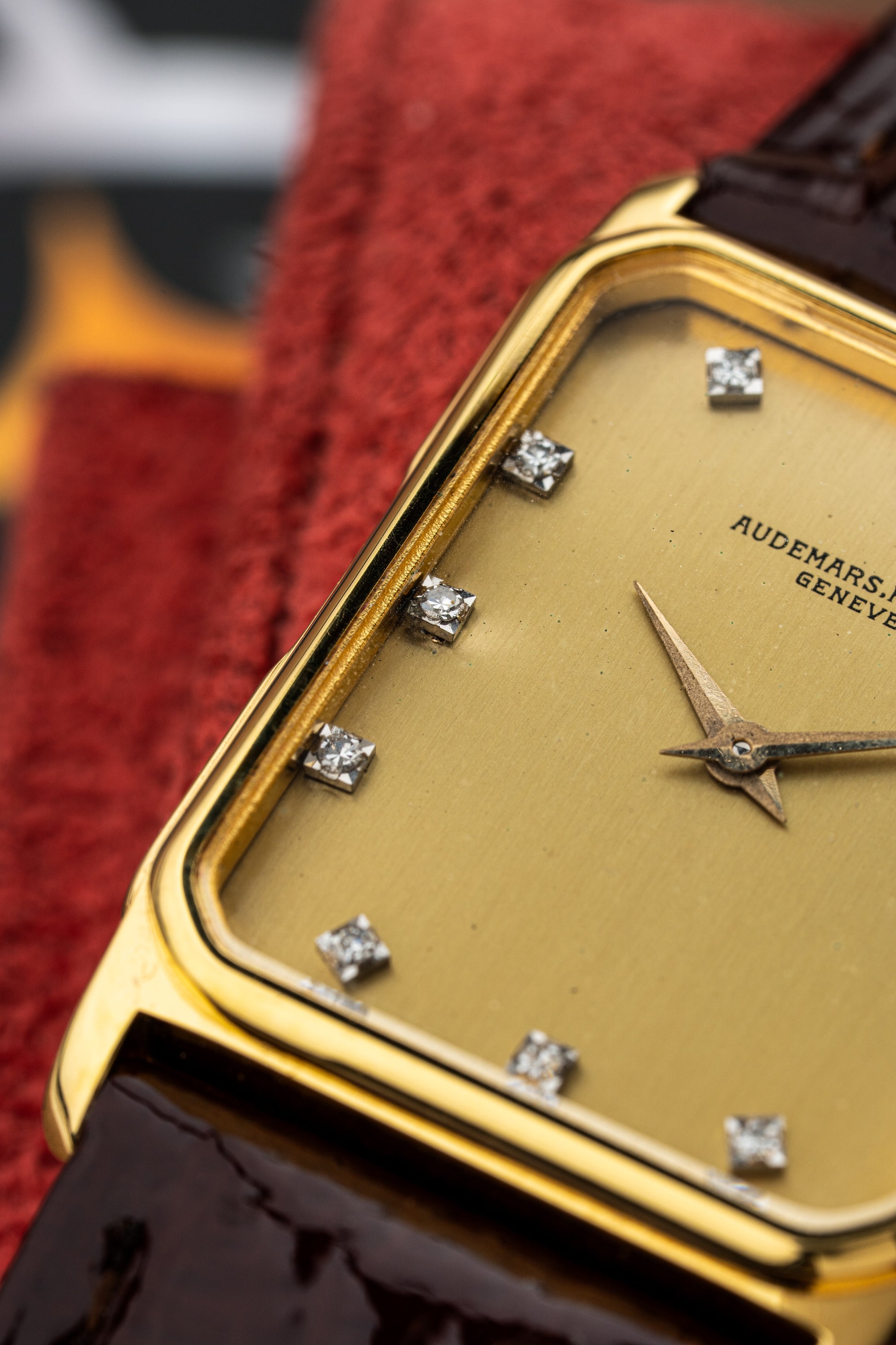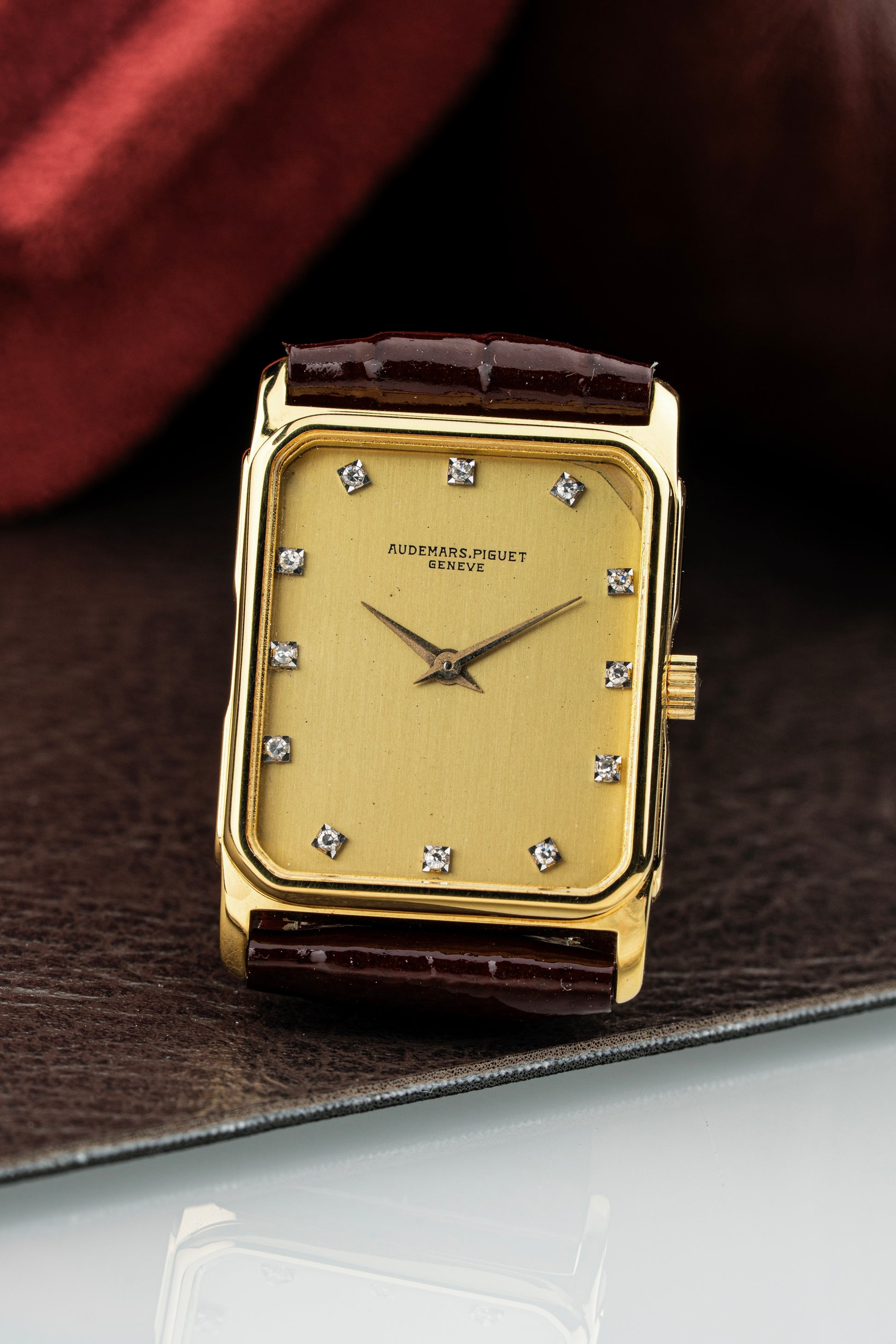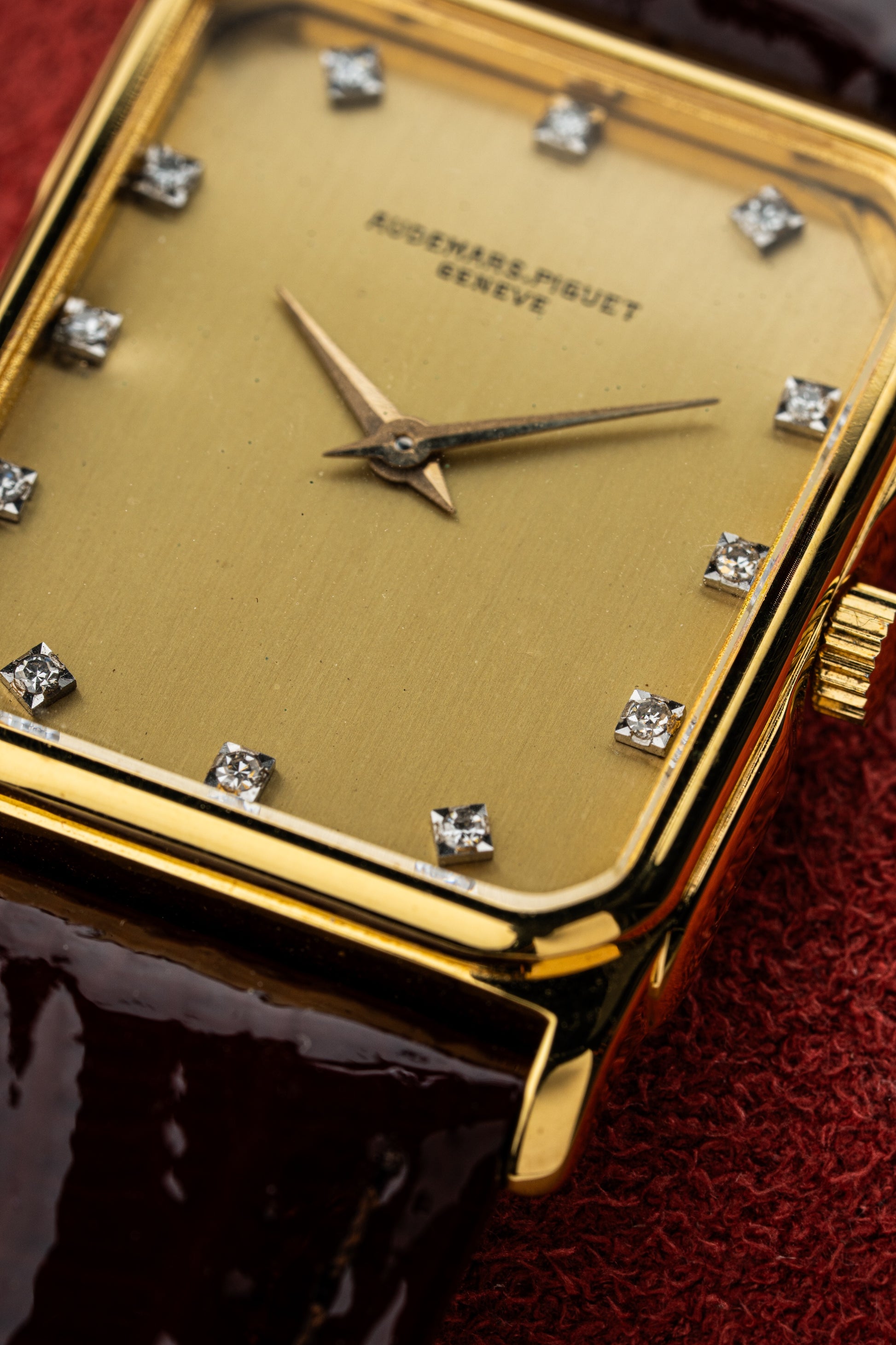 The rectangular 18k yellow gold case exudes vintage charm, with clean lines and a polished finish that highlights its refined geometry. Measuring elegantly on the wrist, the case is complemented by a finely knurled crown, adding a touch of detail to the otherwise minimalist design.