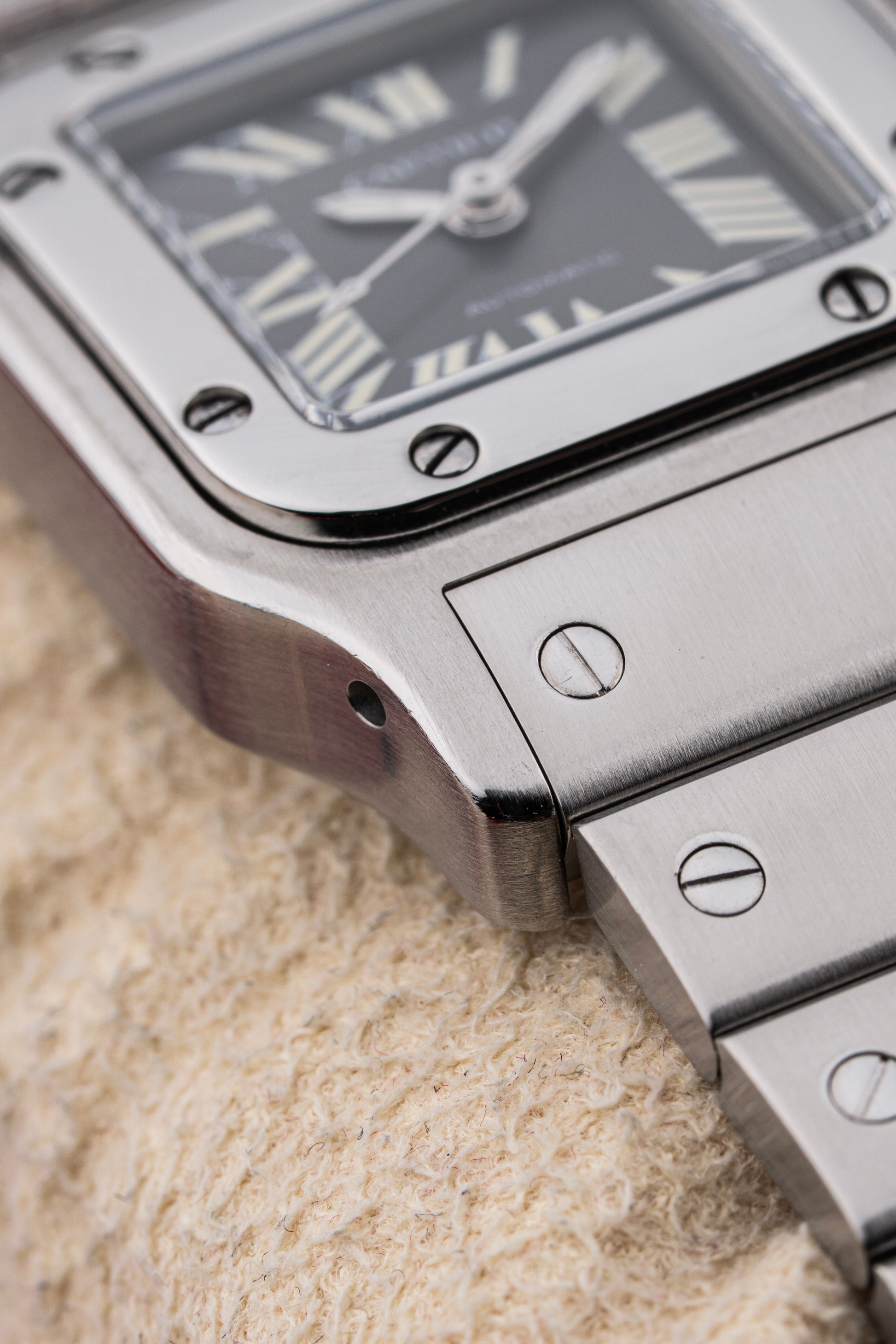 The stainless steel case measures 24 mm in diameter. Its square bezel with eight exposed screws is instantly recognizable and one of the defining elements of the Santos.