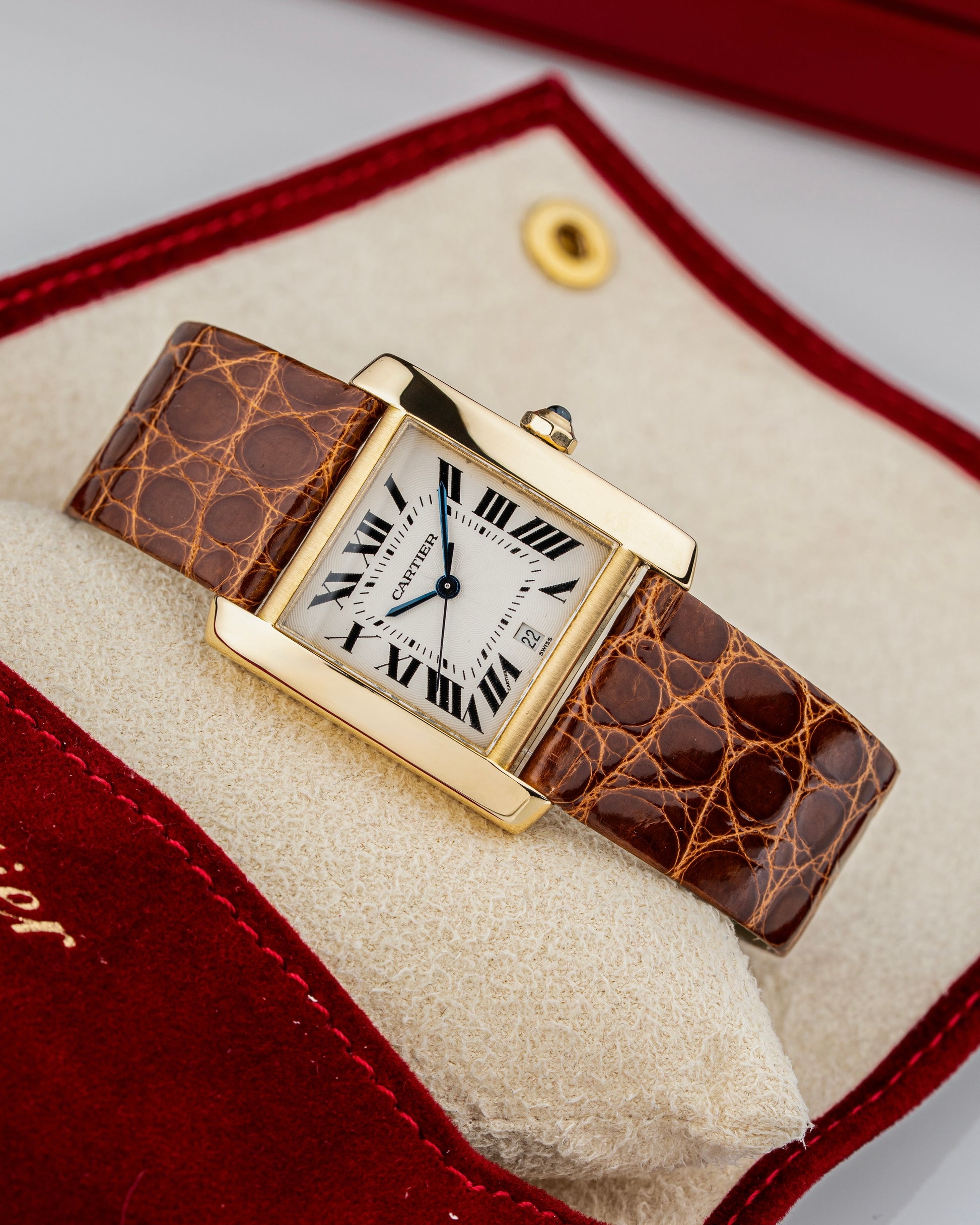 The watch showcases a classic silvered guilloché dial, adorned with bold black Roman numerals and blued steel hands—Cartier signatures that strike the perfect balance between refinement and legibility. The textured dial adds depth and character, ensuring the Tank remains both understated and visually engaging on the wrist.
