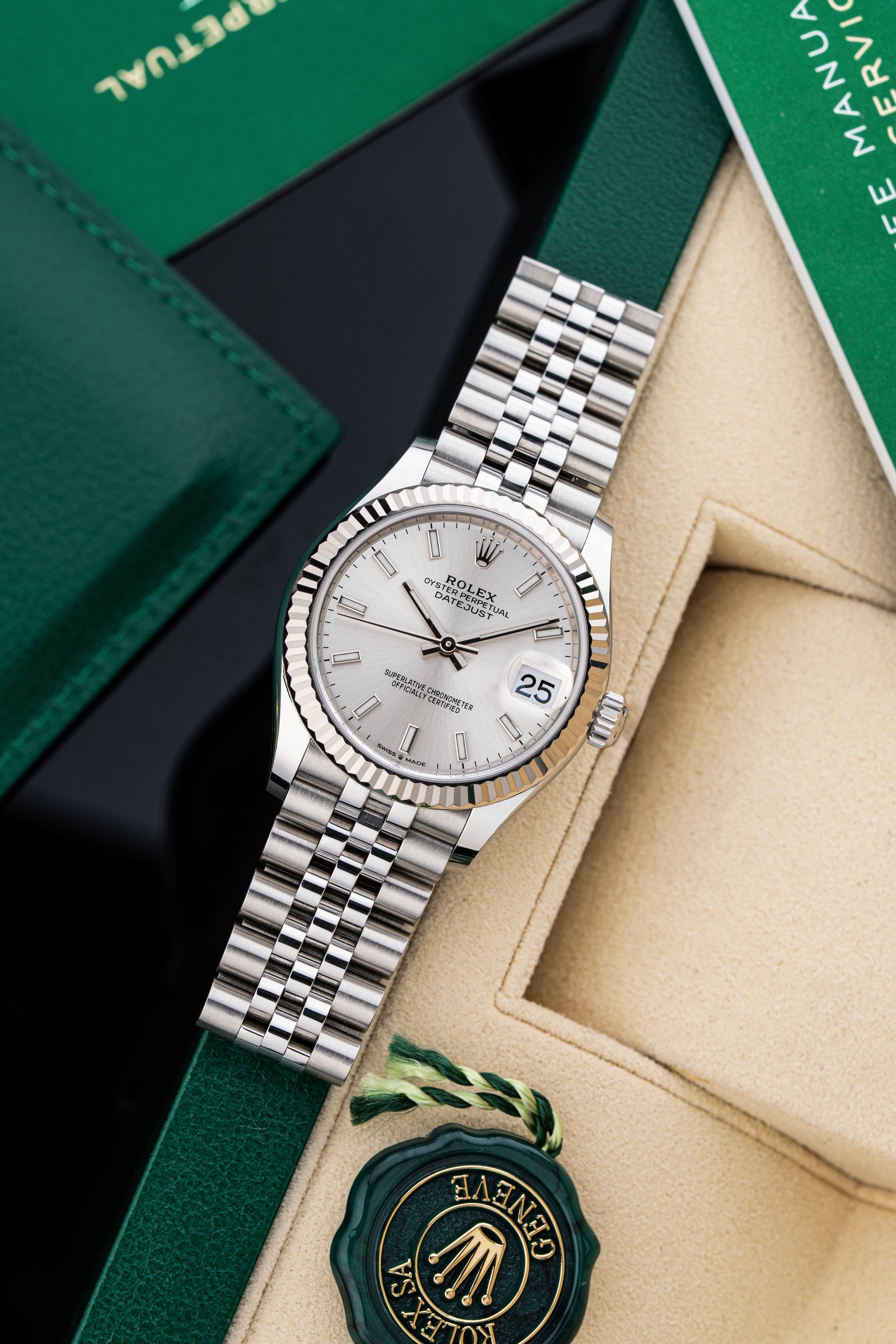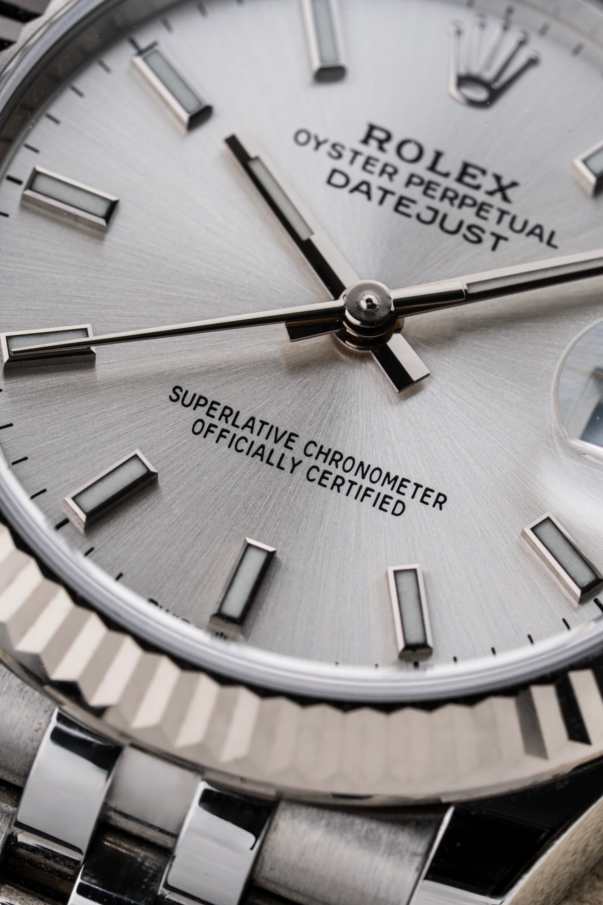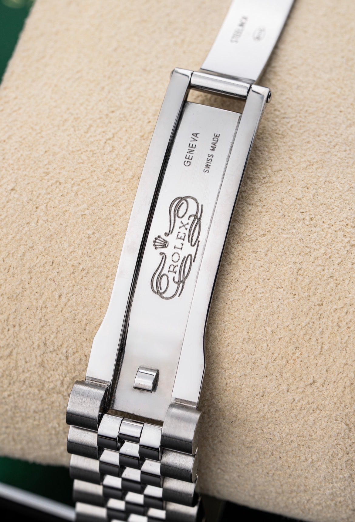 Fitted with a Rolex Jubilee bracelet in stainless steel, featuring a concealed Crownclasp for a seamless and elegant finish. The hidden clasp enhances the refined aesthetic of the bracelet and contributes to the watch’s sleek, dressy profile while maintaining everyday comfort.