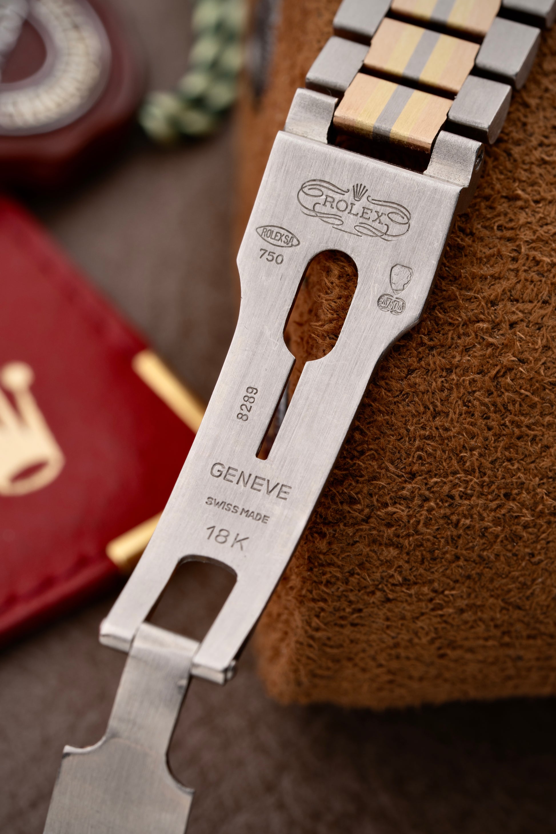 The mid-size 31mm Oyster case is complemented by the original three-tone President bracelet, also crafted in 18k yellow, white, and rose gold. Its semi-circular three-link design provides both comfort and elegance on the wrist. The concealed Crownclasp ensures a seamless, uninterrupted appearance, highlighting the refined craftsmanship of the bracelet.