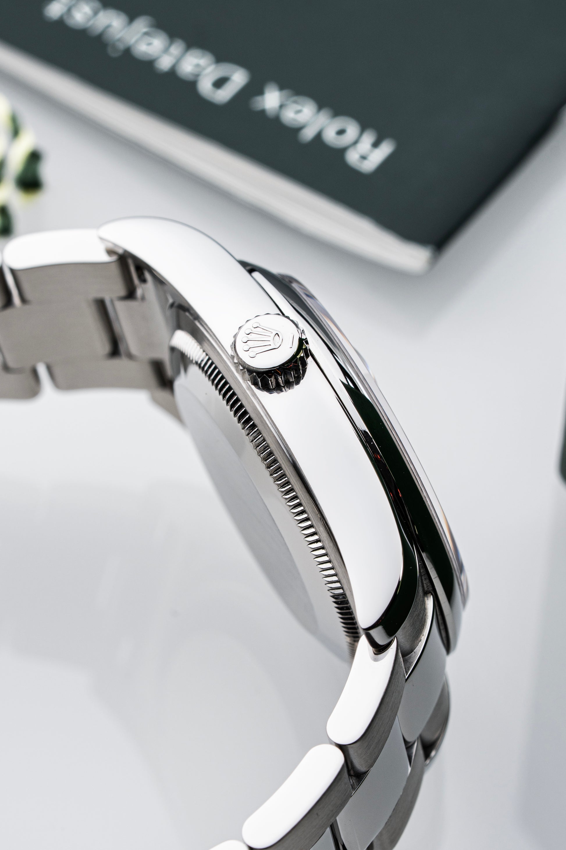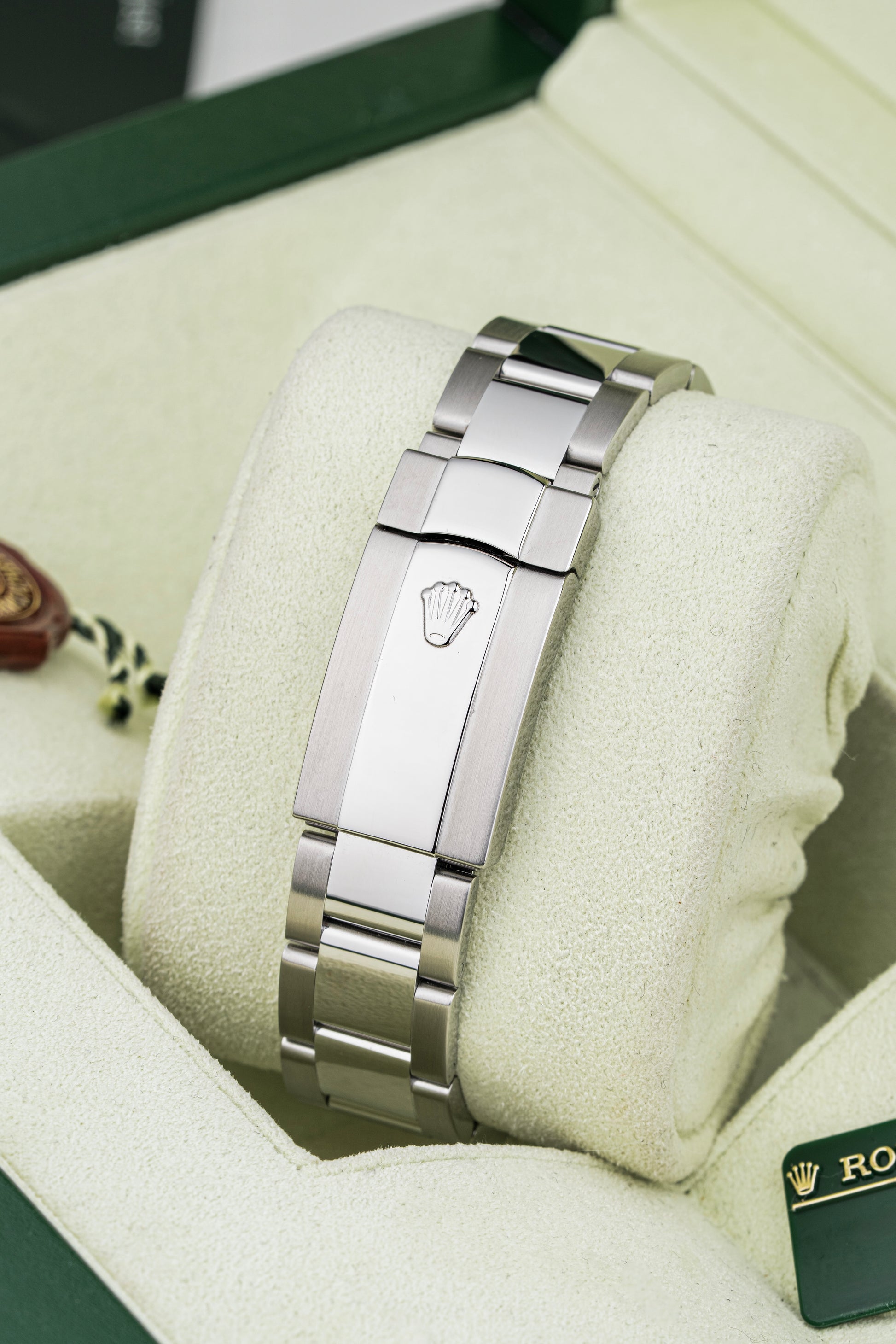 Fitted to the watch is a stainless steel Oyster bracelet, featuring solid links for improved durability and a secure Oysterclasp for everyday confidence and comfort.