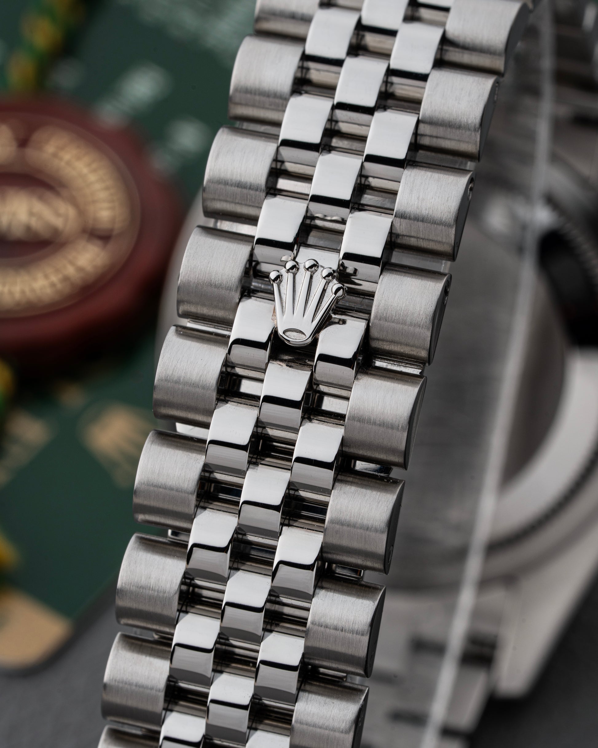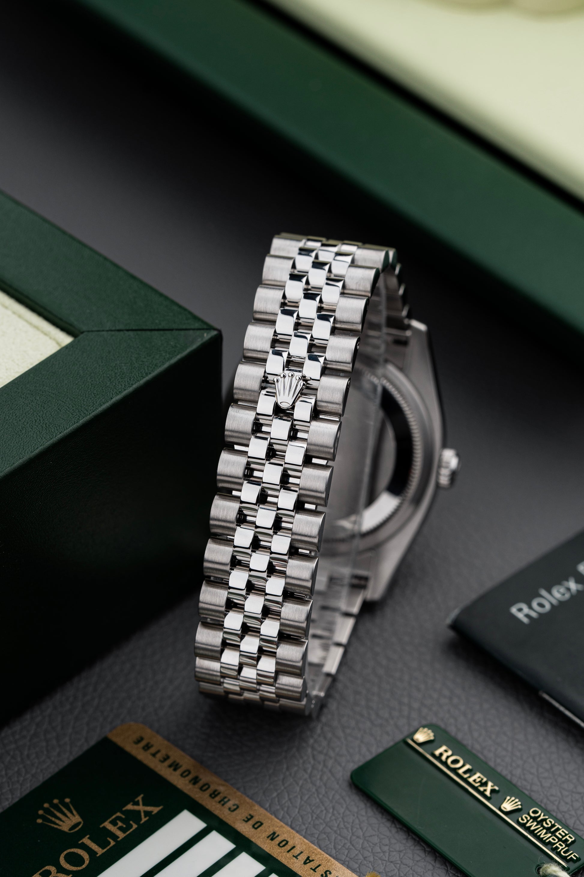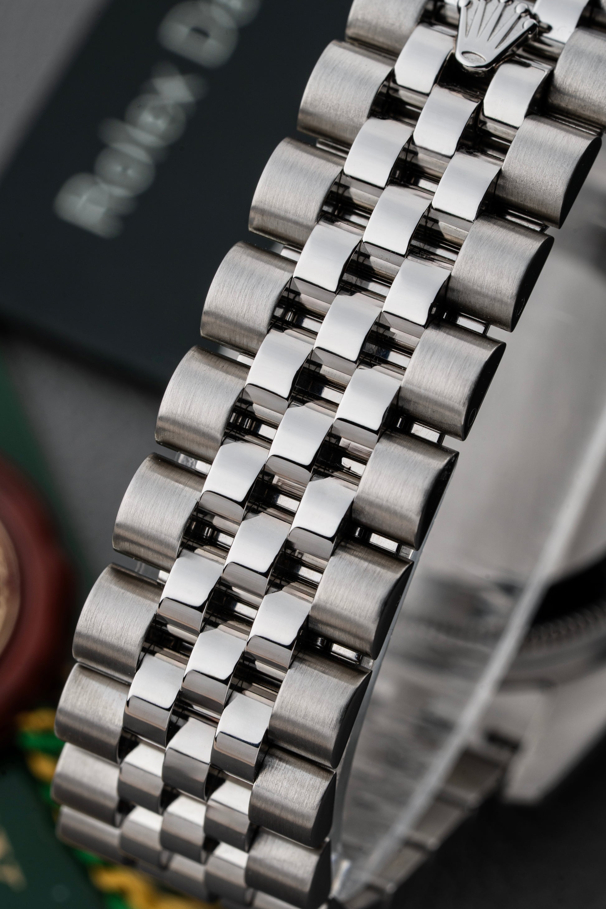 The oyster case is paired with a stainless steel jubilee bracelet. The bracelet features upgraded solid-links for a more robust feel and a concealed clasp, giving the watch a modern and sleek look.