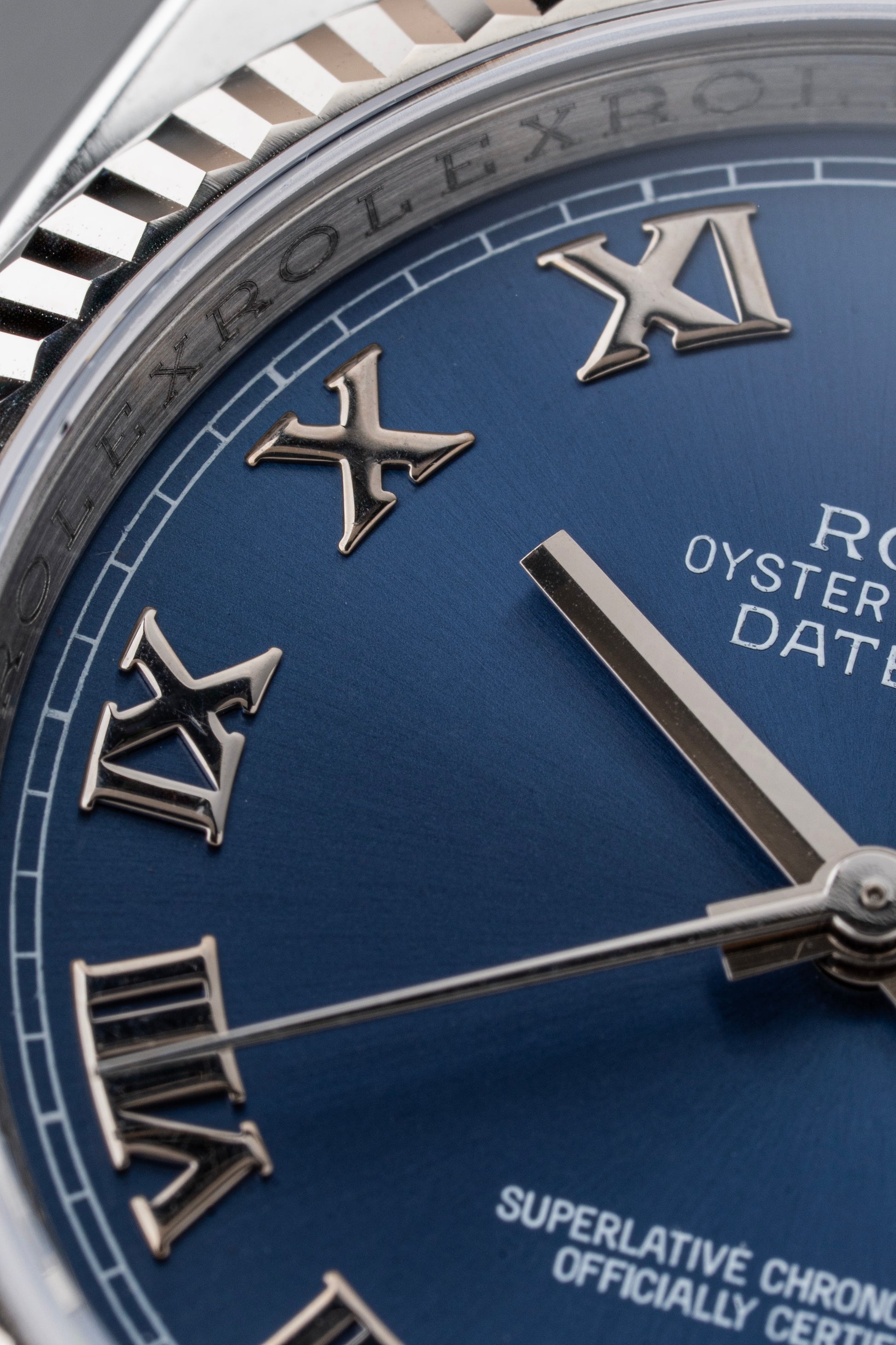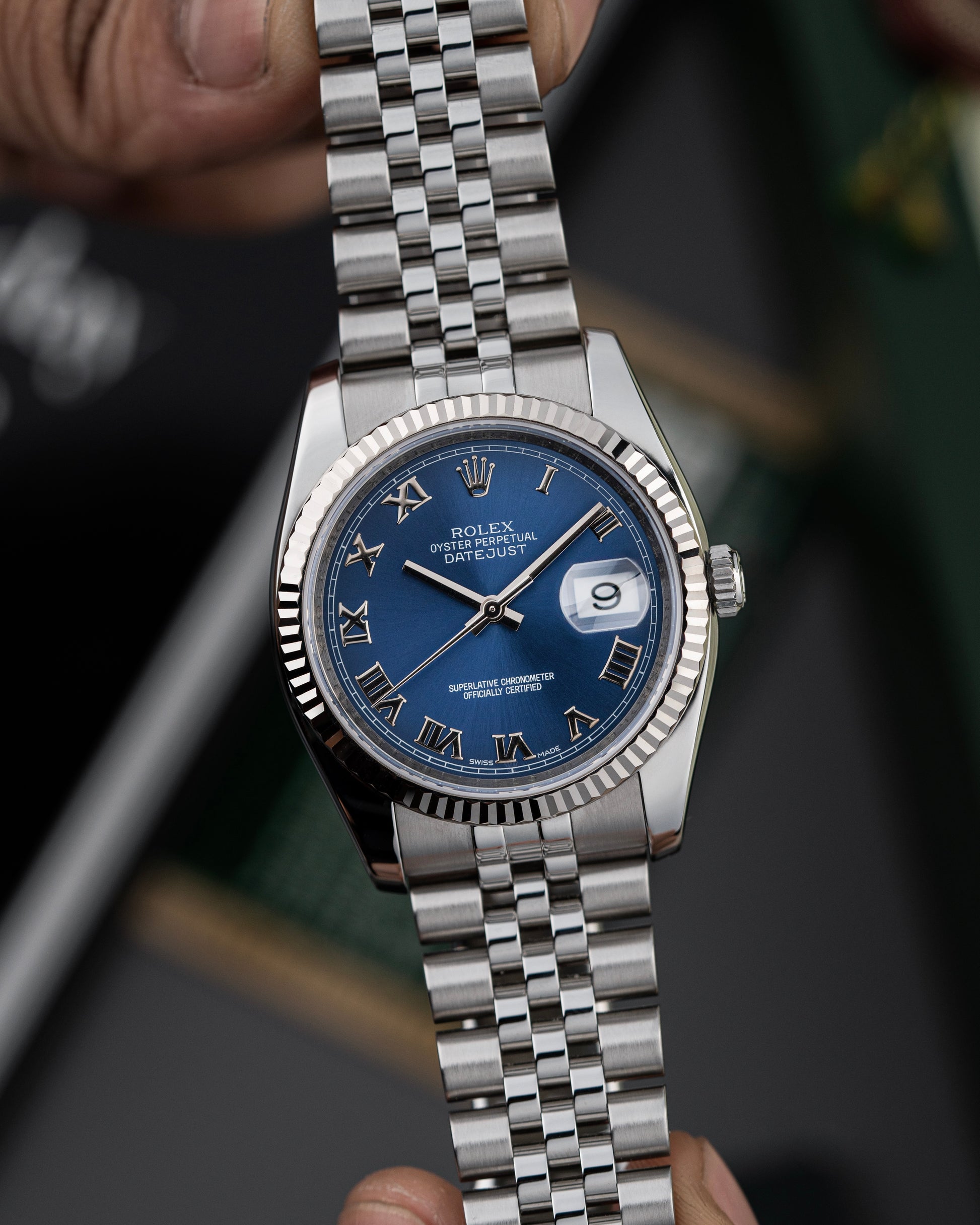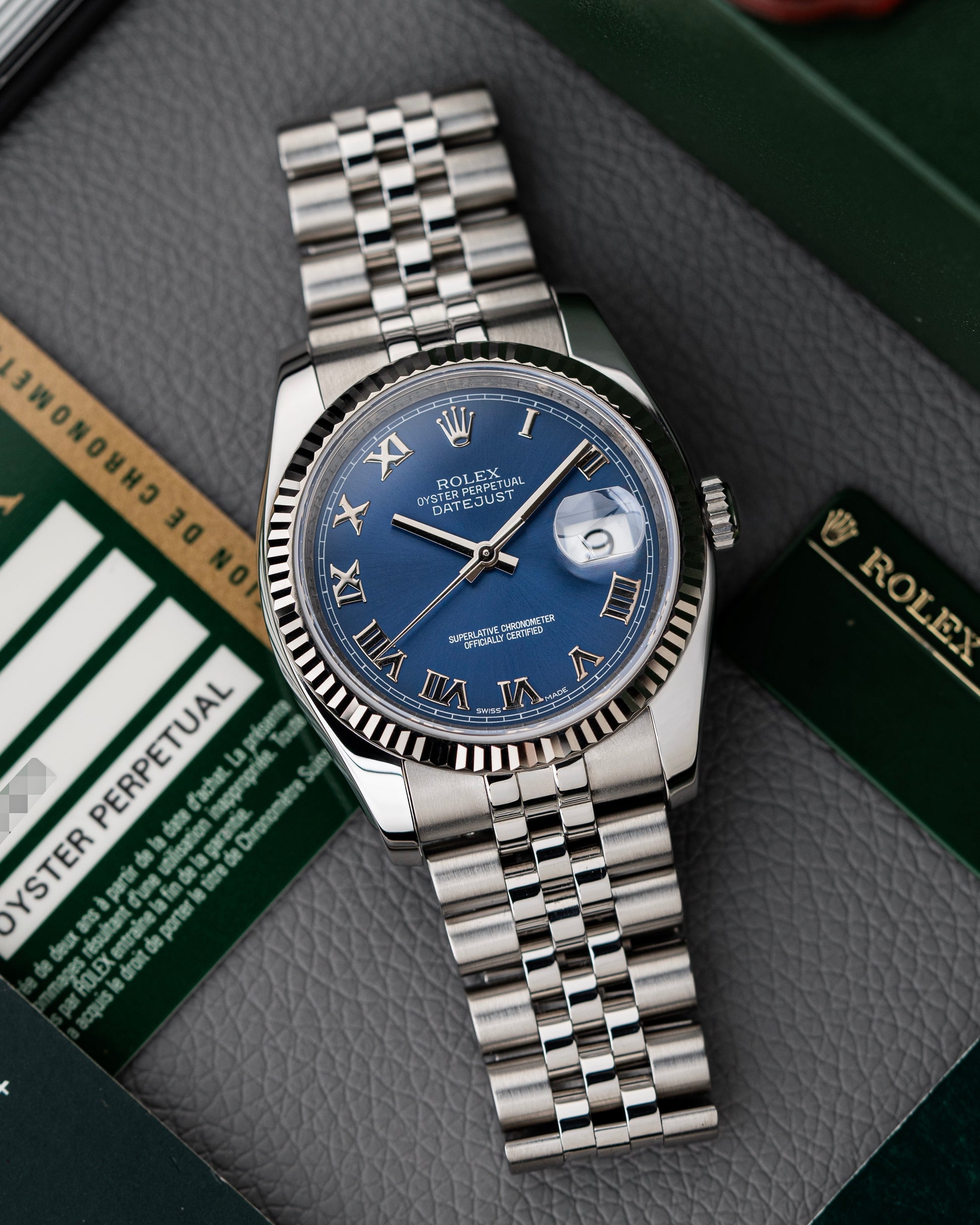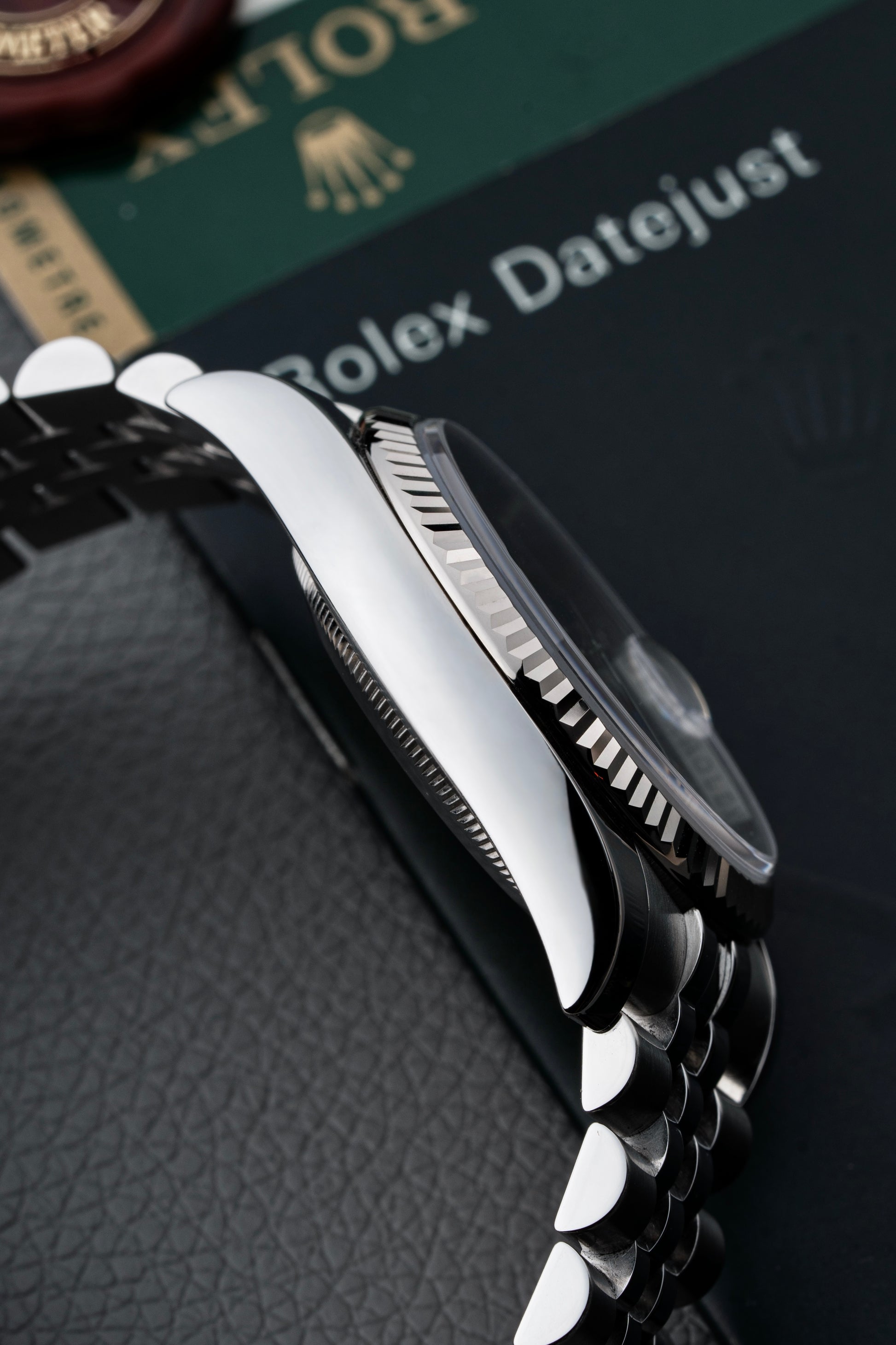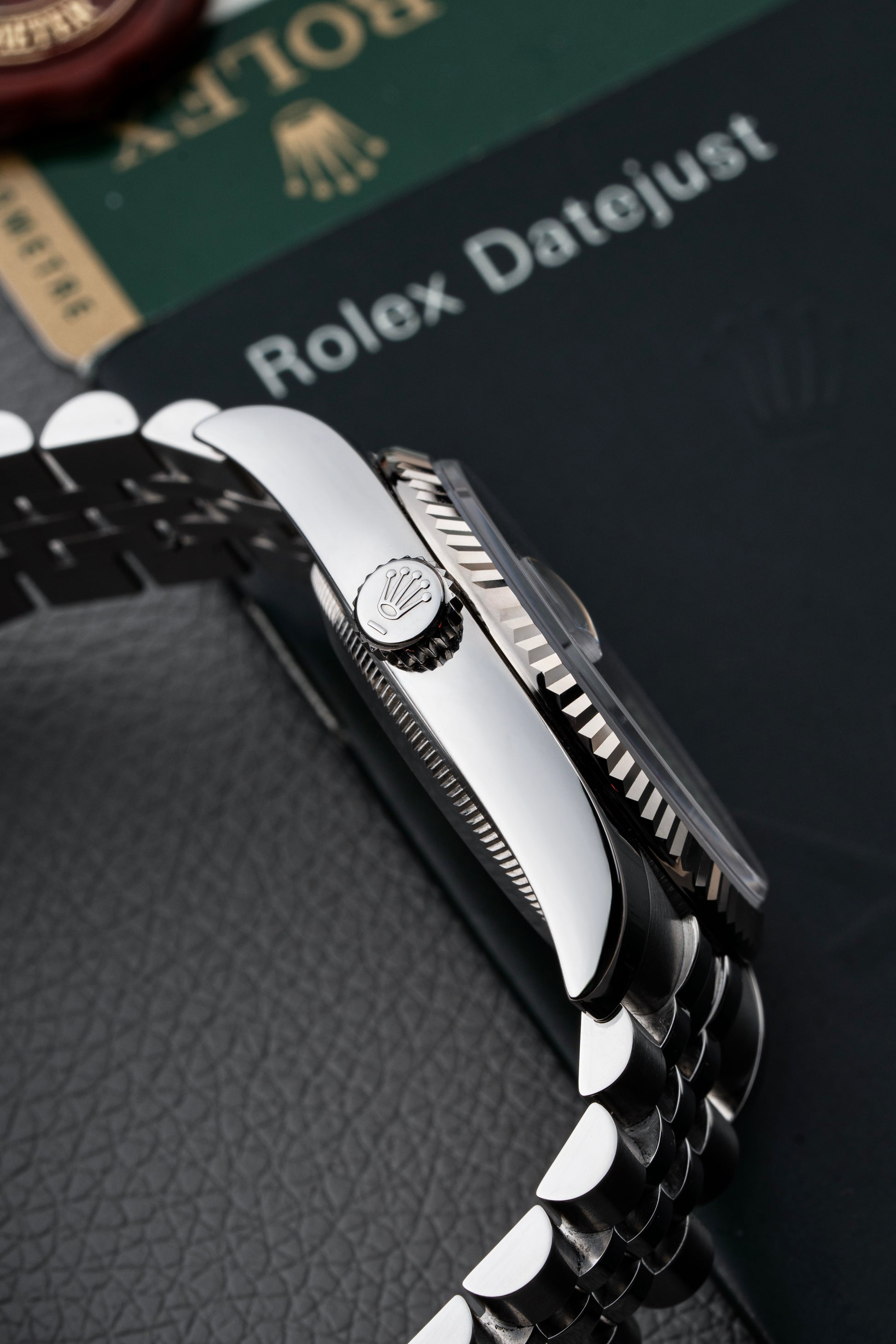 The 36mm stainless steel oyster case is fitted with a white gold fluted bezel. The fluted bezel is one of the Datejust's signature elements, contributing to its elegant and timeless look.