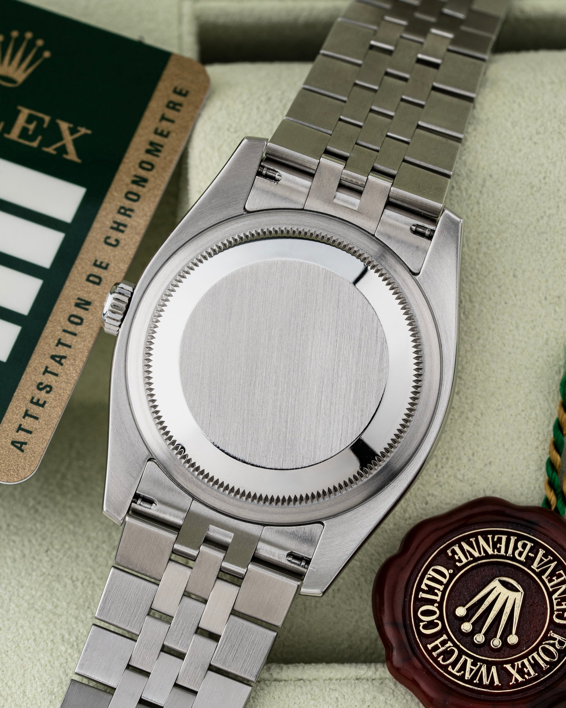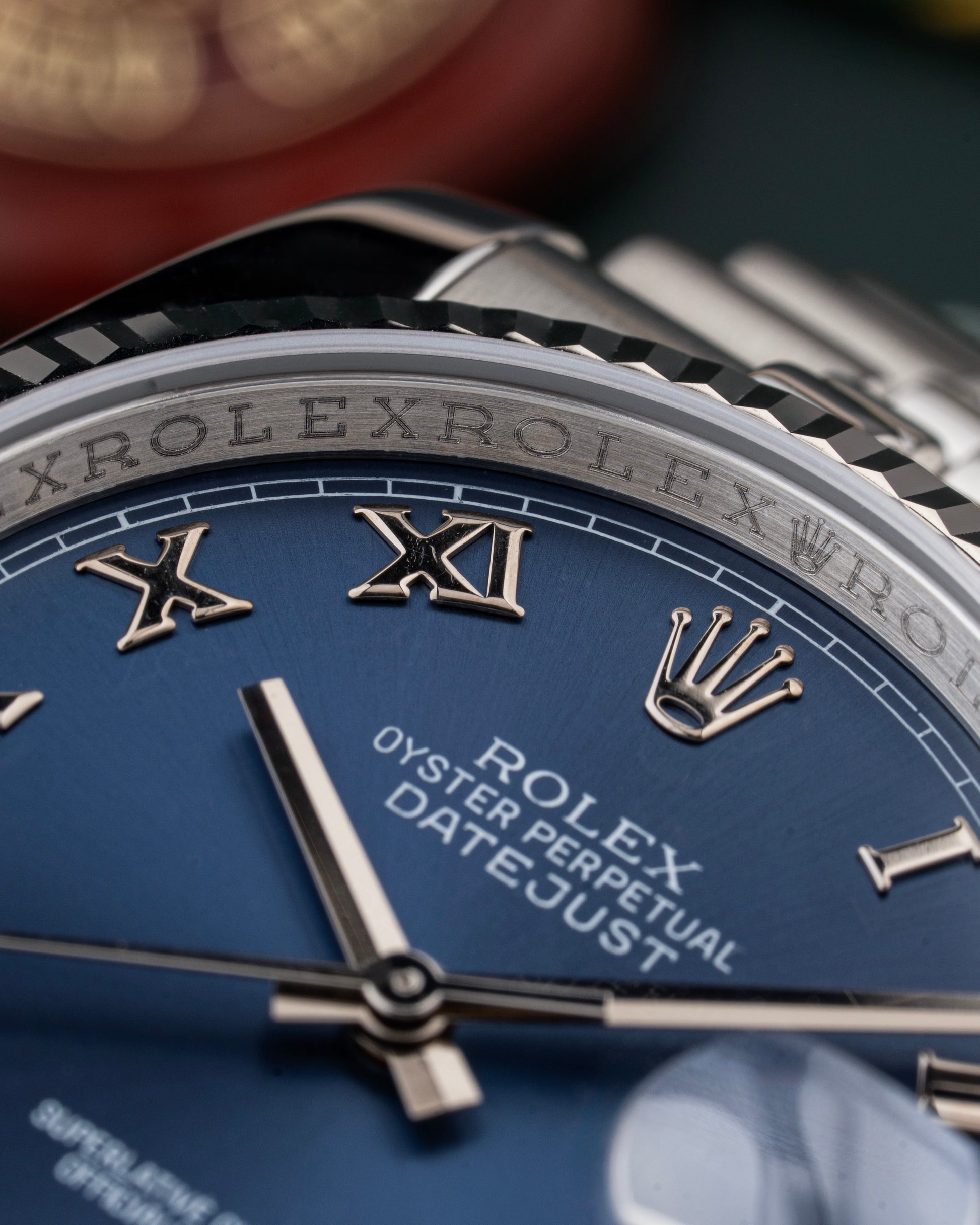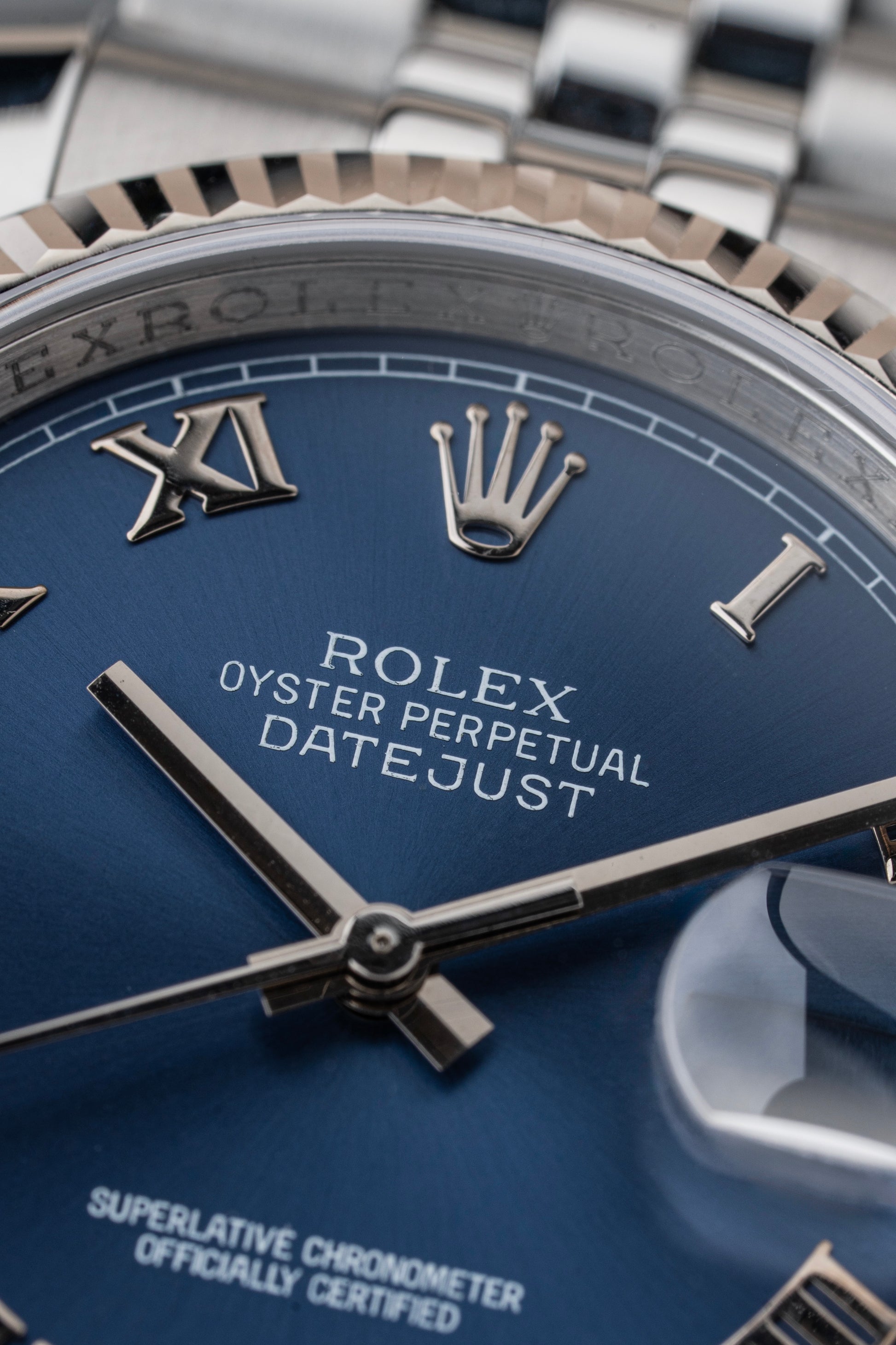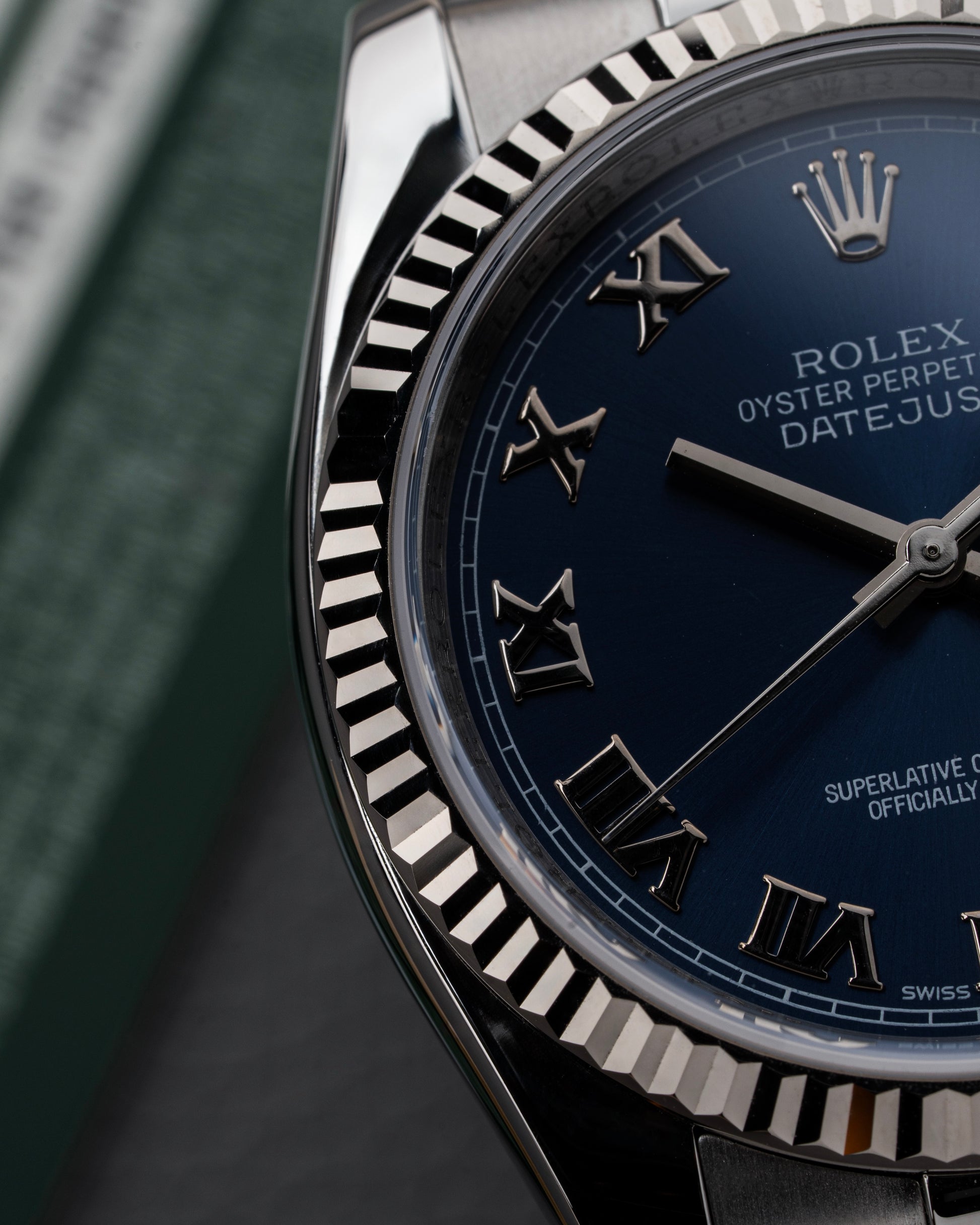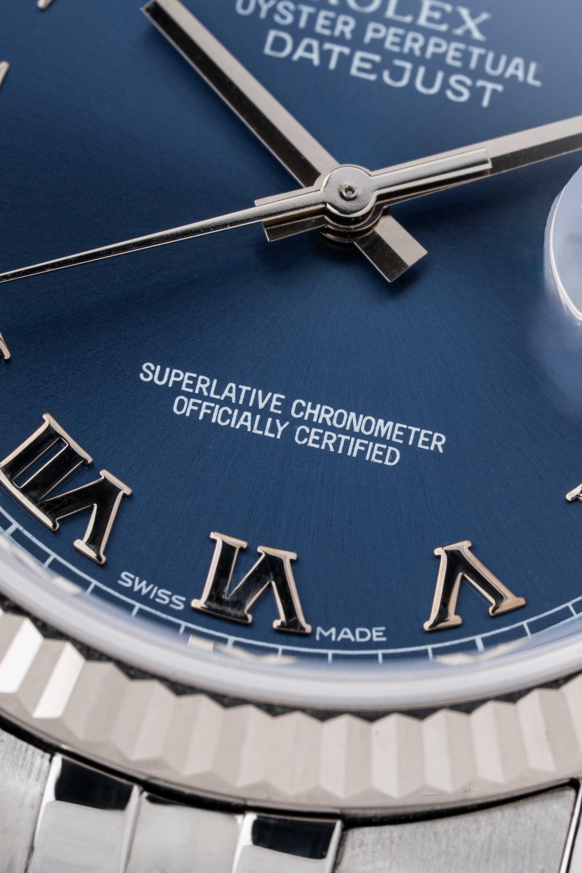 The 36mm stainless steel oyster case is fitted with a white gold fluted bezel. The fluted bezel is one of the Datejust's signature elements, contributing to its elegant and timeless look.