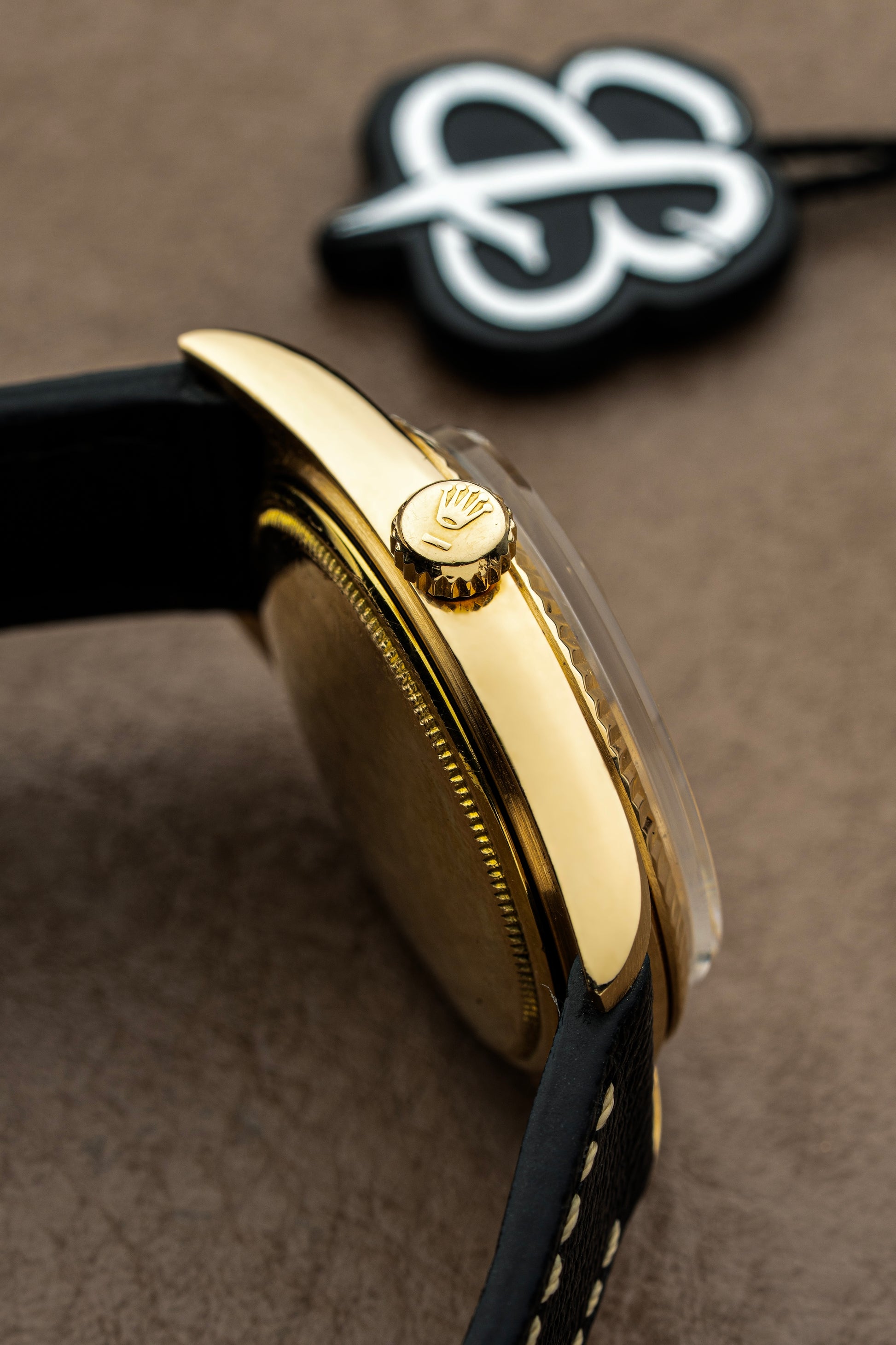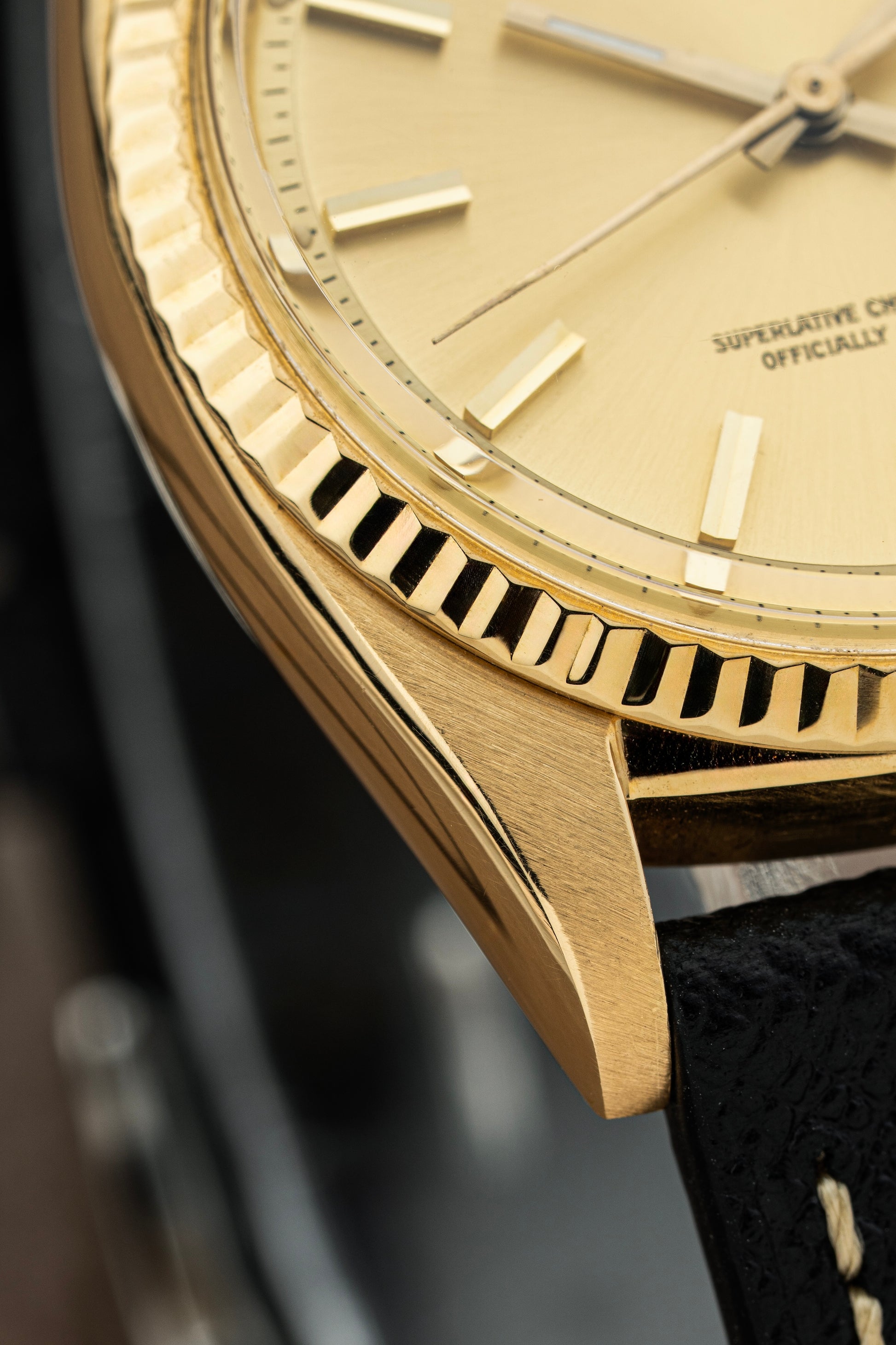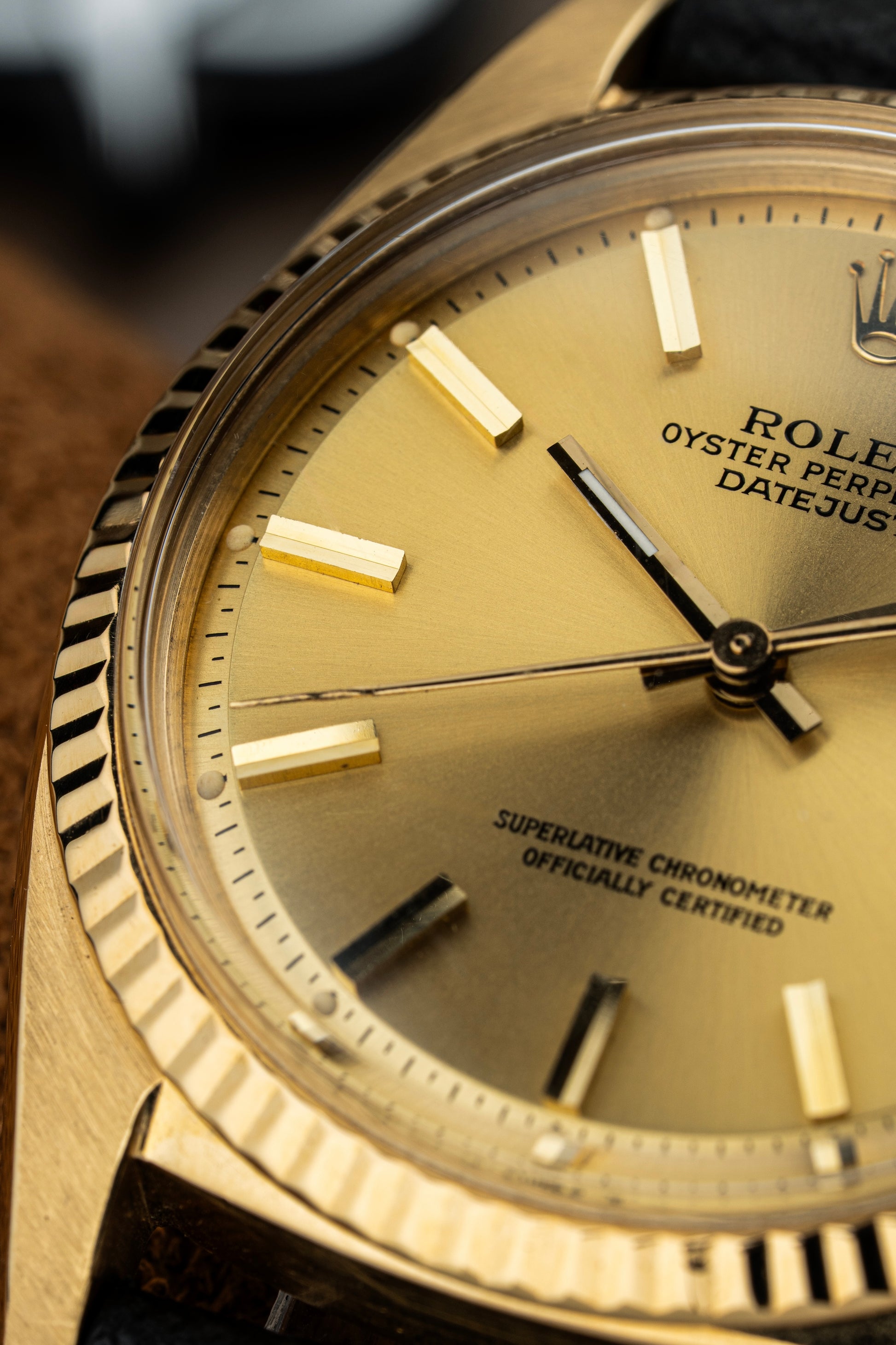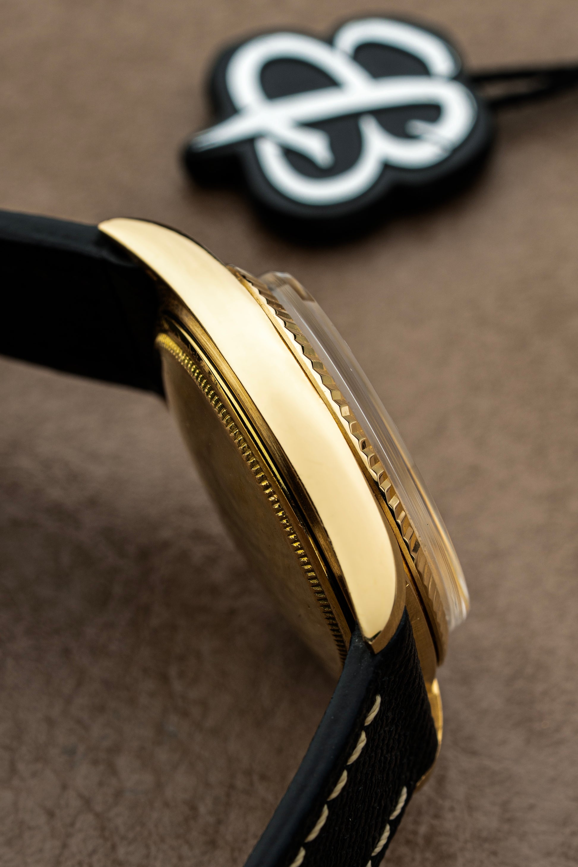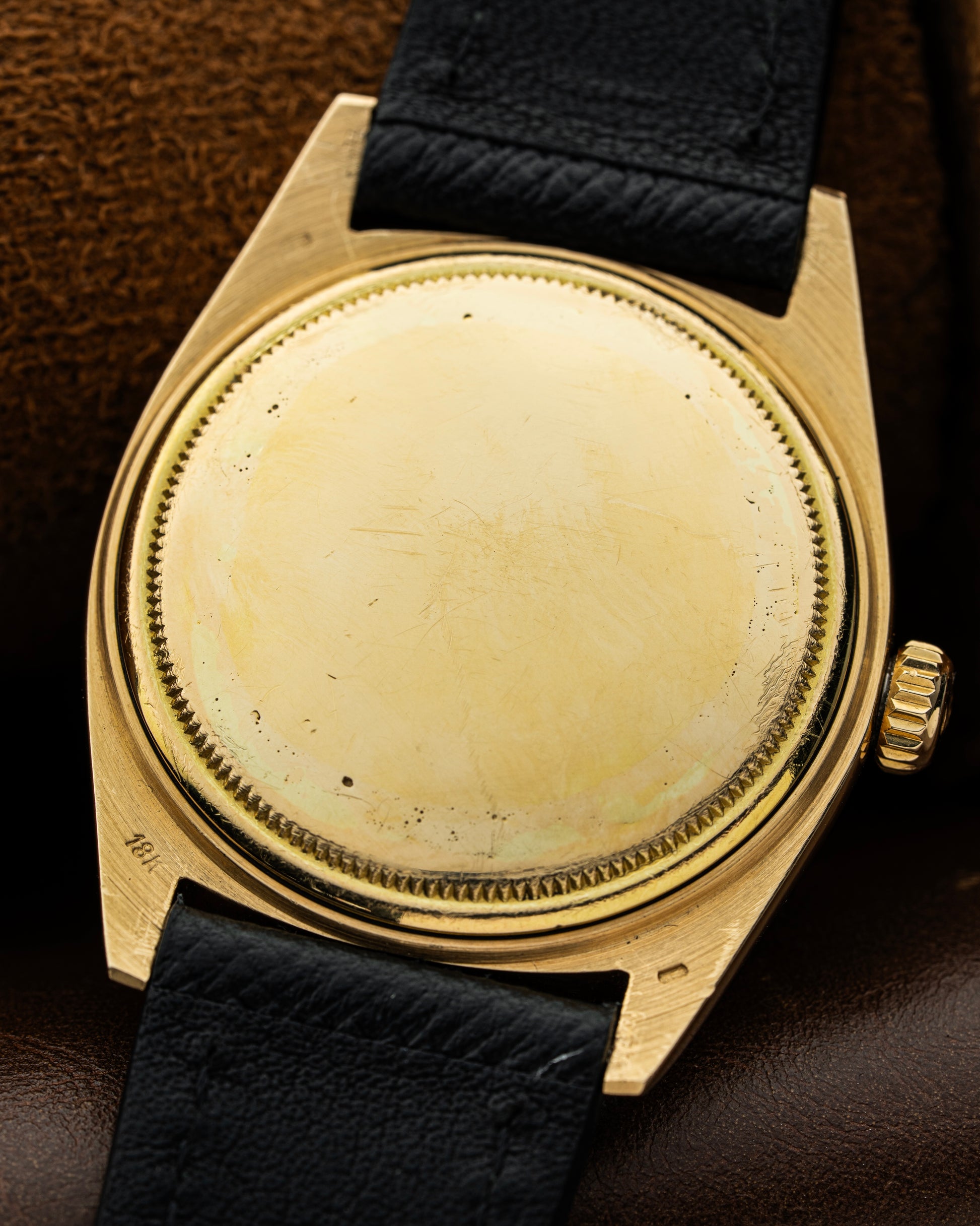 The 36mm case is crafted from solid 18k yellow gold, exuding warmth and understated luxury. It is complemented by the signature 18k fluted bezel, which plays beautifully with the light. The case remains in great condition, with only some light age-related pitting on the caseback, consistent with its vintage character and not detracting from overall appearance or functionality.