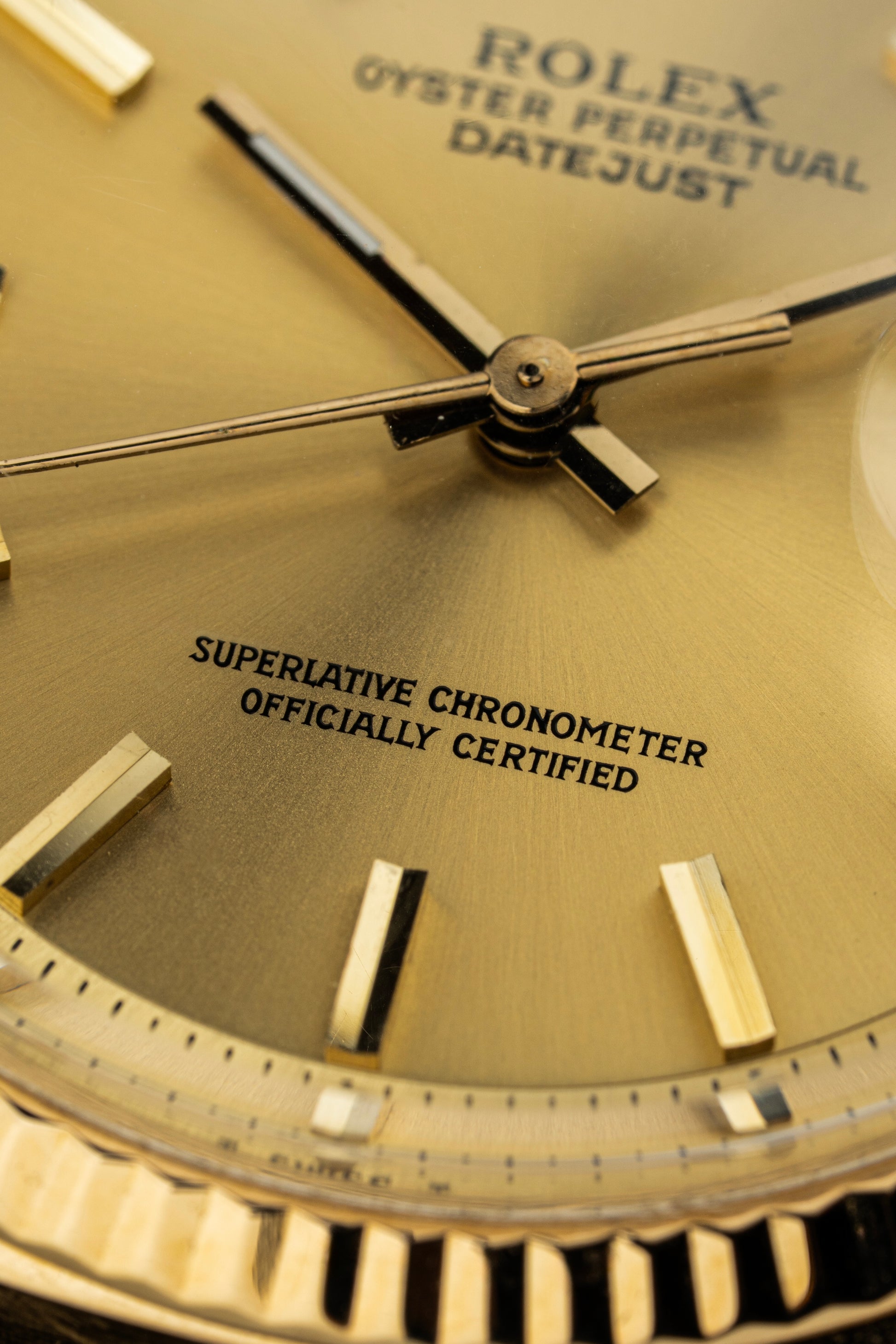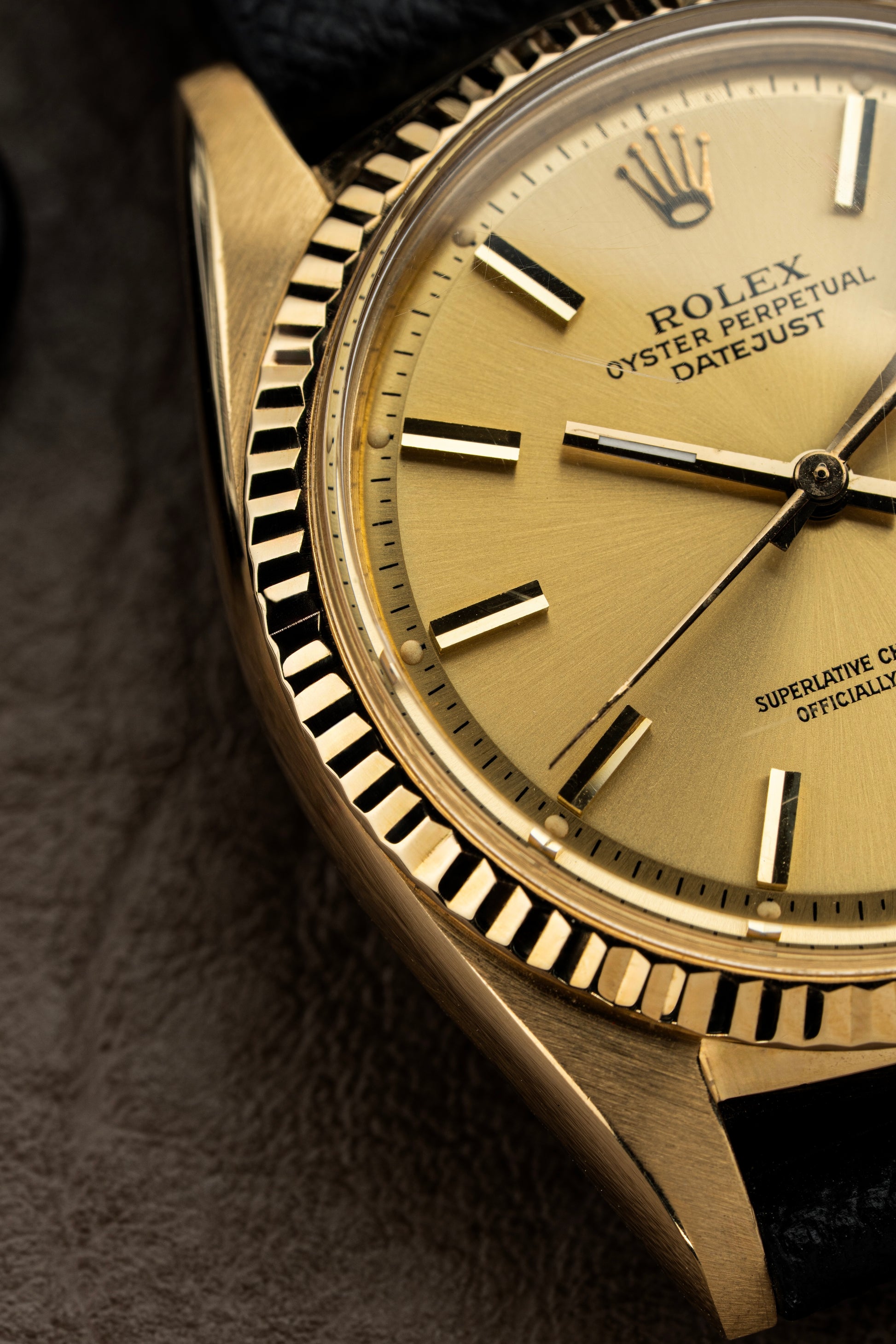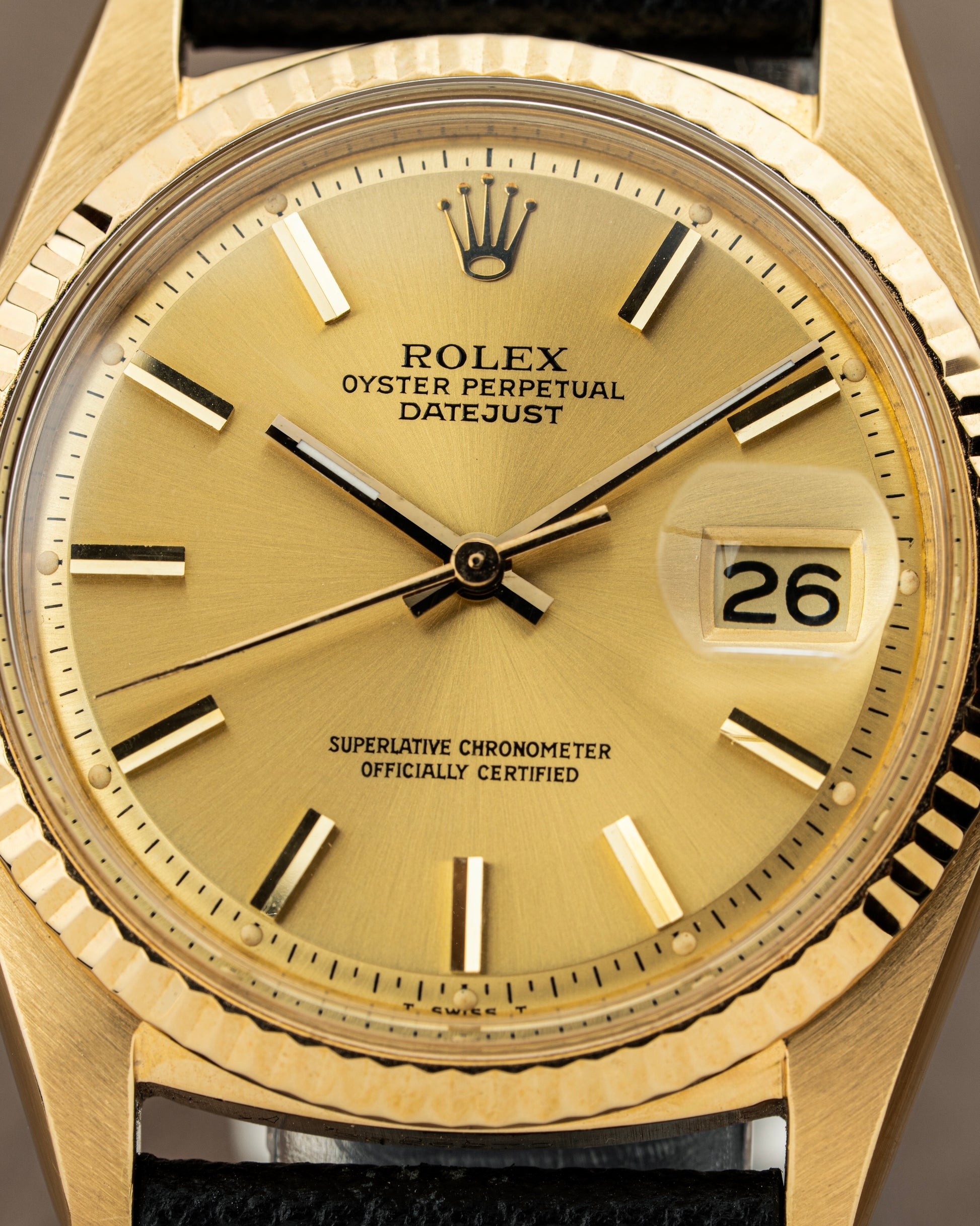 This example features a refined champagne pie-pan dial, accented by applied gold baton hour markers and matching gold hands. The dial retains excellent clarity and balance, with the date display at 3 o’clock magnified by the Cyclops lens on the acrylic crystal. The Rolex crown at 12 o’clock completes the classic and unmistakable Datejust aesthetic.