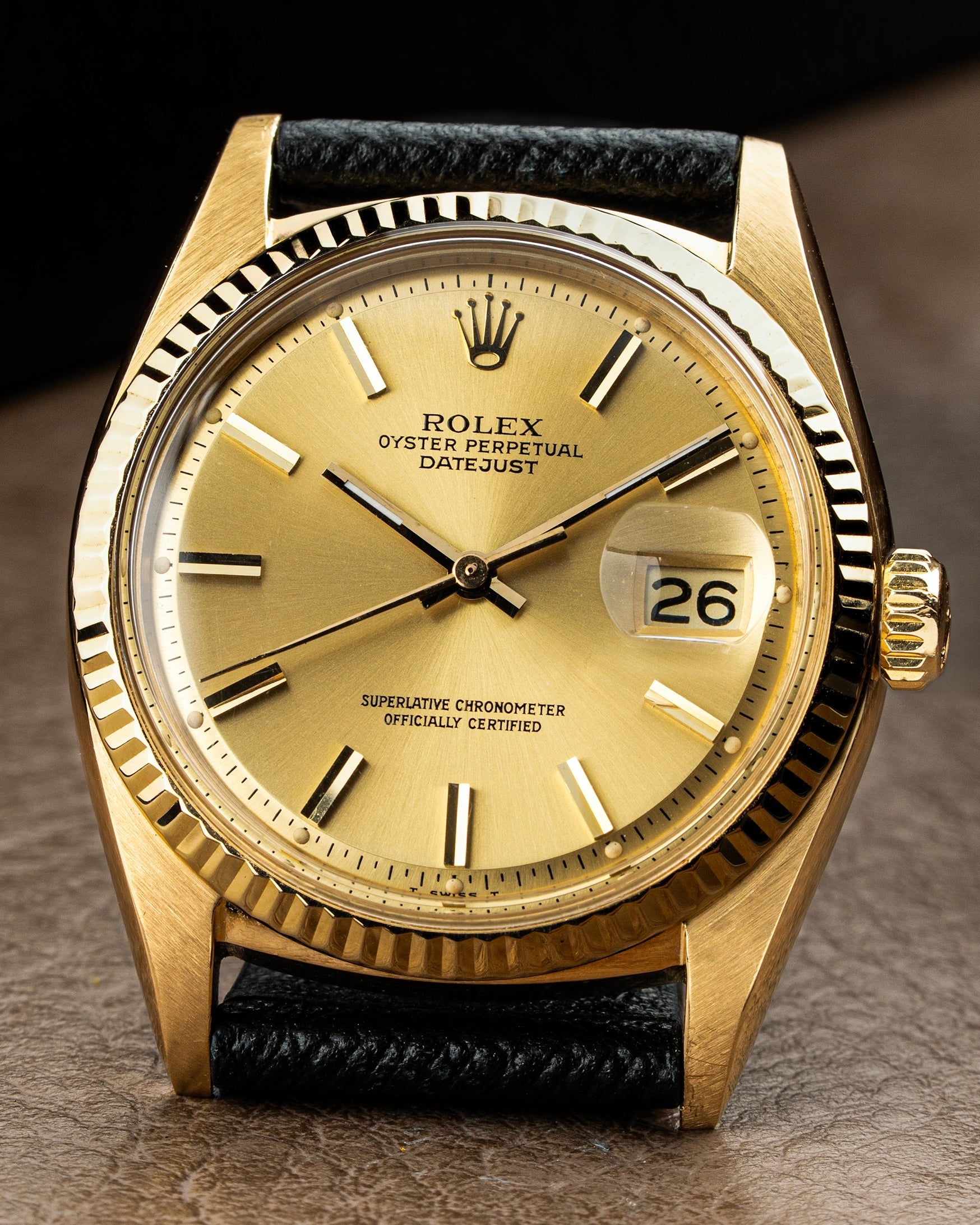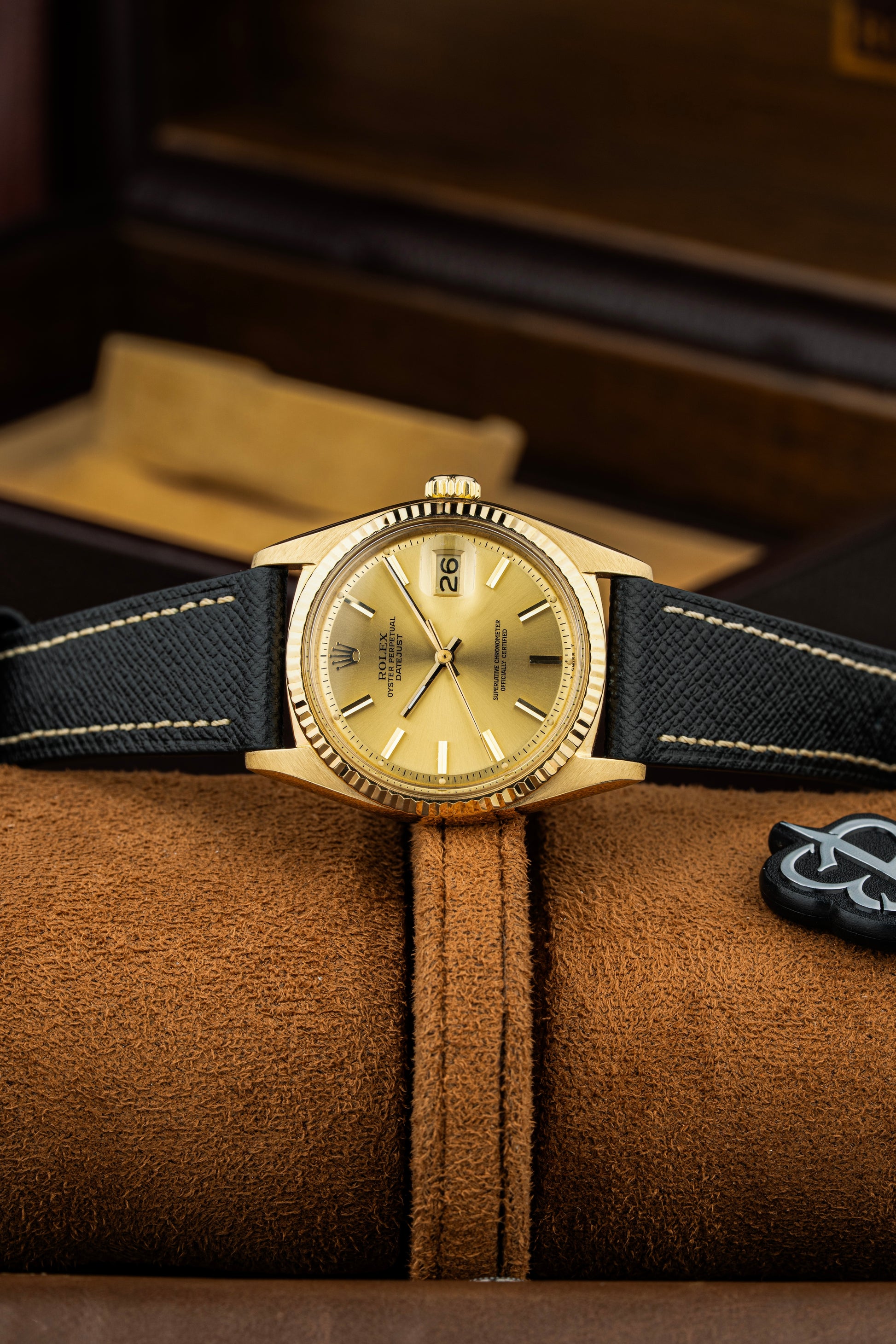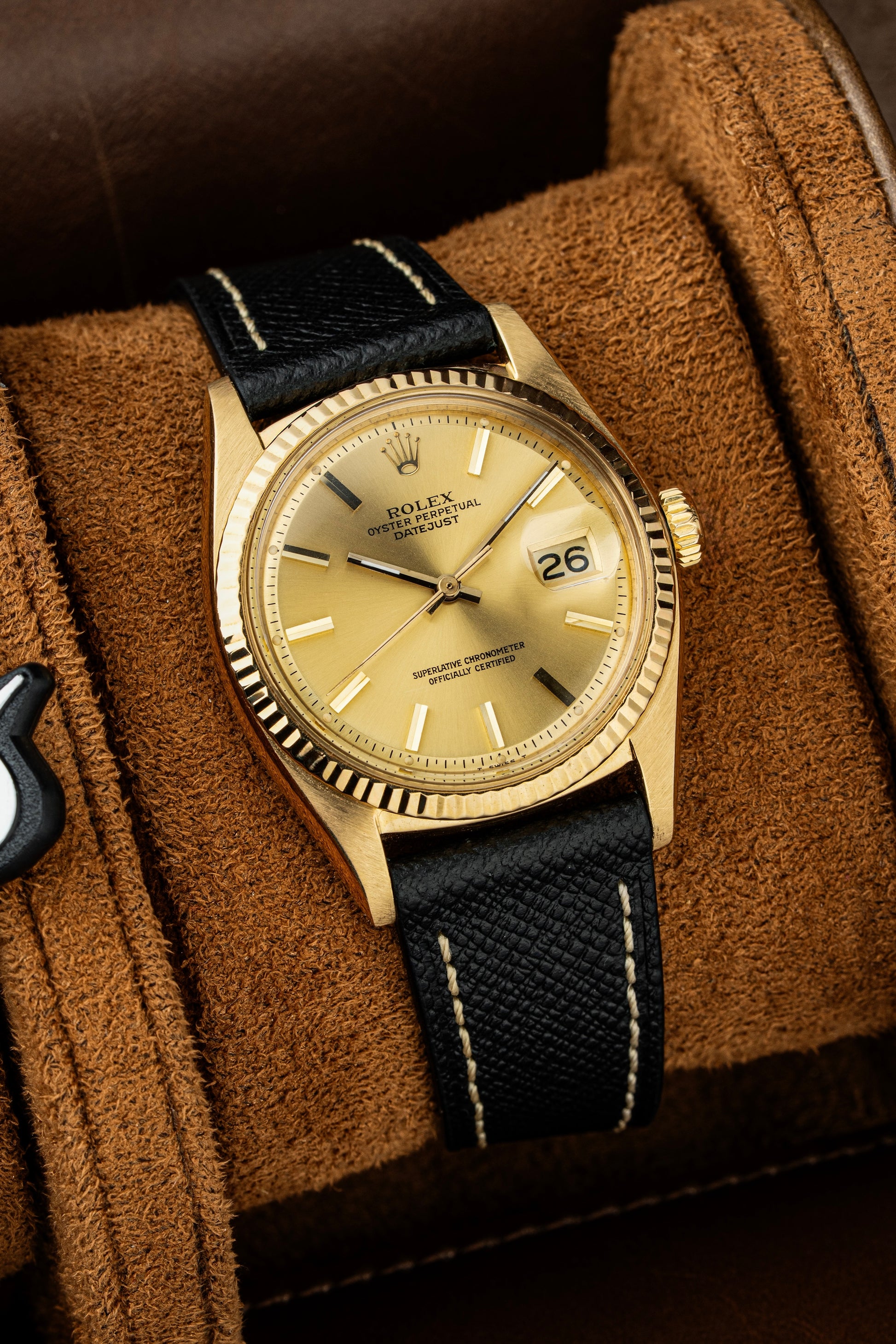 For sale is a vintage 1974 Rolex Datejust Ref. 1601 in solid 18k yellow gold, fitted with a generic black leather strap with matching gold stitching. The watch comes with an original Rolex box and is in excellent working order.