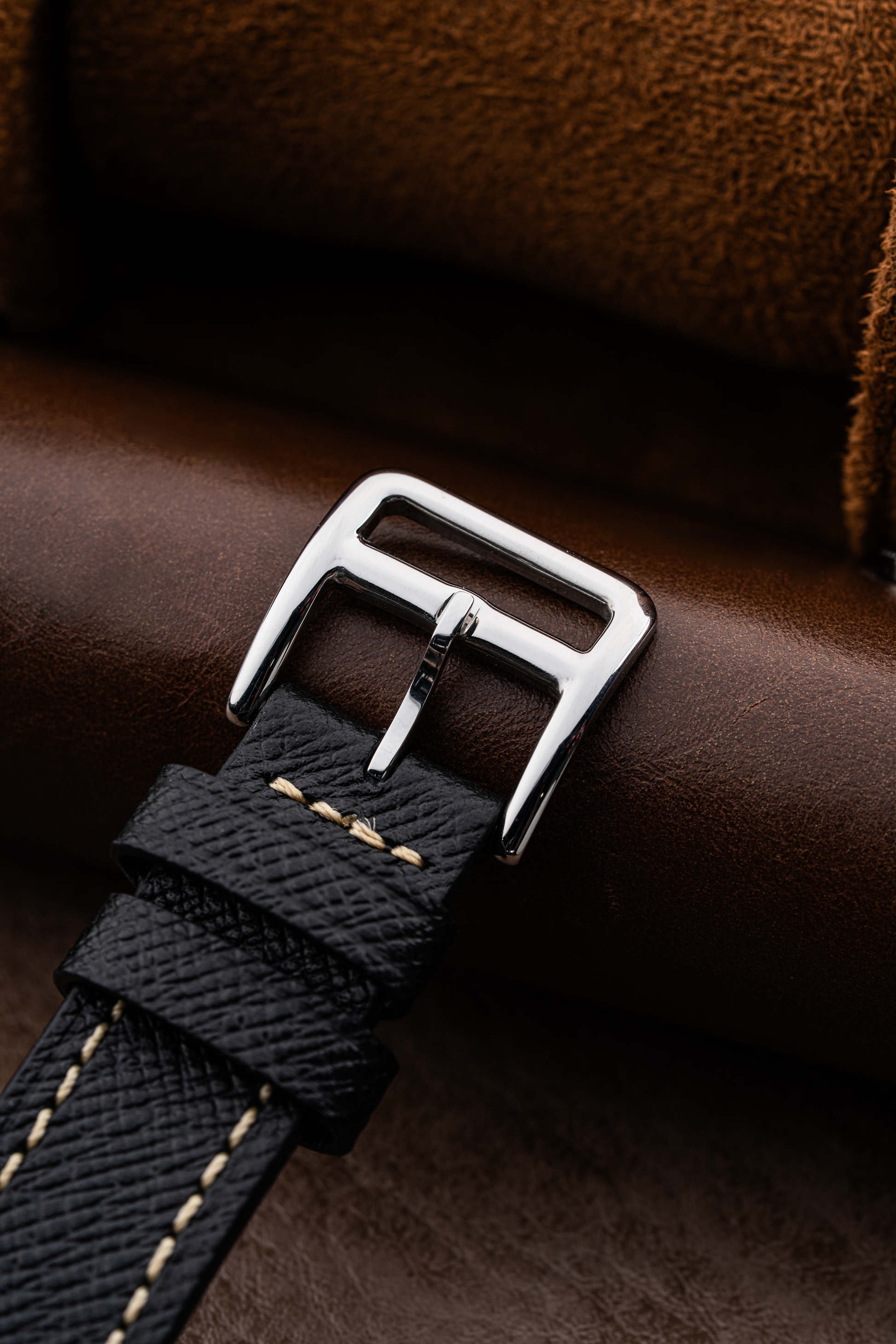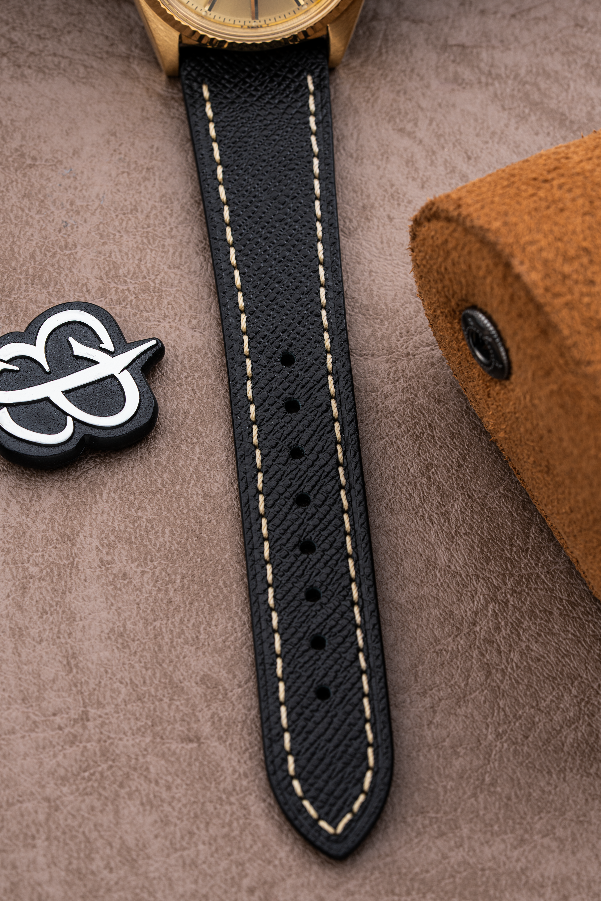 The watch is currently fitted with a generic black leather strap with gold stitching, a tasteful and versatile choice that pairs elegantly with the yellow gold case.