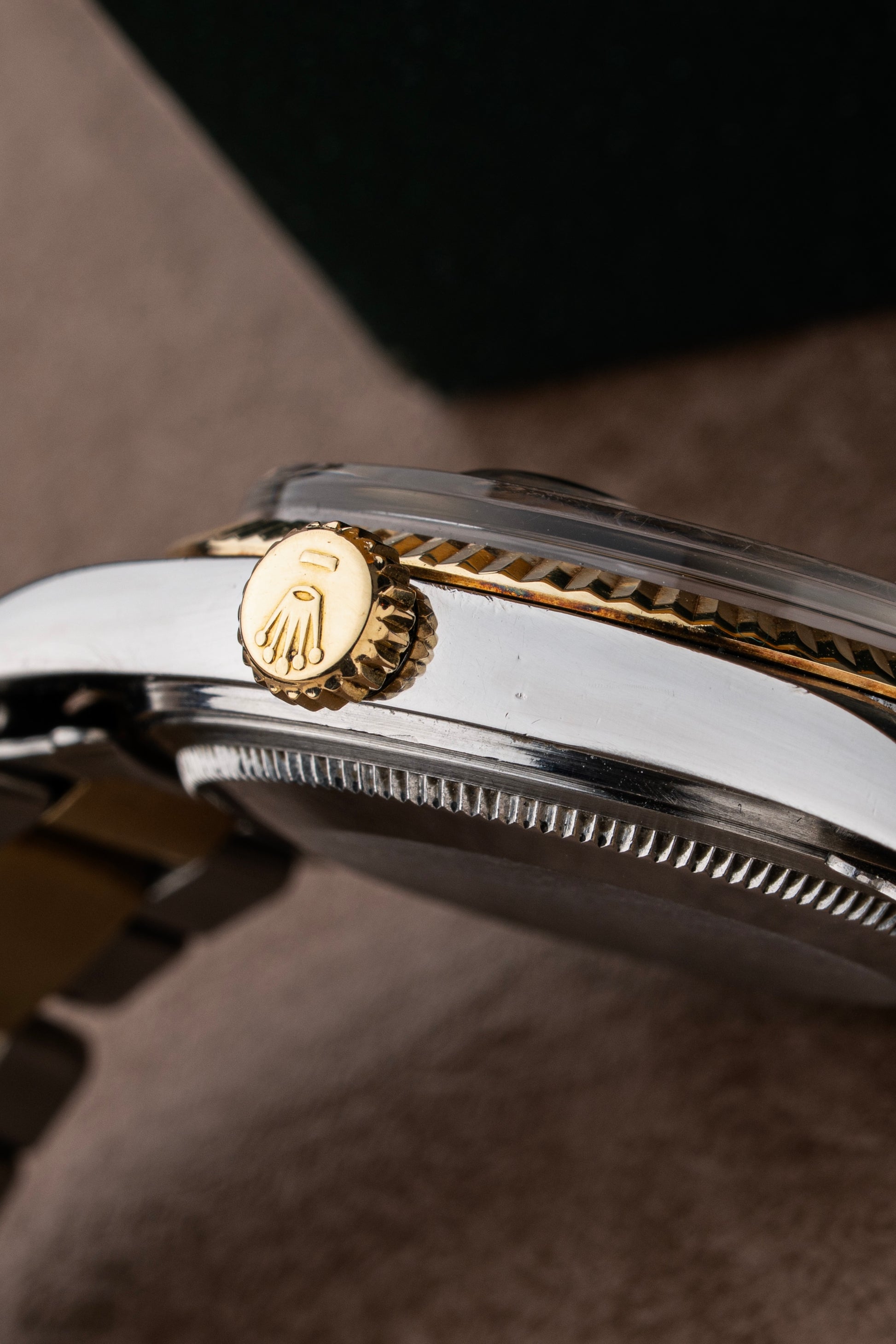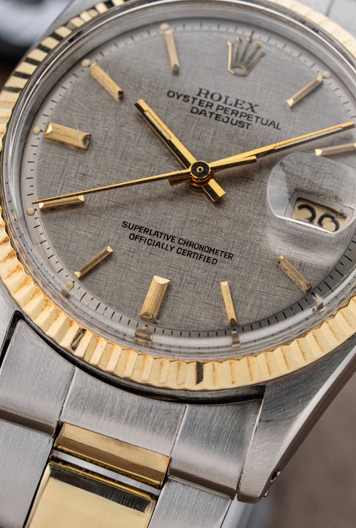 For sale is a Rolex Datejust Ref. 1601, presented in stainless steel and yellow gold, featuring a stunning and notably rare grey linen sigma dial paired with an equally uncommon period-correct Oyster bracelet.