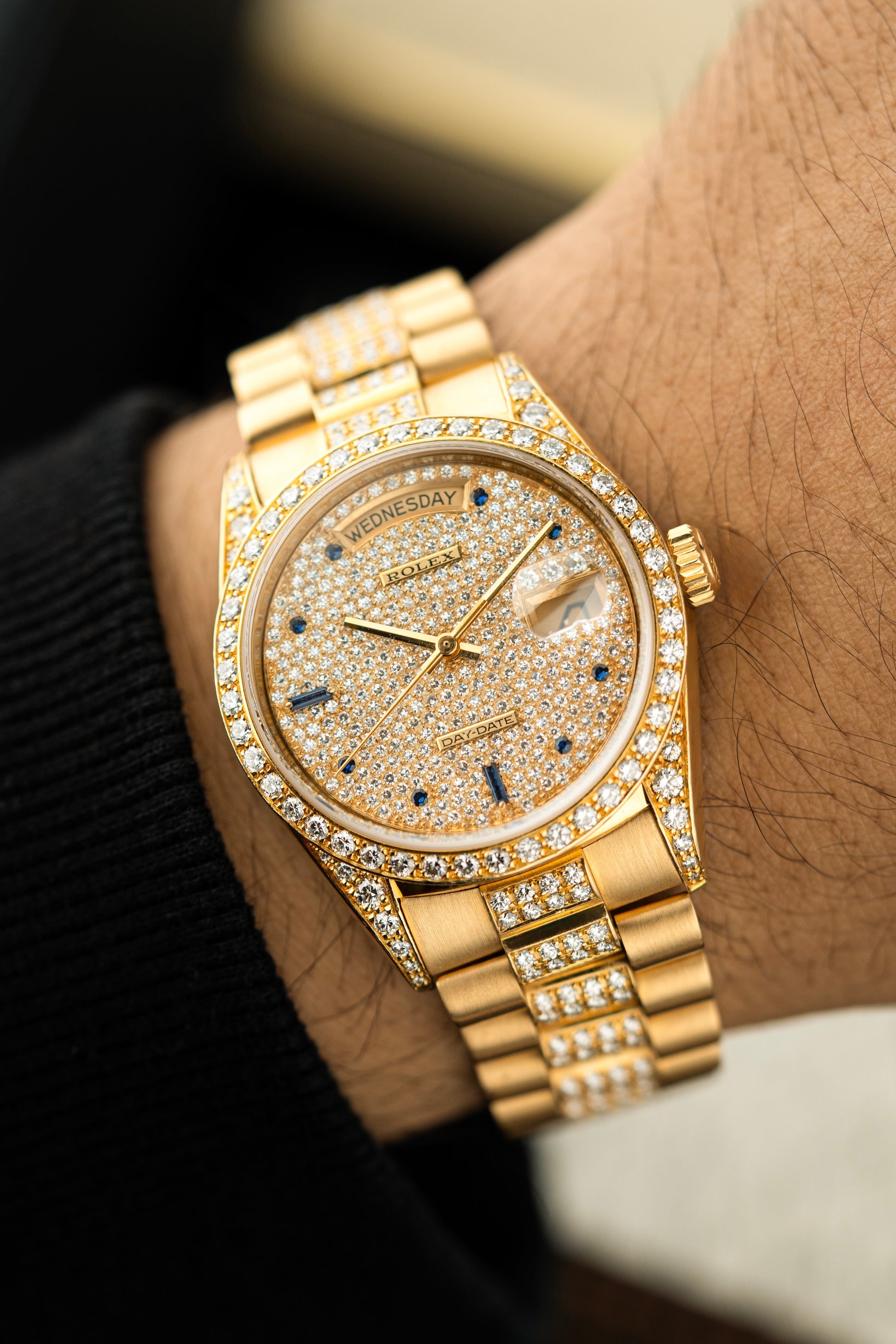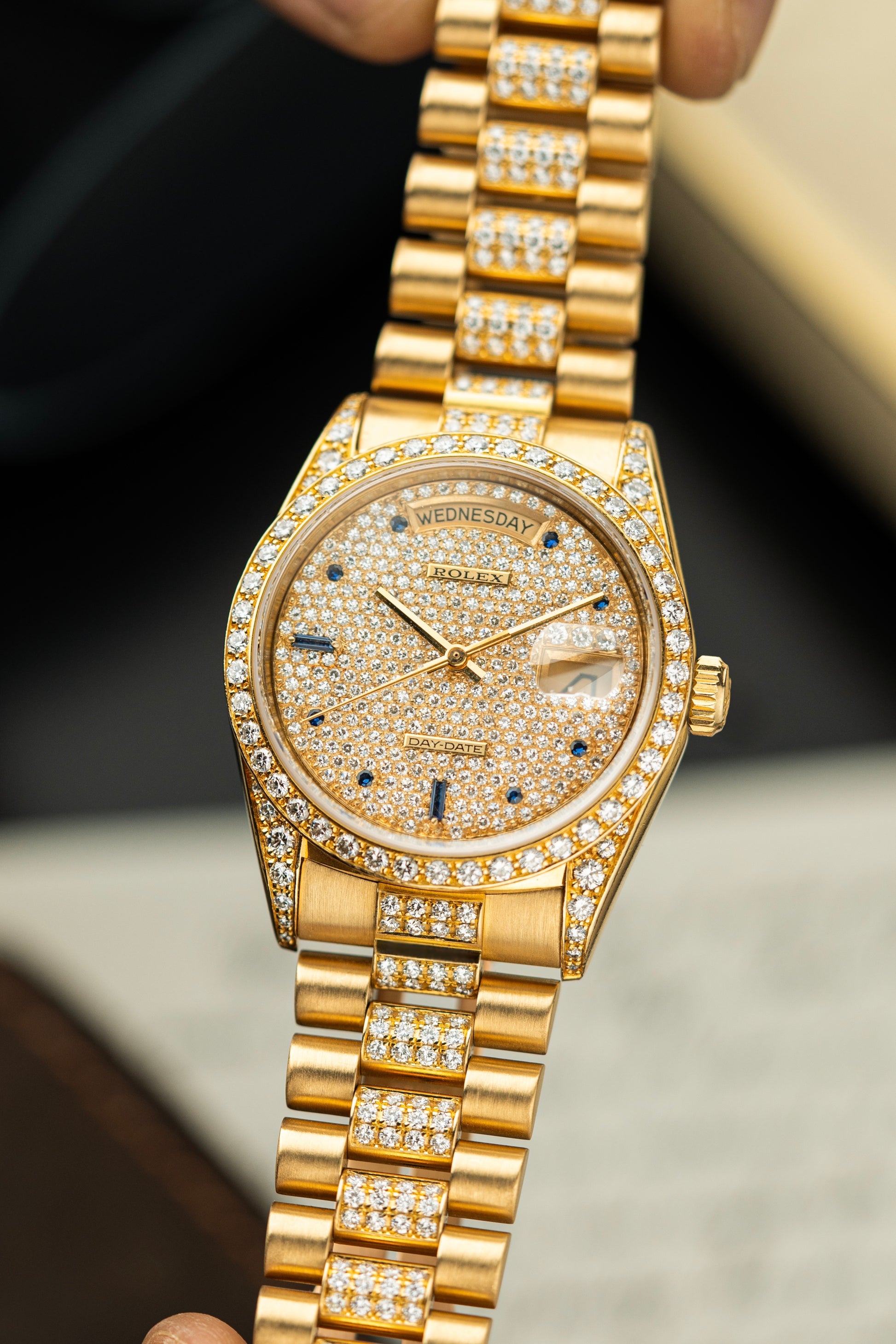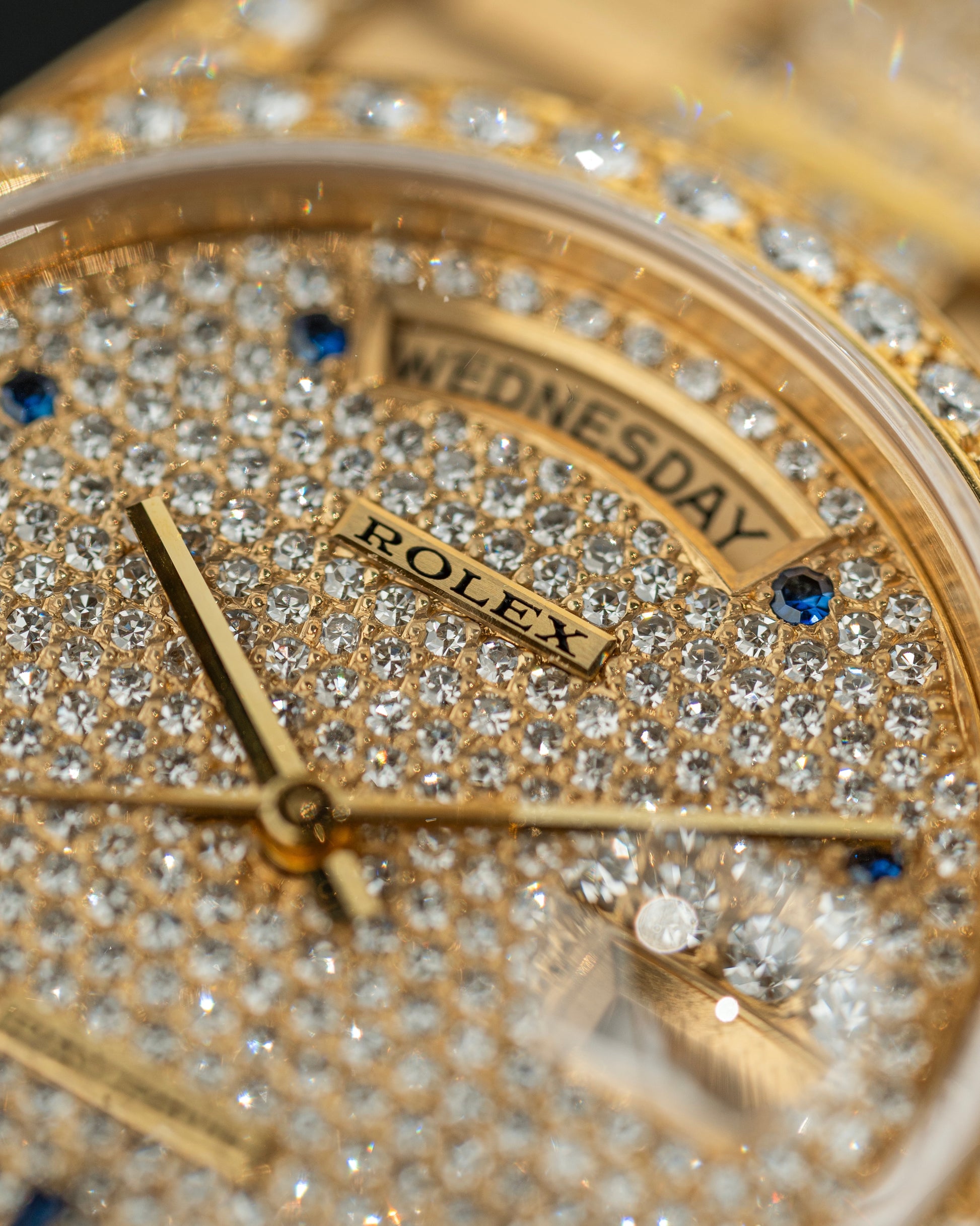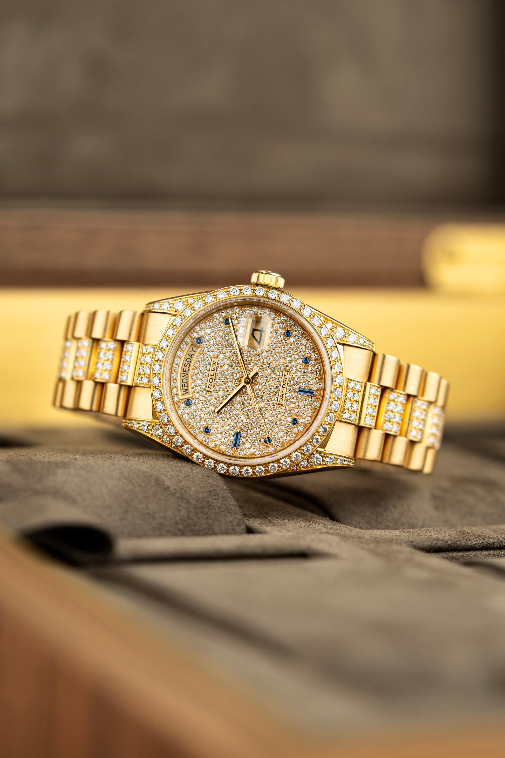 For Rolex collectors, a fully diamond-set Day-Date may represent the pinnacle of their collection. It’s a rare, luxurious, and highly desirable piece that adds a unique flair to any watch collection. For collectors who already own more basic models of the Day-Date, the diamond-set version offers an extraordinary upgrade.