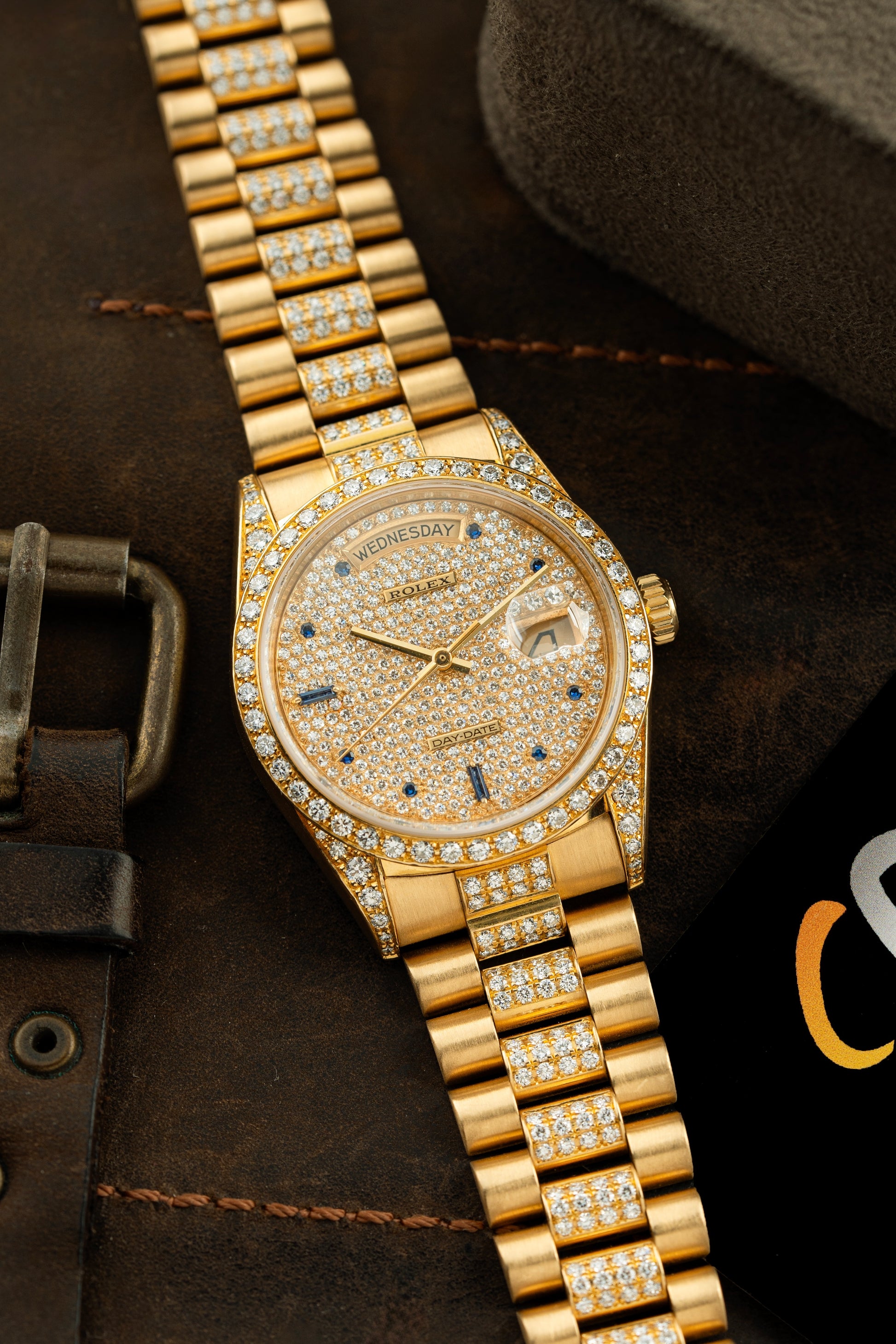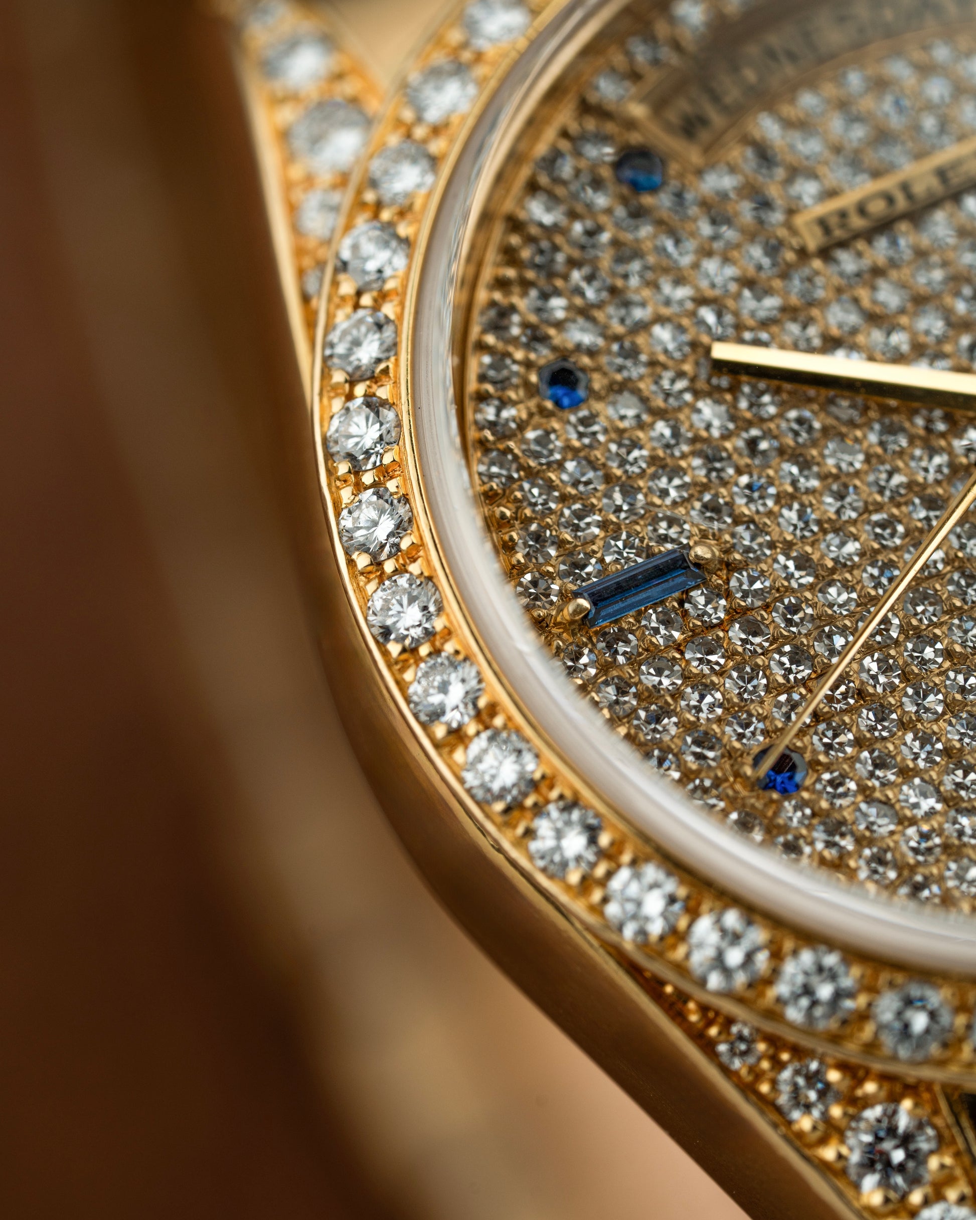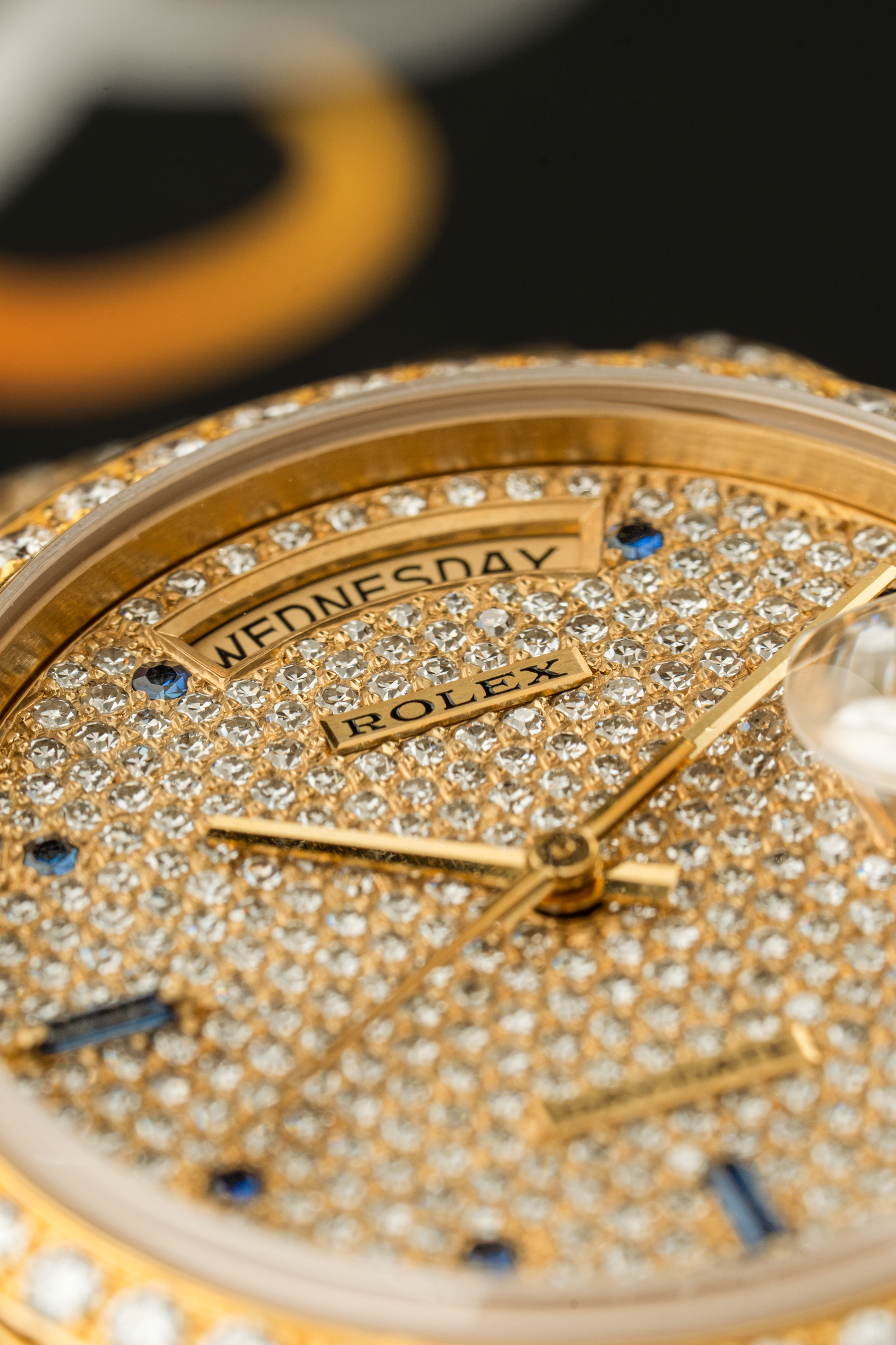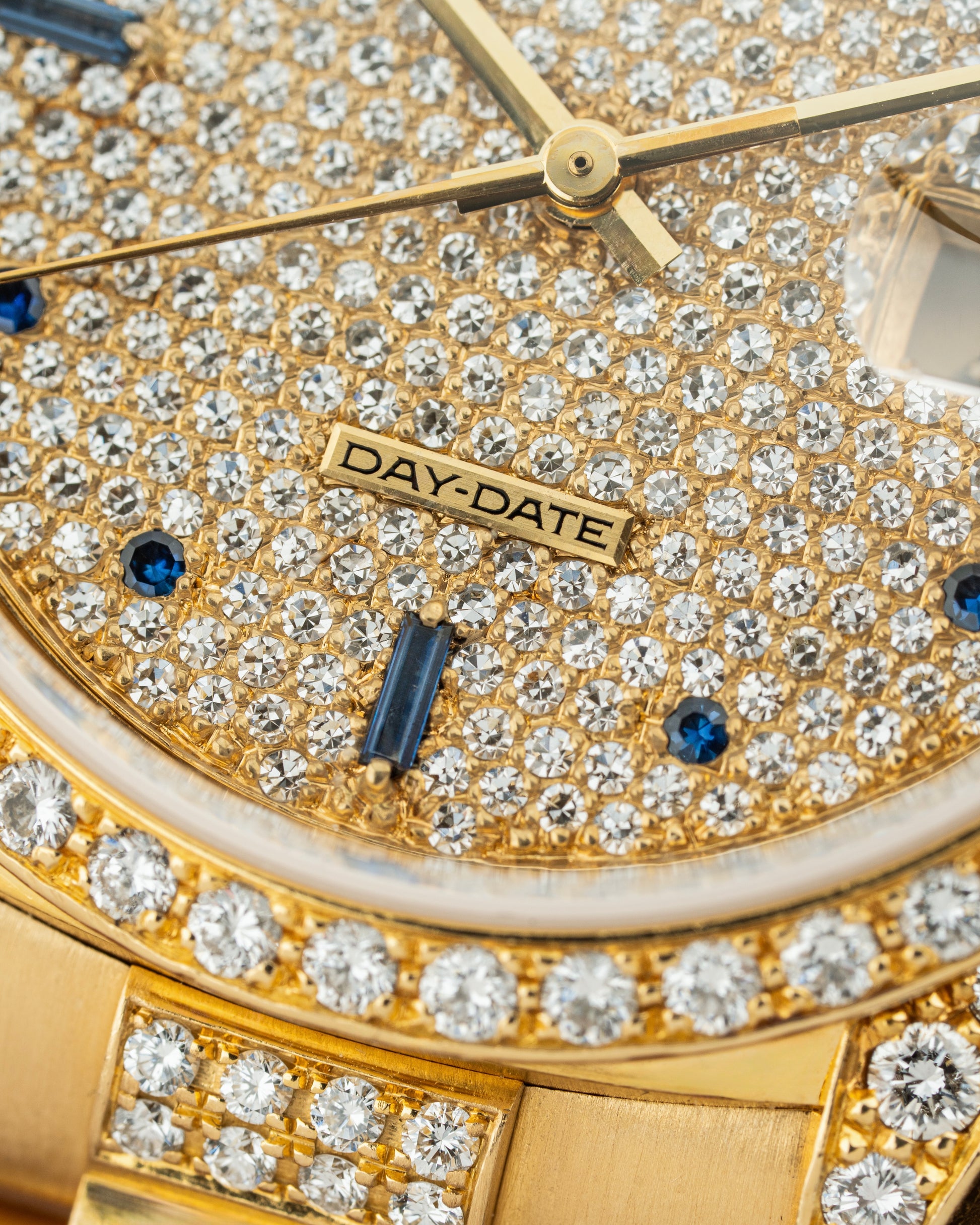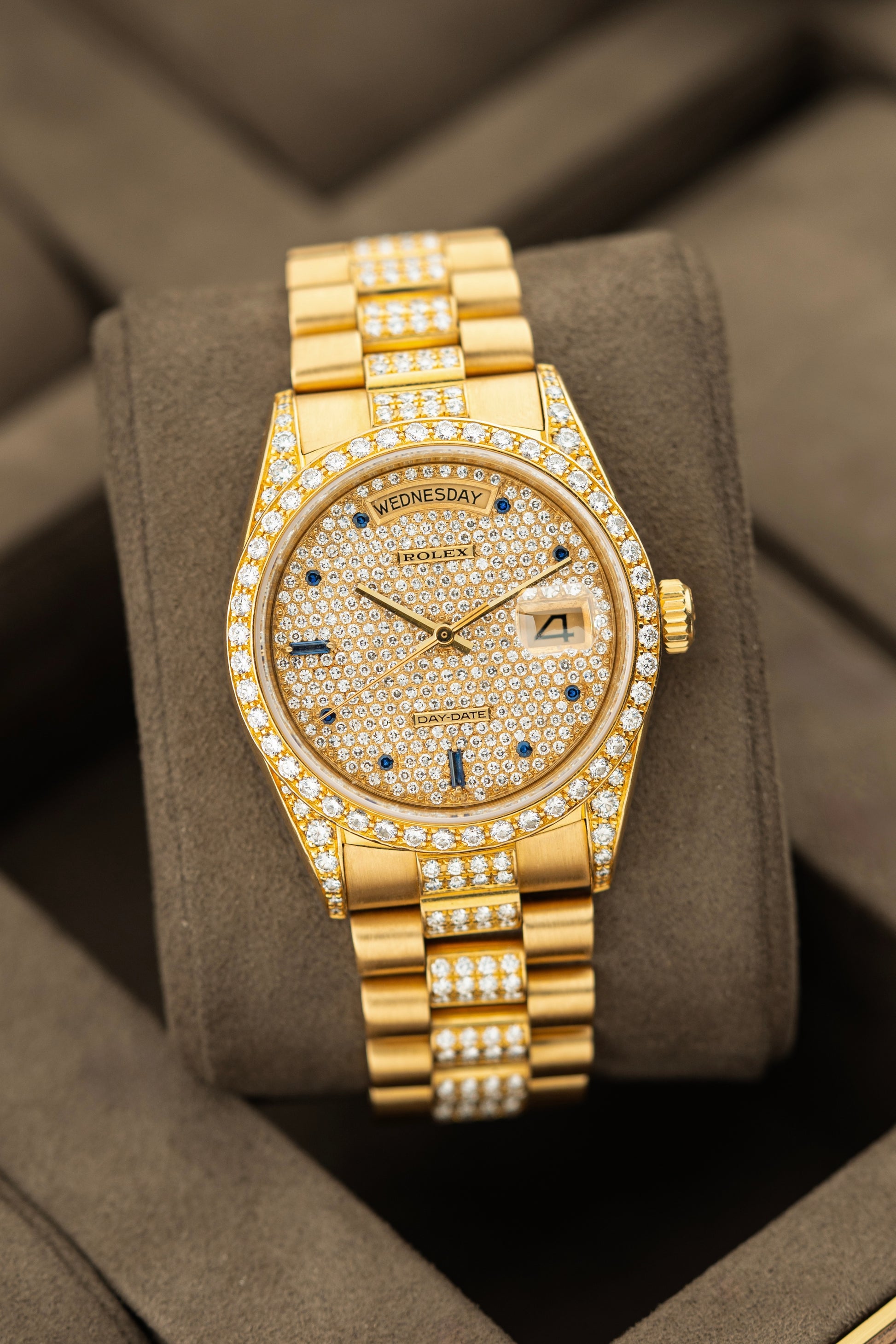 The Rolex Day-Date Ref. 18138 features factory-set diamonds adding a luxurious element to the iconic President watch. The diamonds are included on the bezel, lugs, centre-links of the bracelet and a fully set Pavè dial with blue sapphire hour markers.