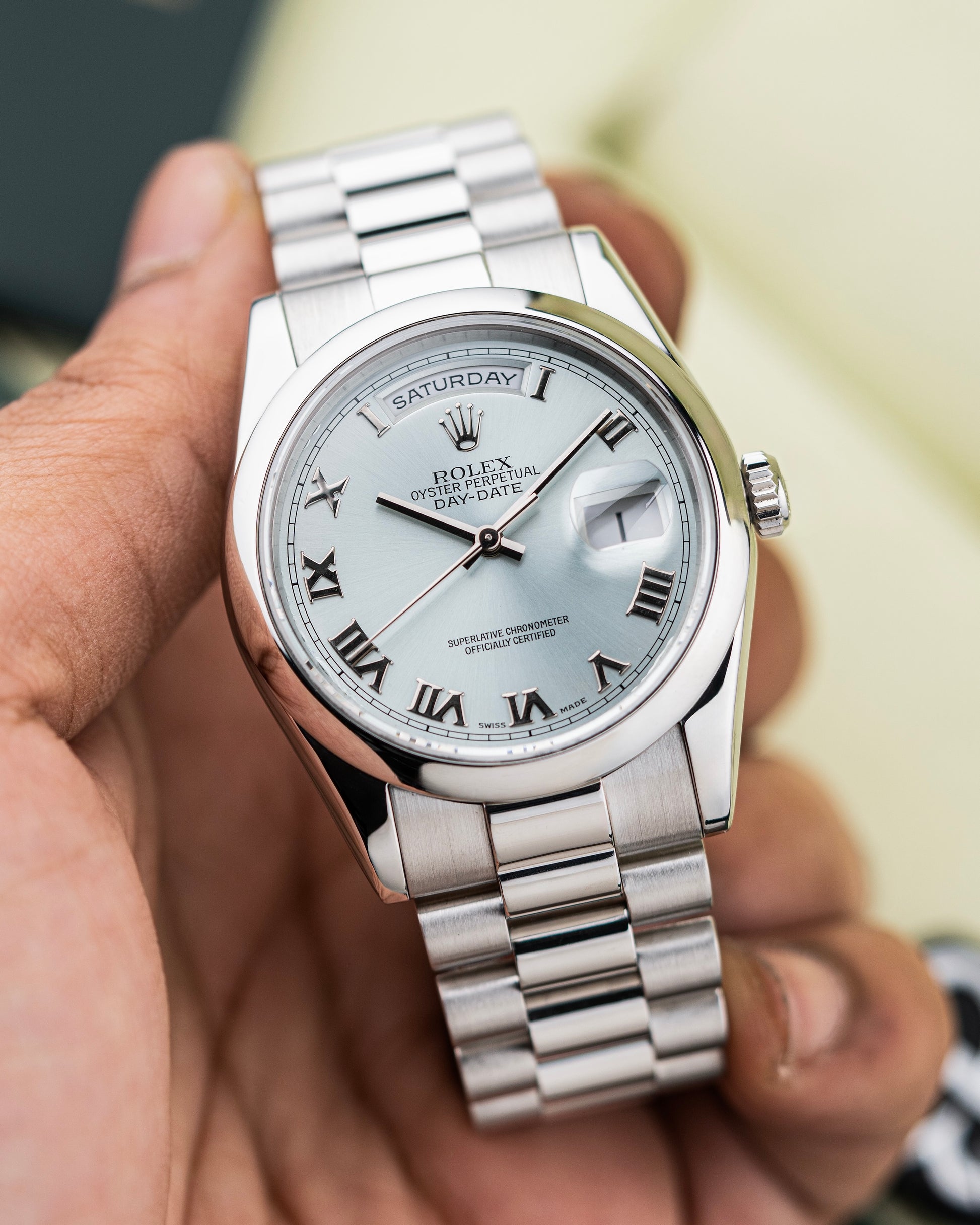 The ice blue dial is reserved only for platinum watches in the Rolex line-up, making it a symbol of refinement and a statement piece tied directly to the exclusivity of platinum watches. This subtle identifier helps to set the 118206 platinum Day-Date apart from other seemingly similar white-gold variations.