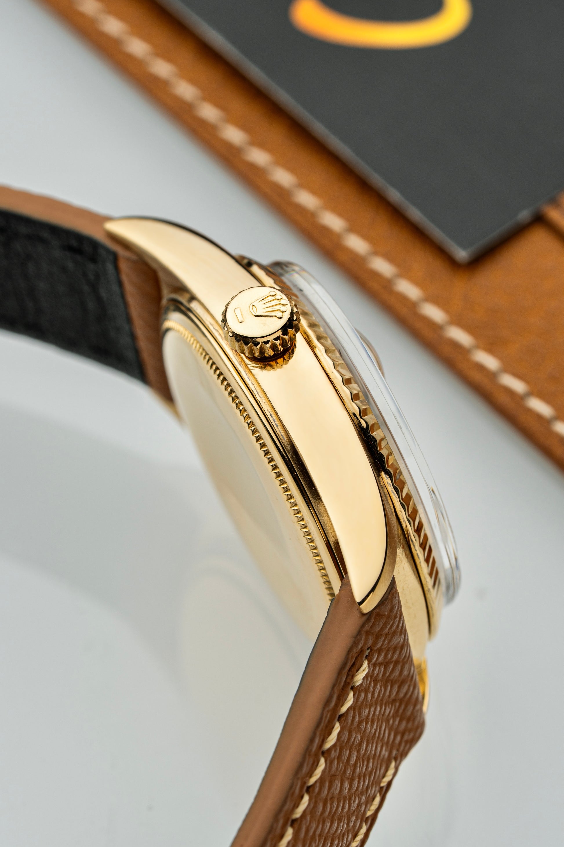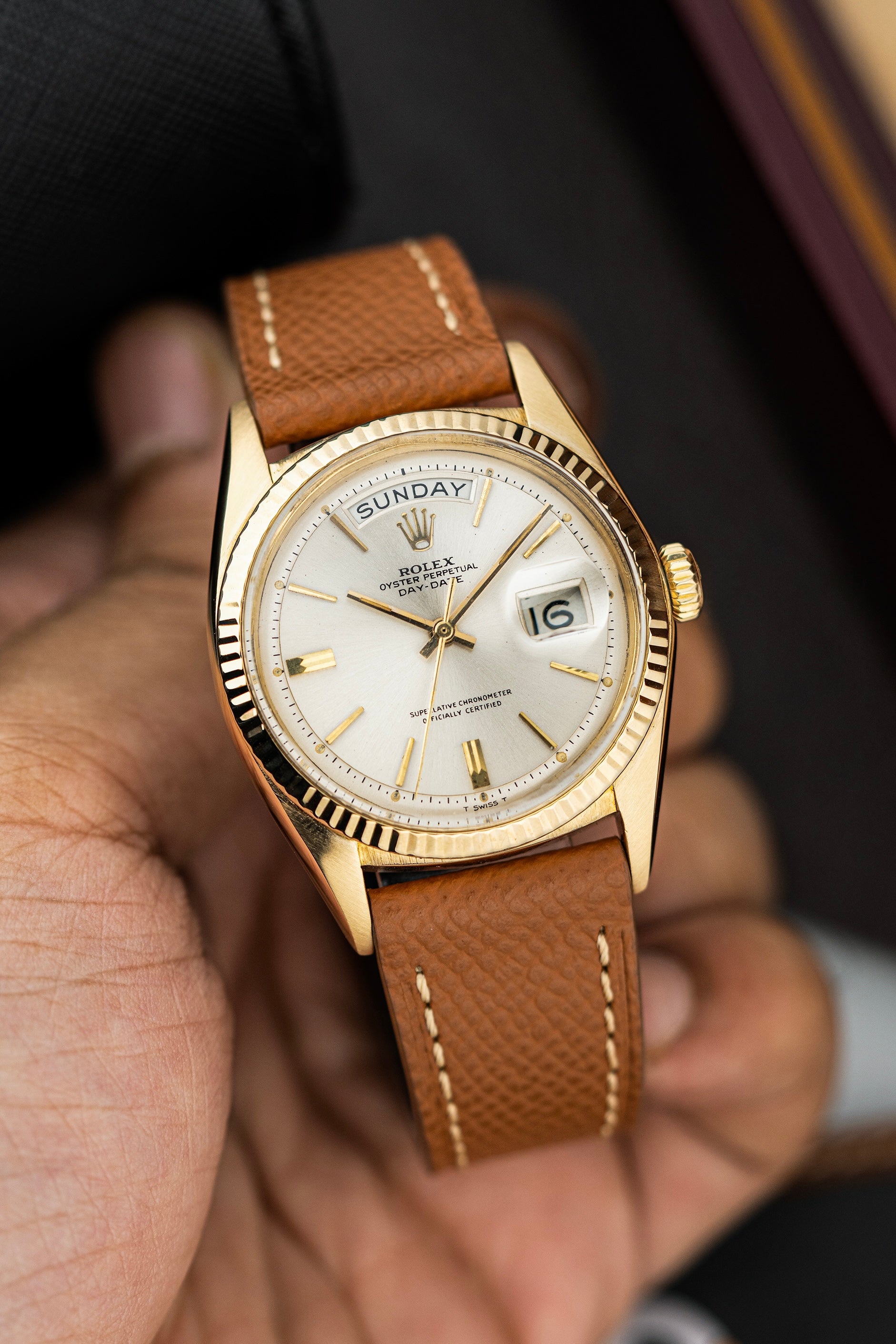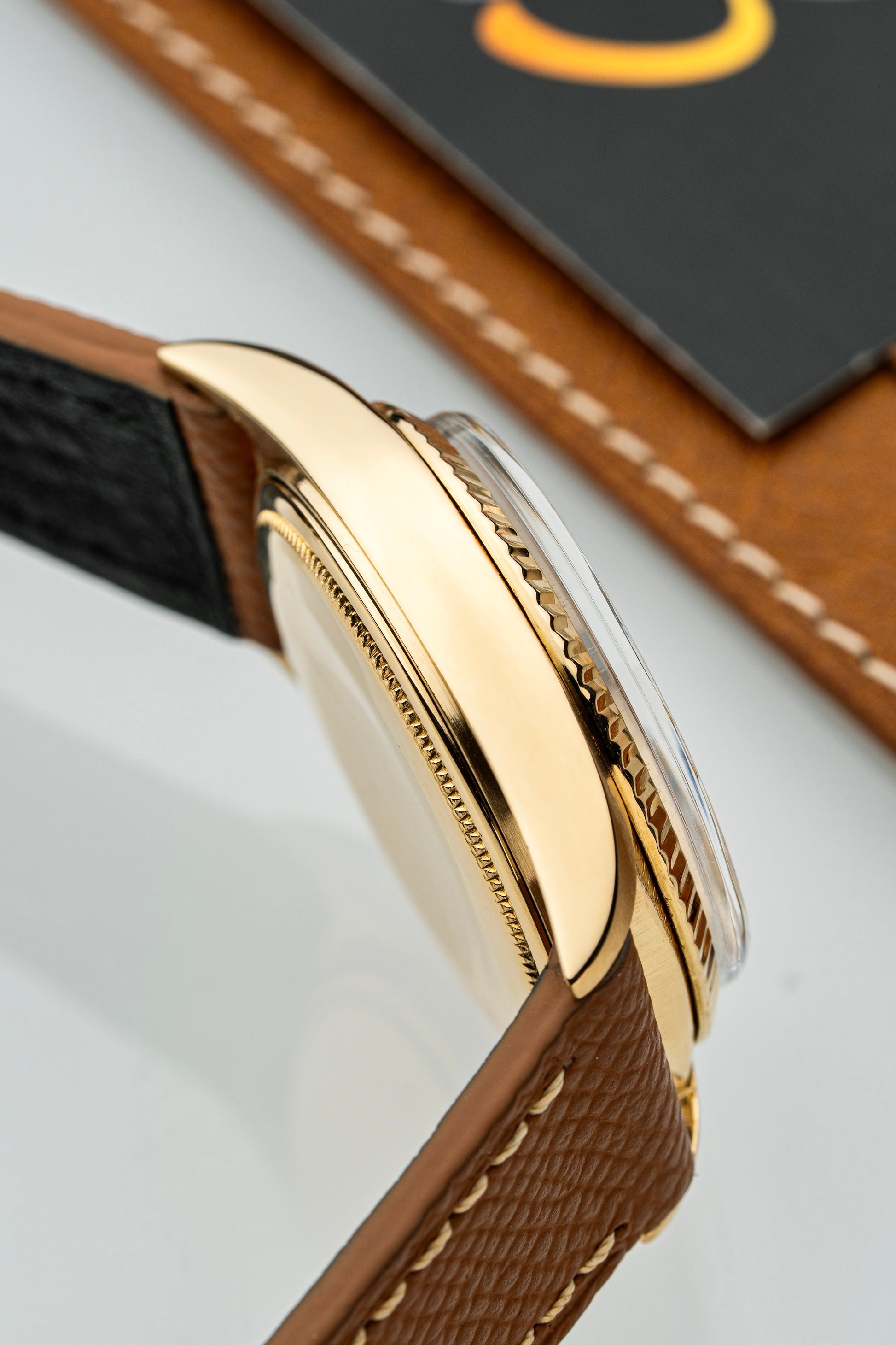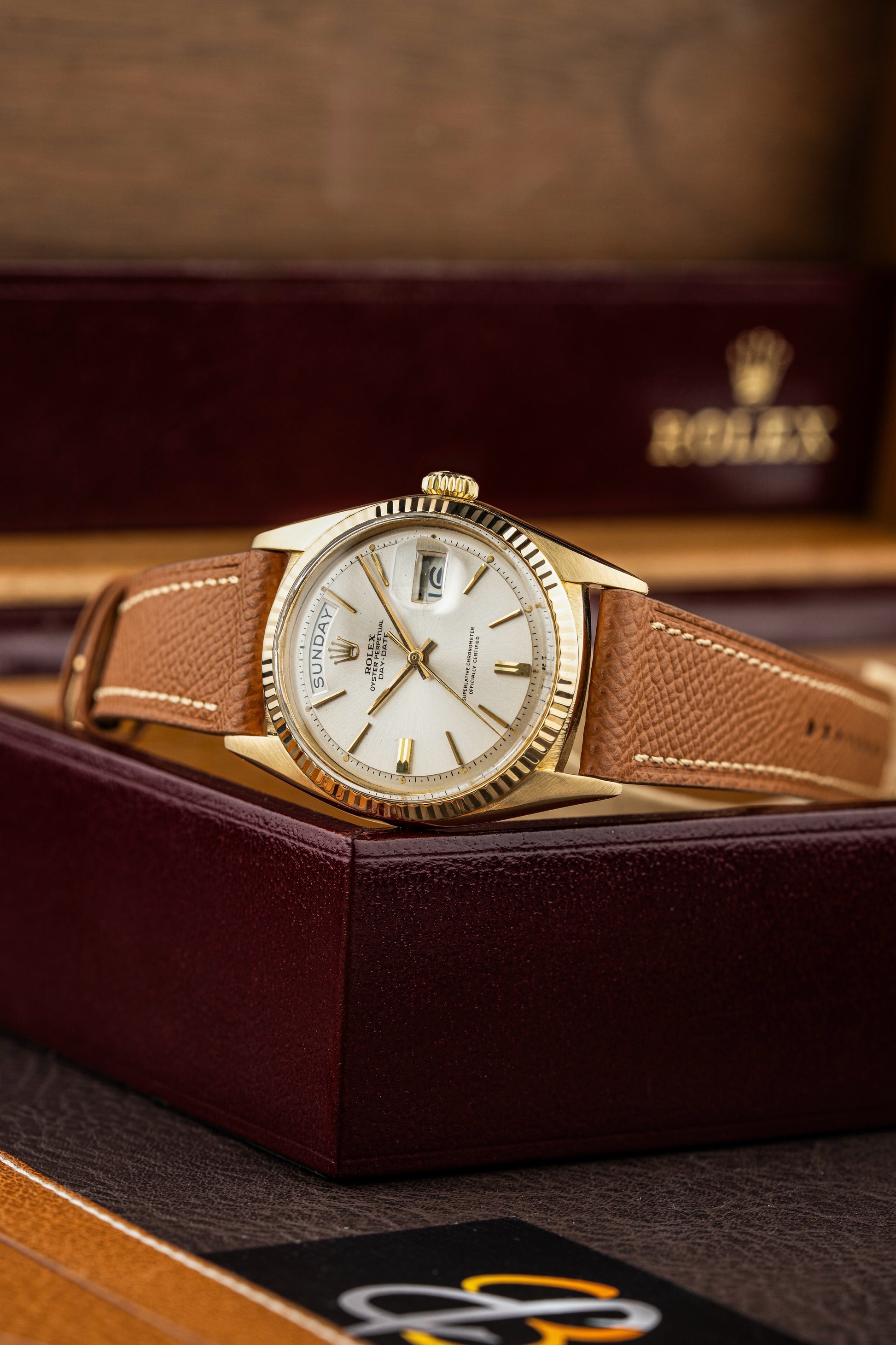 For sale is a Vintage Rolex Day-Date Ref. 1803 from 1975 in solid 18k yellow gold, presented on a classic tan leather strap with its original gold-plated Rolex buckle.