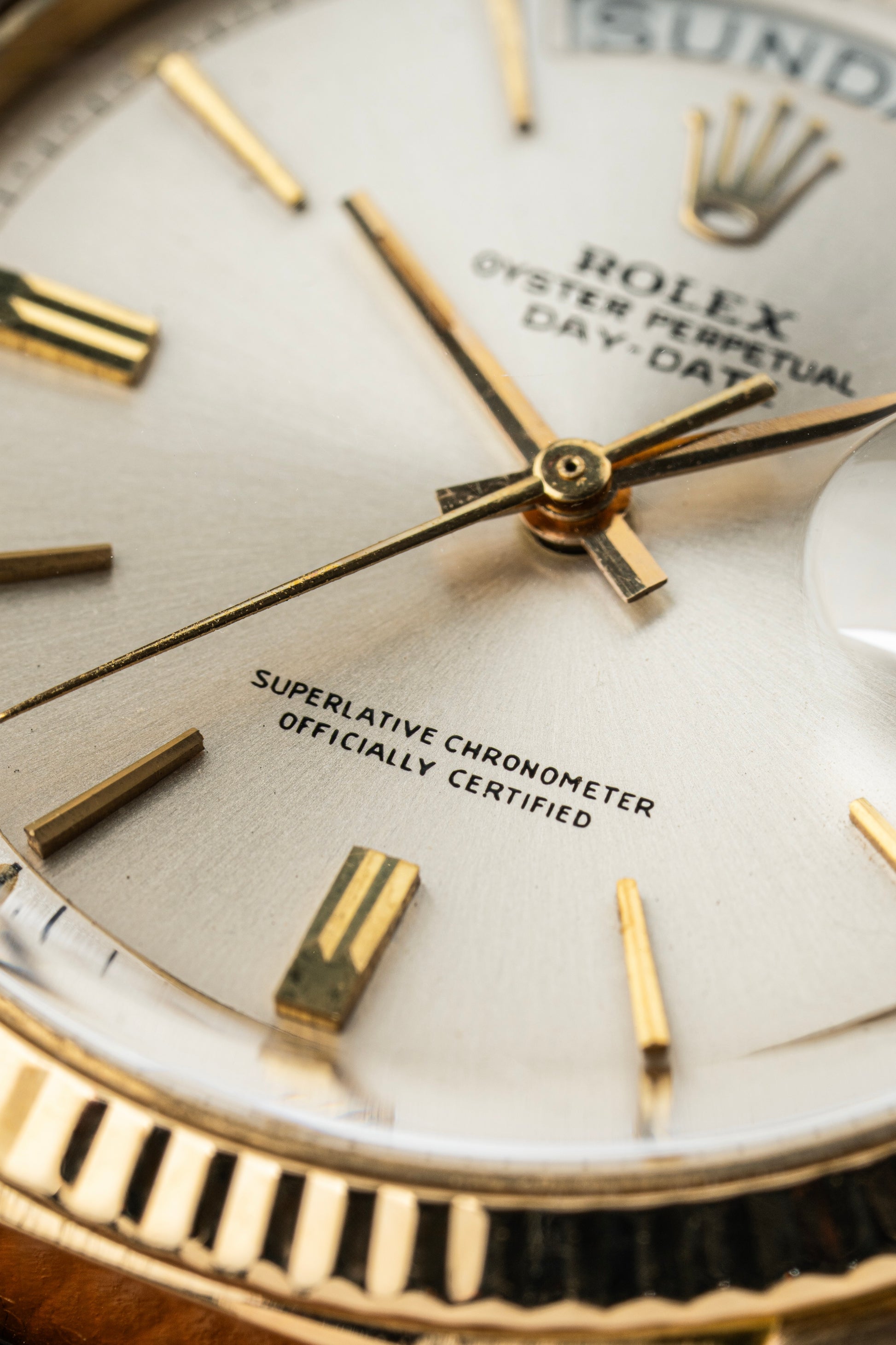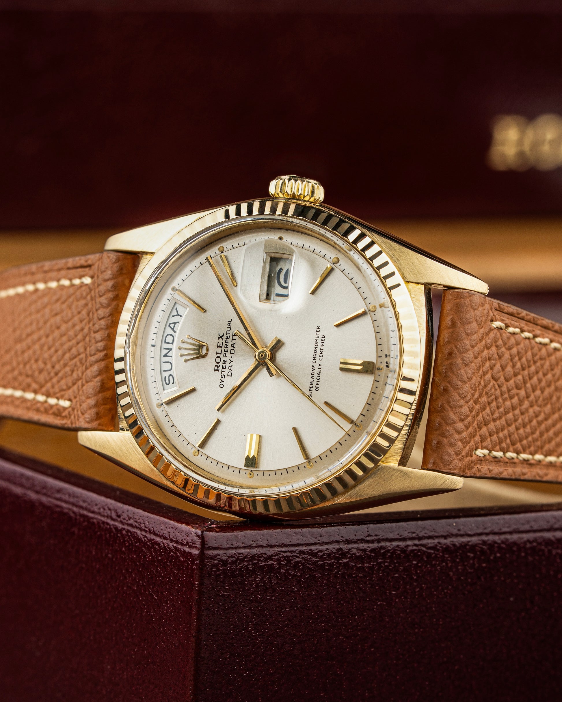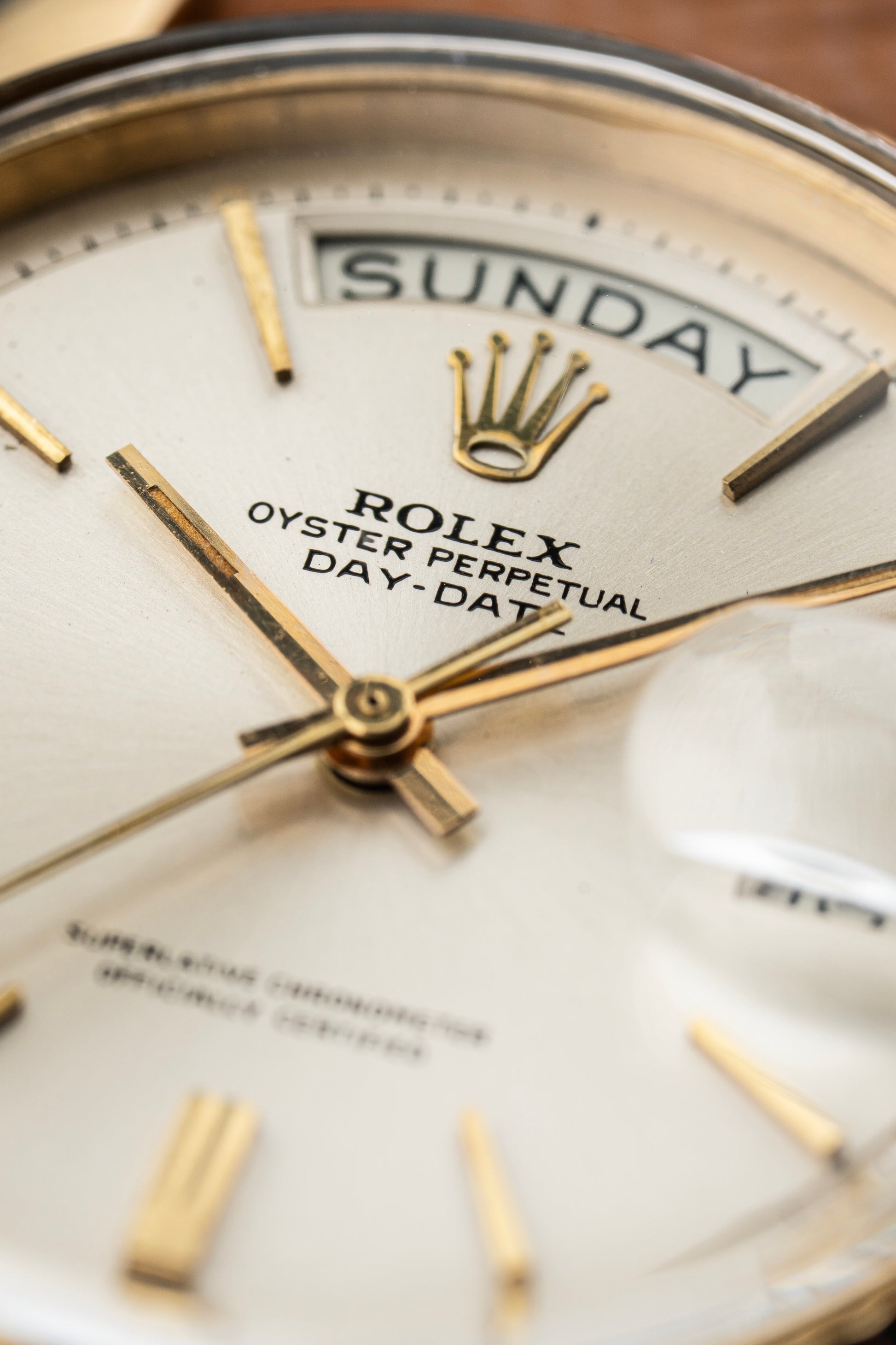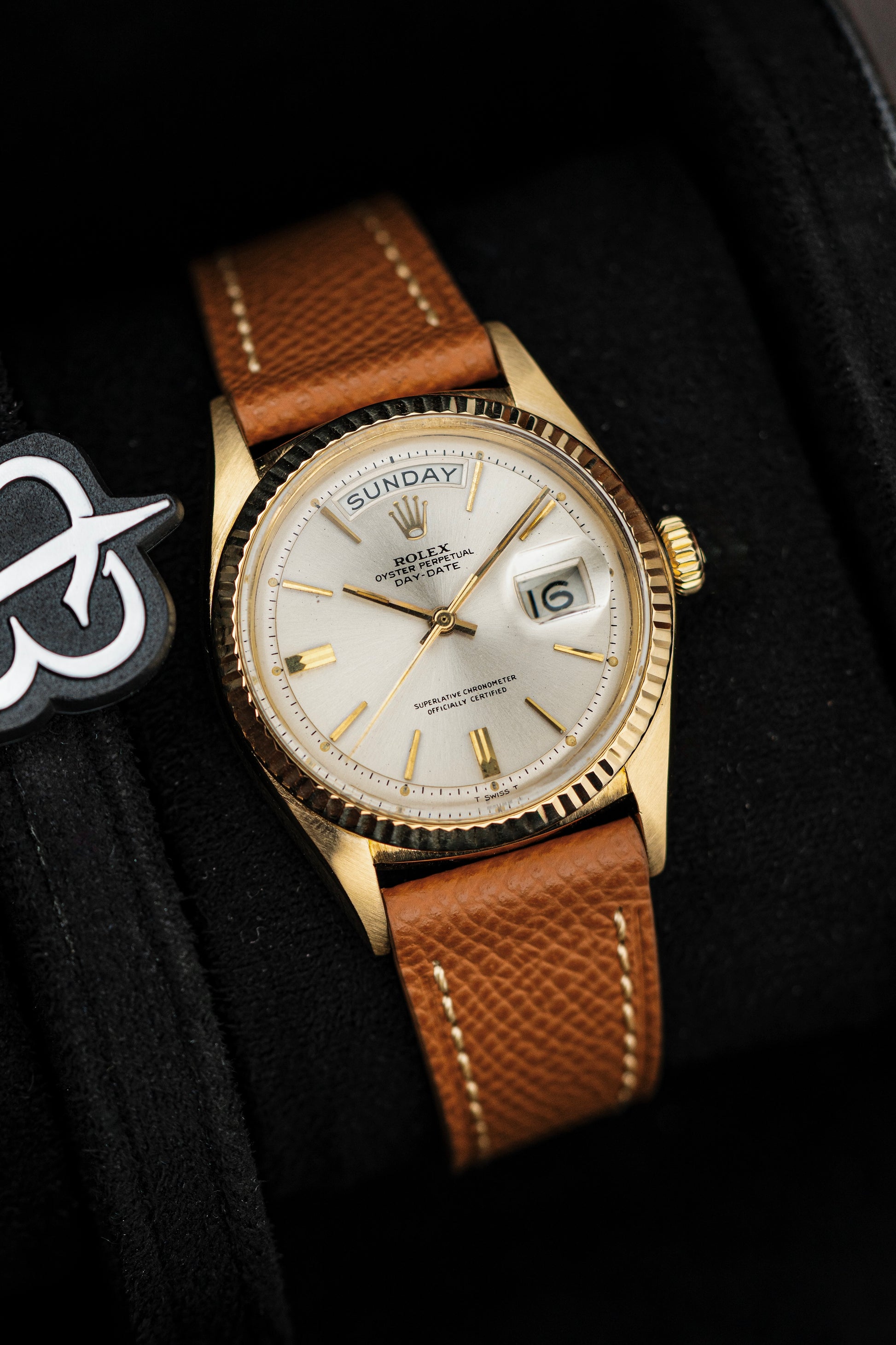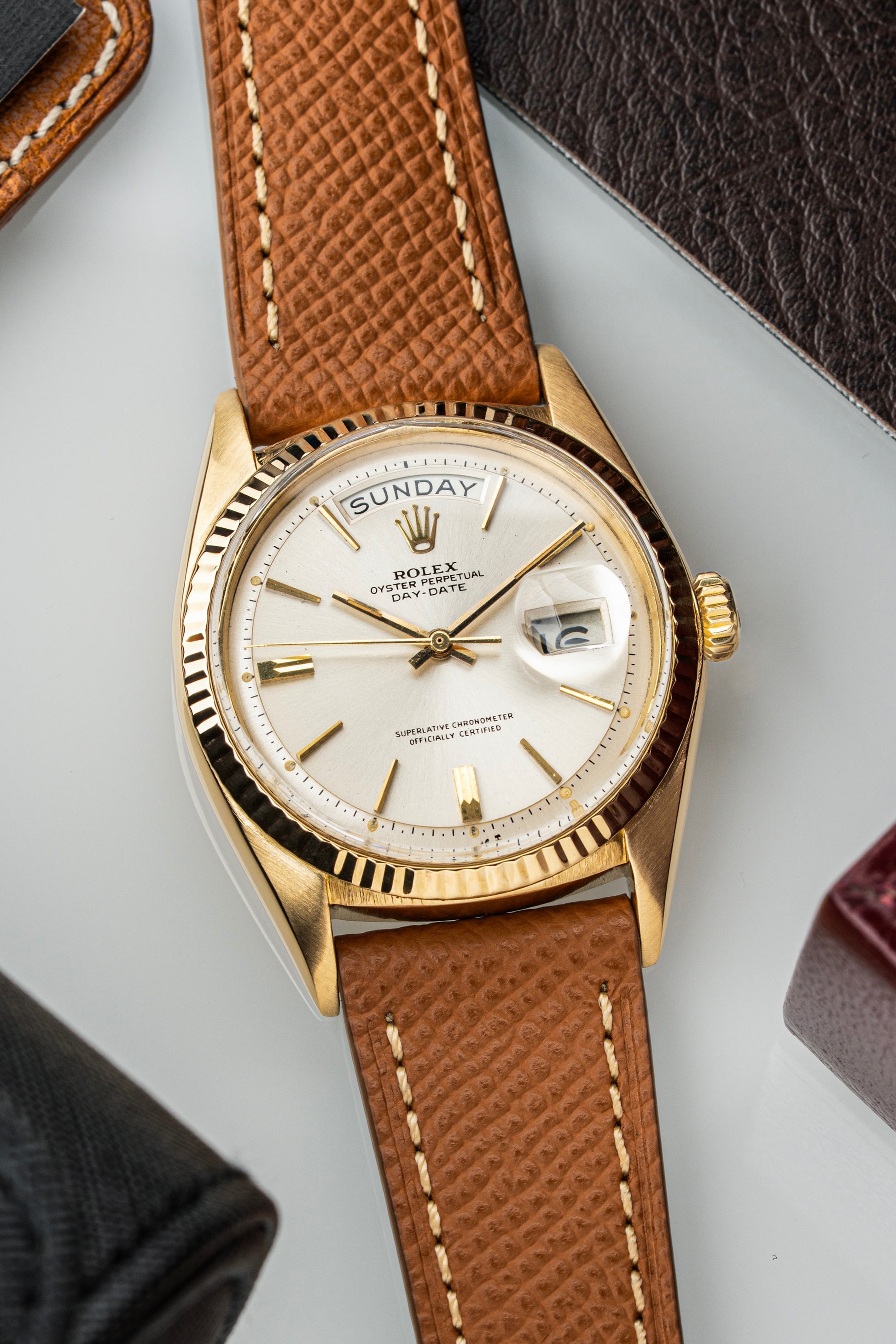 For sale is a Vintage Rolex Day-Date Ref. 1803 from 1975 in solid 18k yellow gold, presented on a classic tan leather strap with its original gold-plated Rolex buckle.