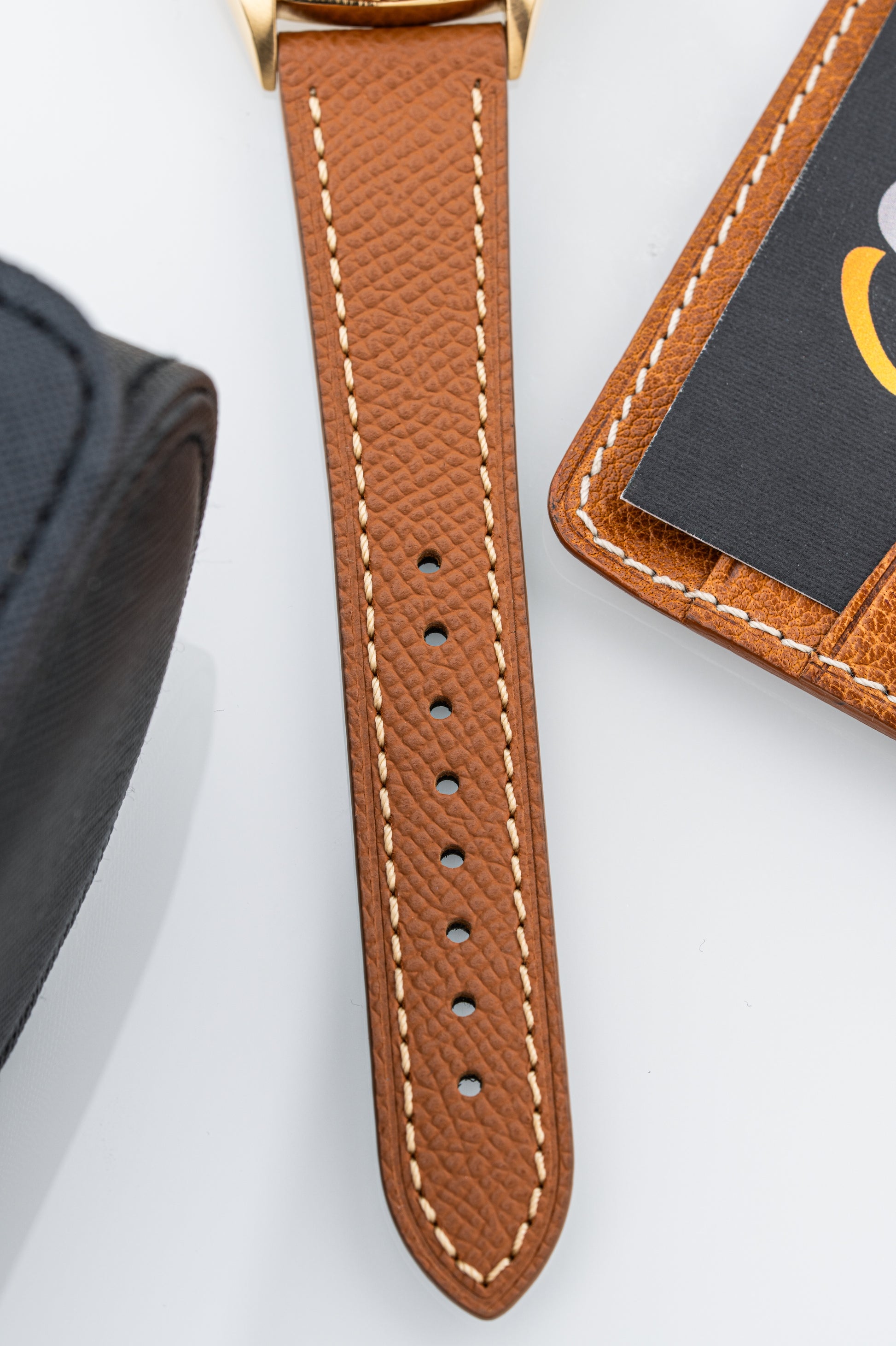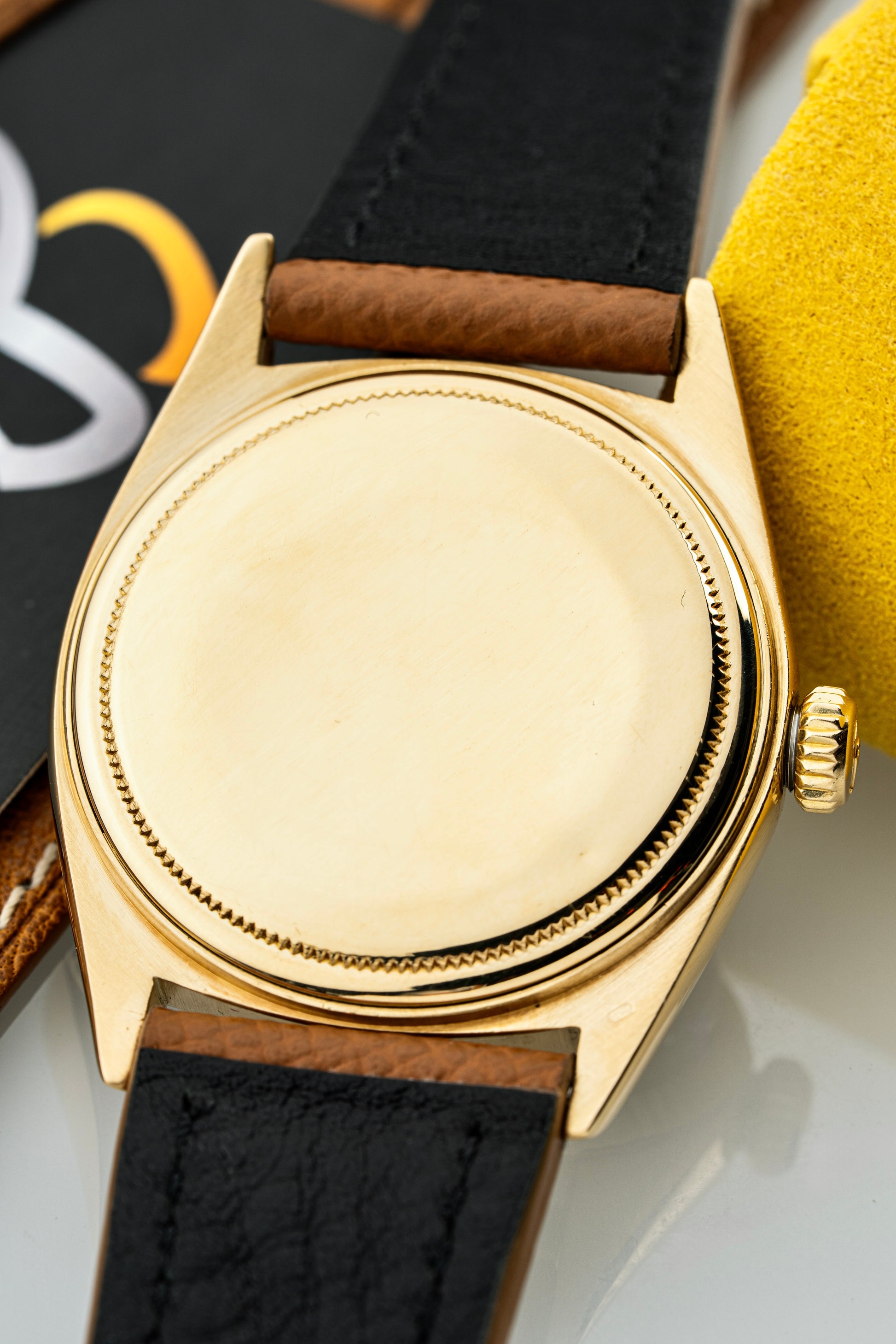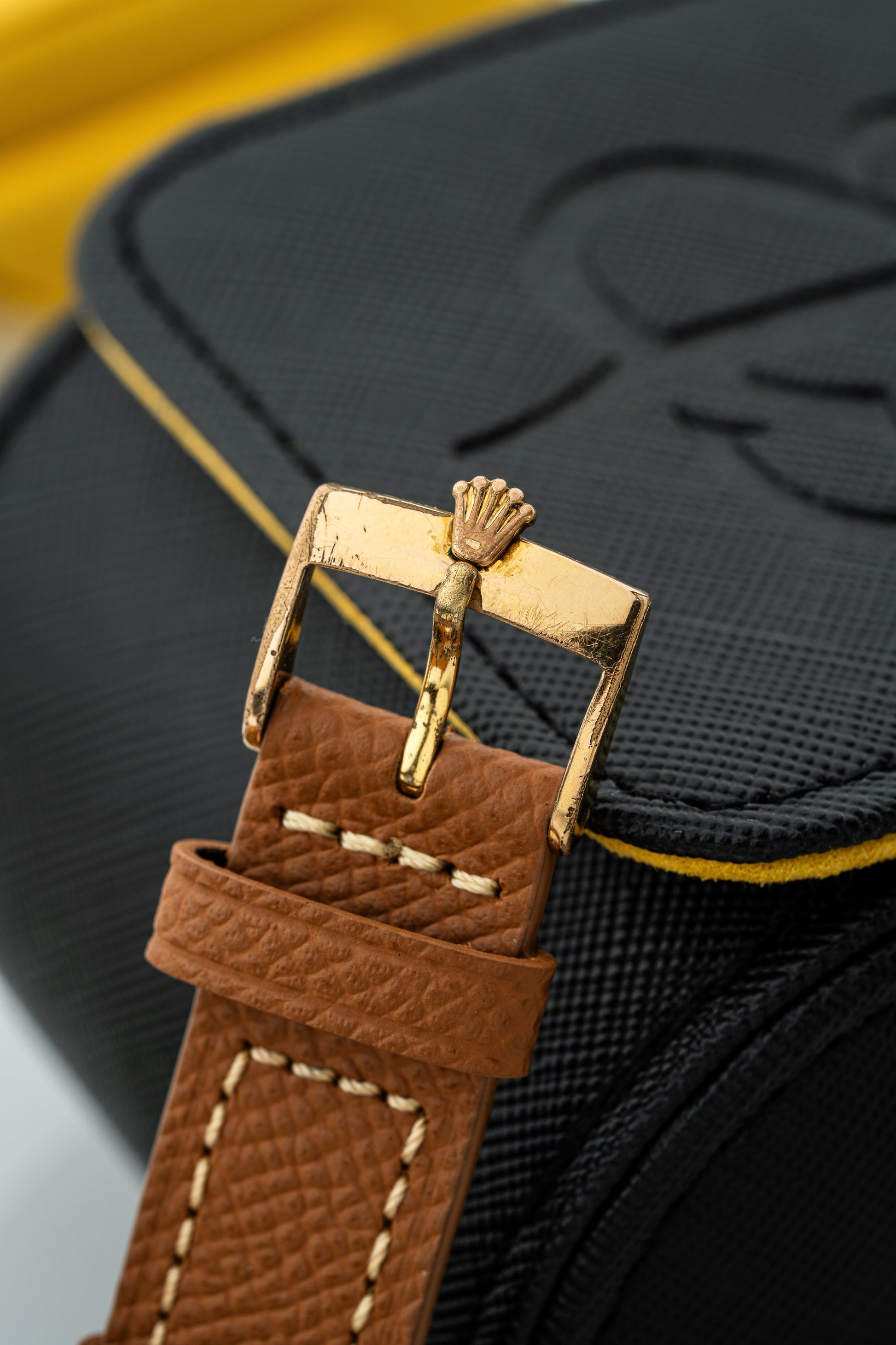 The watch is paired with a generic tan leather strap, and features its original Rolex gold-plated buckle, a charming and authentic period detail that enhances its vintage appeal.