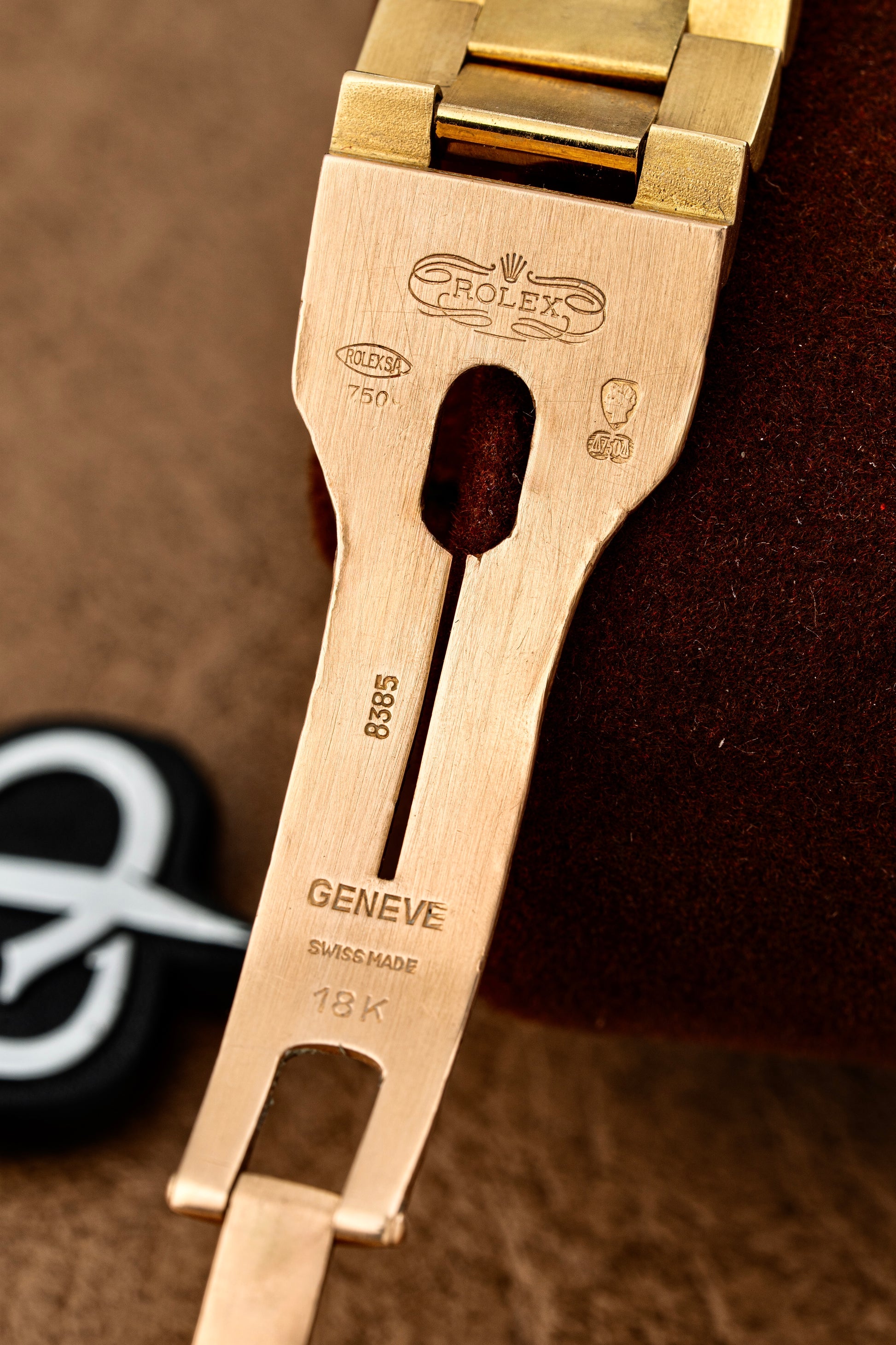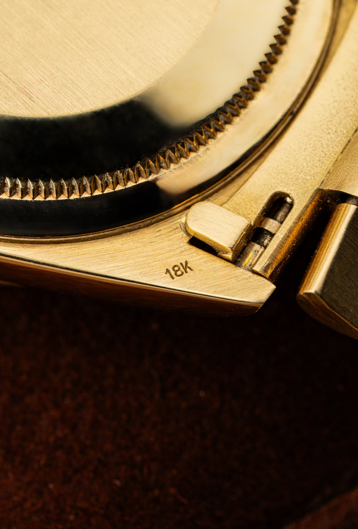 The Ref. 18238 is crafted from solid 18k yellow gold and features a 36mm case, which was the standard size for Day-Date models of this era—perfectly balanced for both formal and everyday wear.