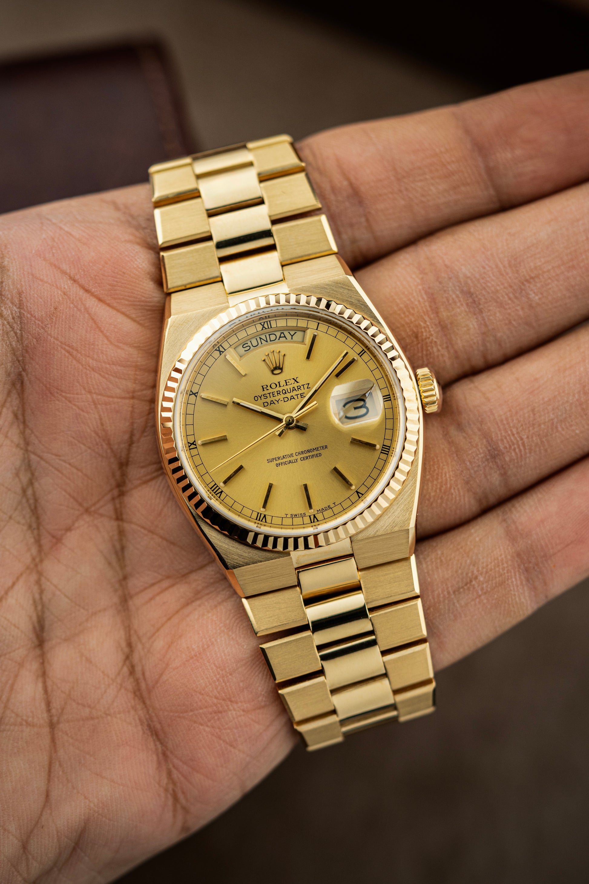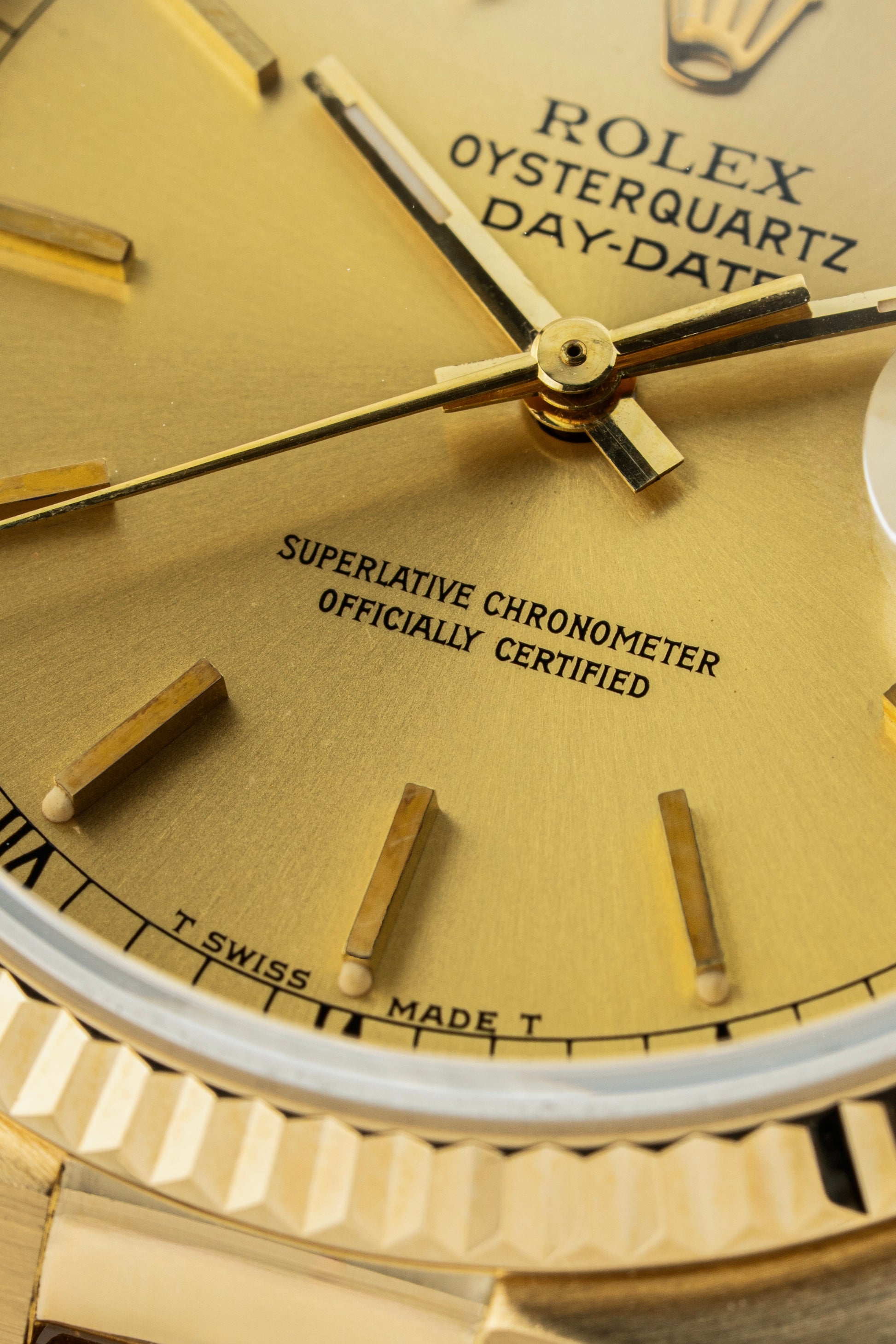 We are pleased to offer for sale a superb example of the Rolex Oysterquartz Day-Date Ref. 19018, dating from 1978 and crafted entirely in solid 18k yellow gold. This early production date places it among the more sought-after Oysterquartz pieces.