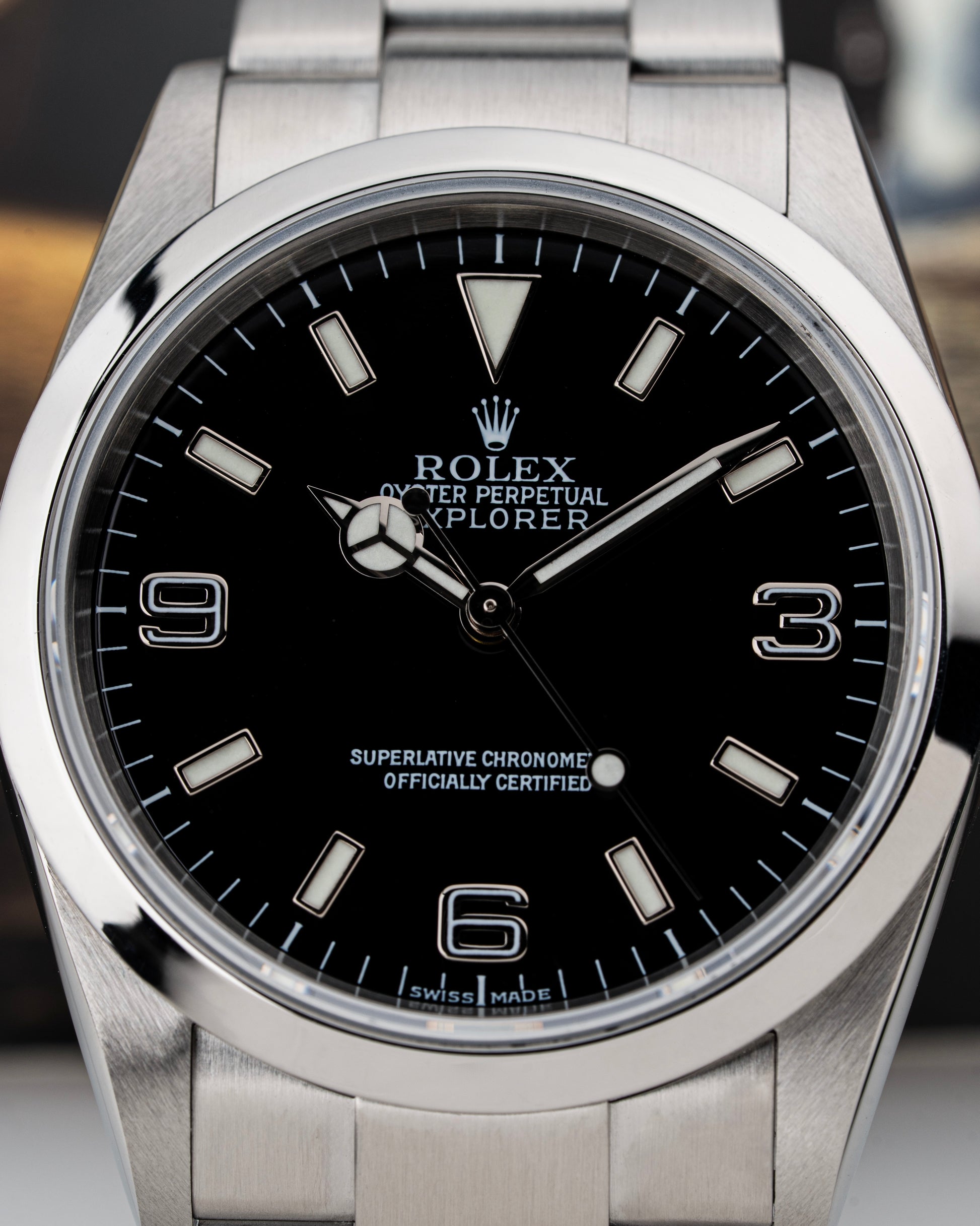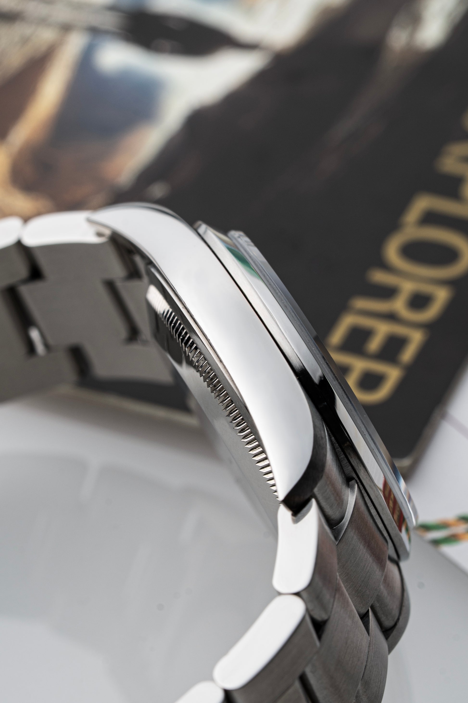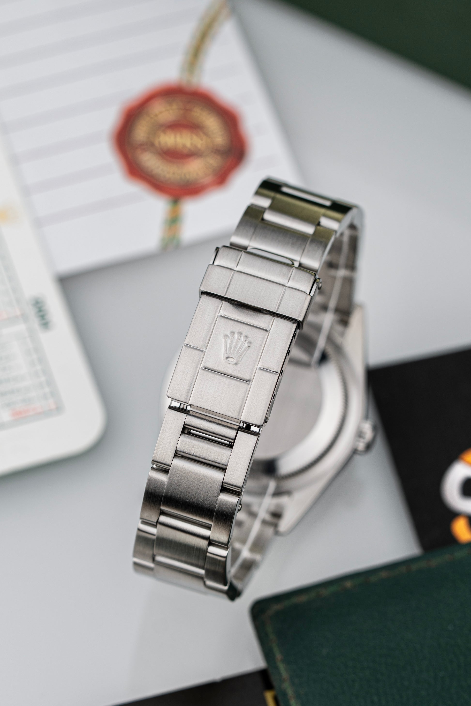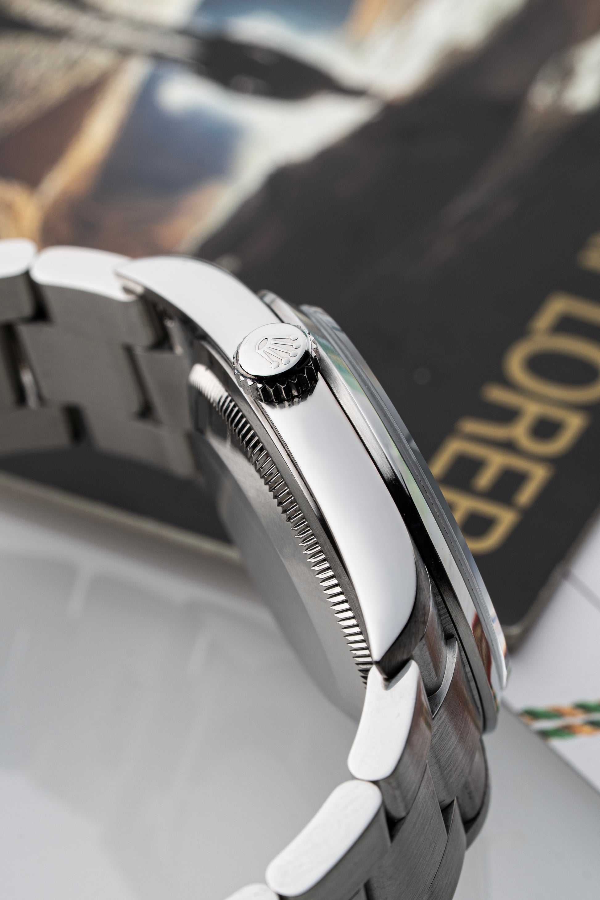 The Rolex Explorer 114270 is known for its durability, simplicity, and historical significance. It maintains the classic Explorer look with a 36mm stainless steel case, oyster bracelet and smooth bezel.