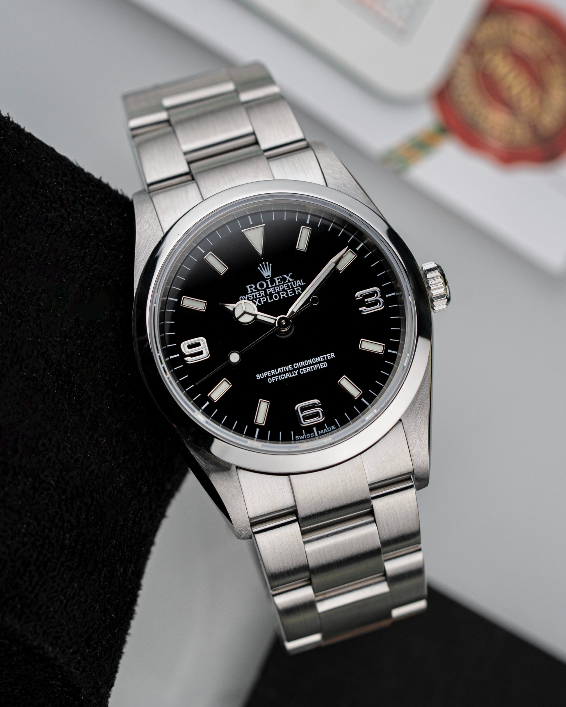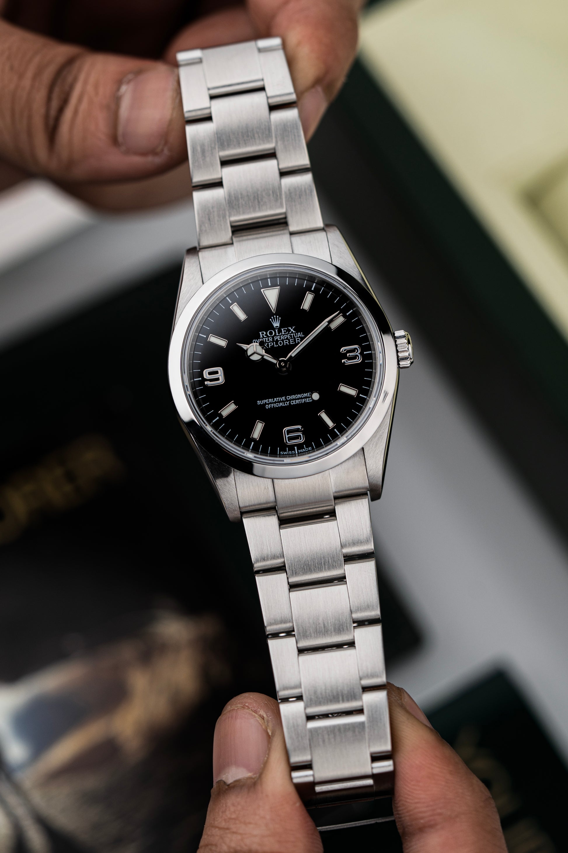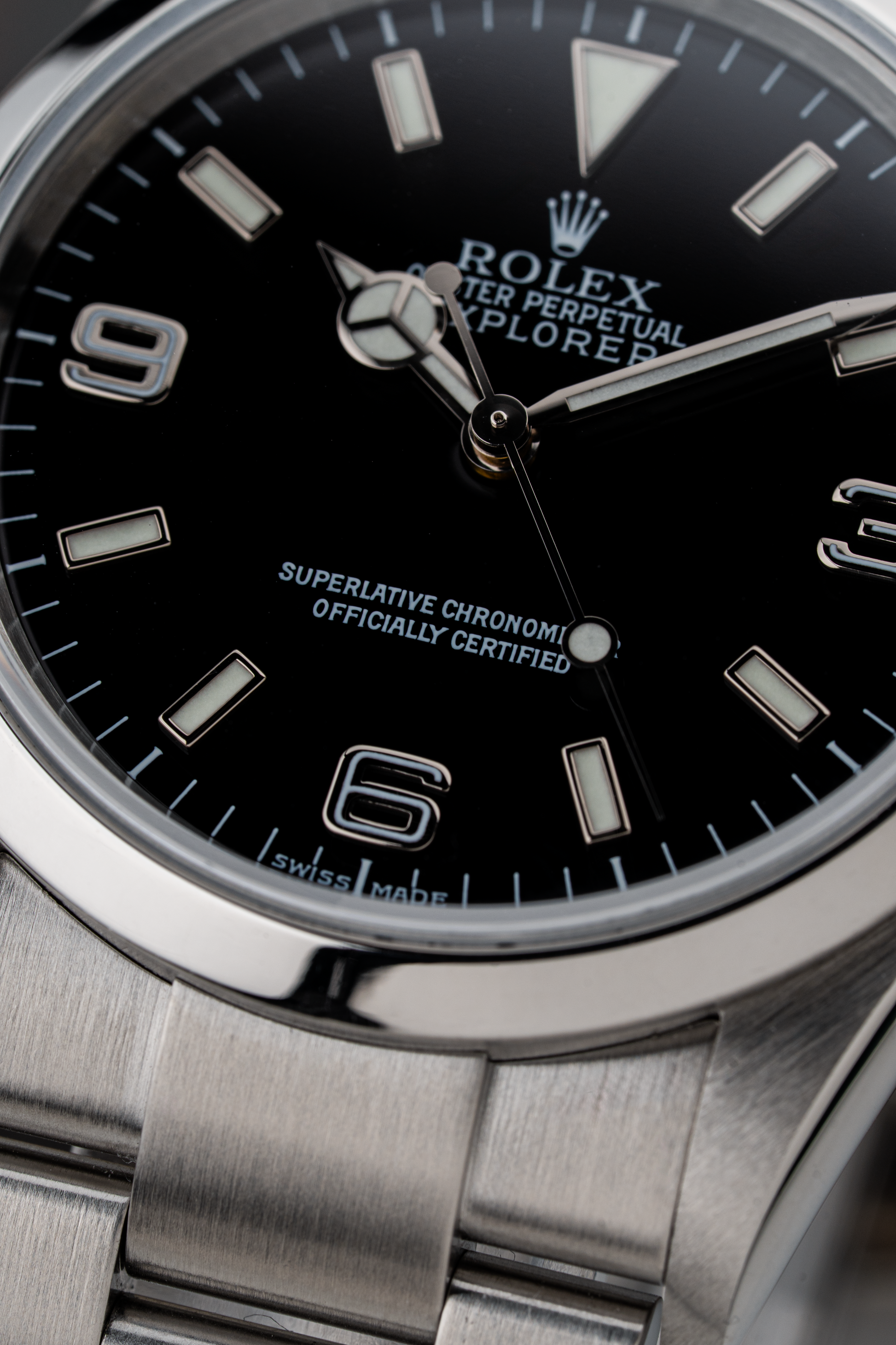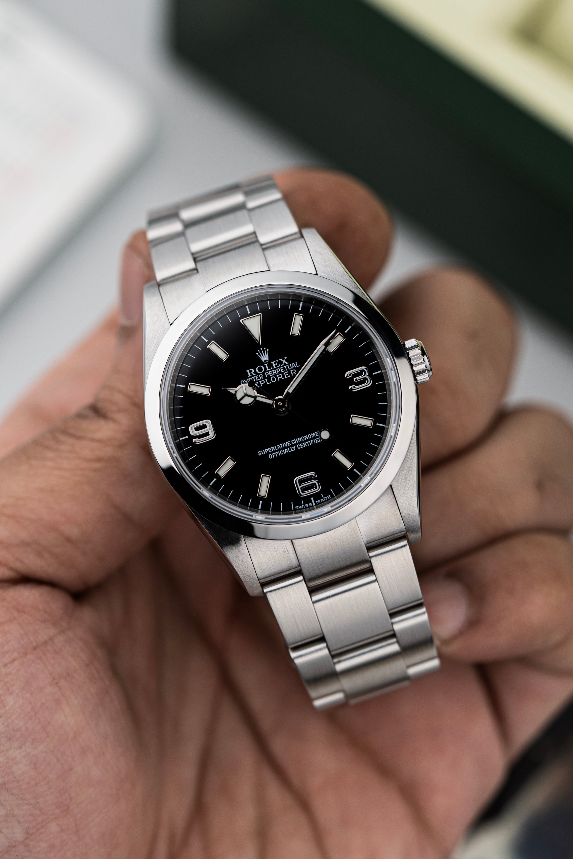 The Rolex Explorer 114270 is known for its durability, simplicity, and historical significance. It maintains the classic Explorer look with a 36mm stainless steel case, oyster bracelet and smooth bezel.