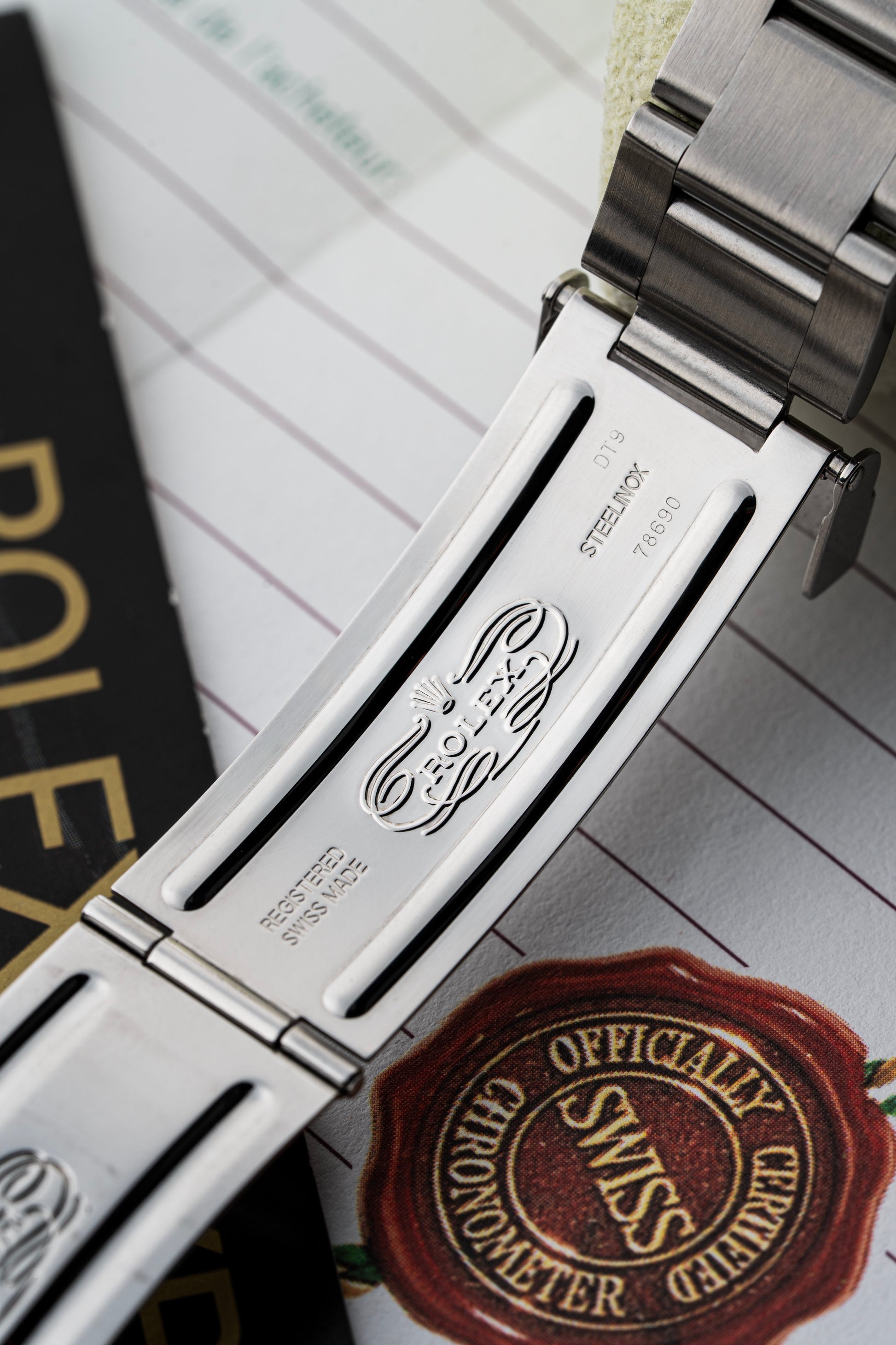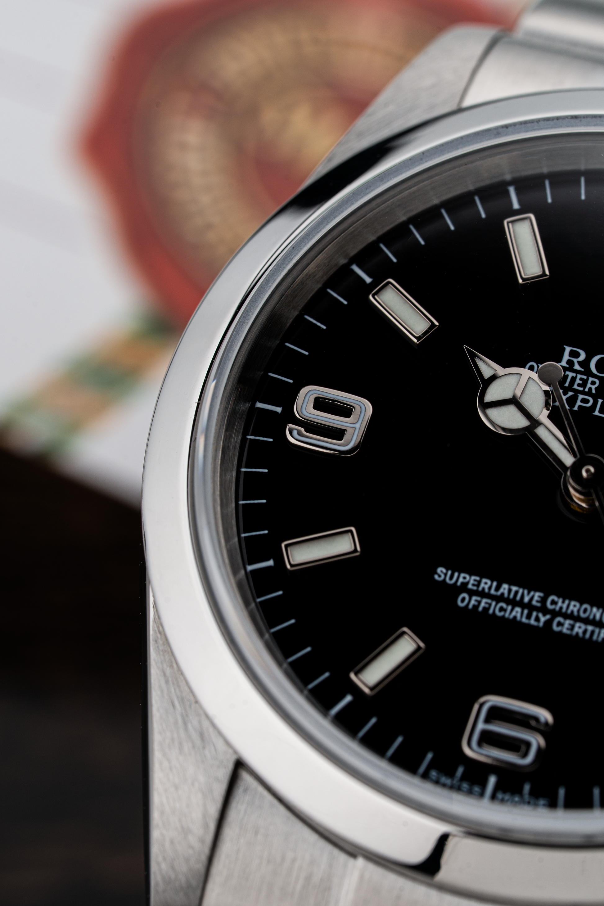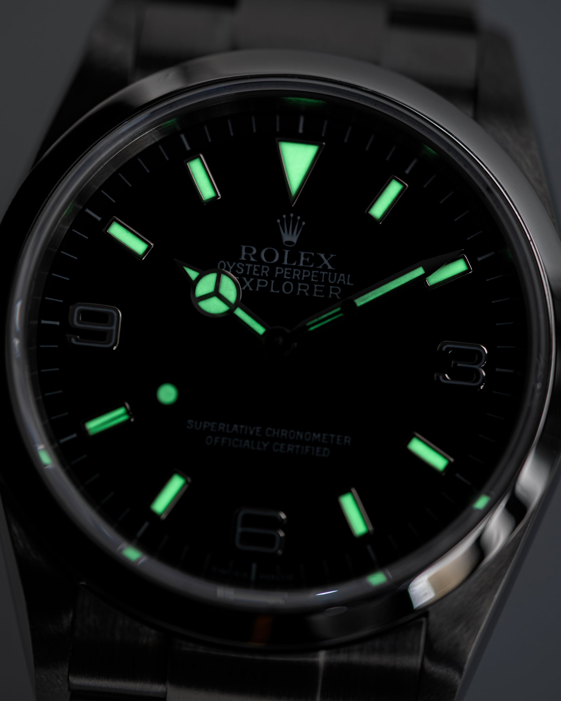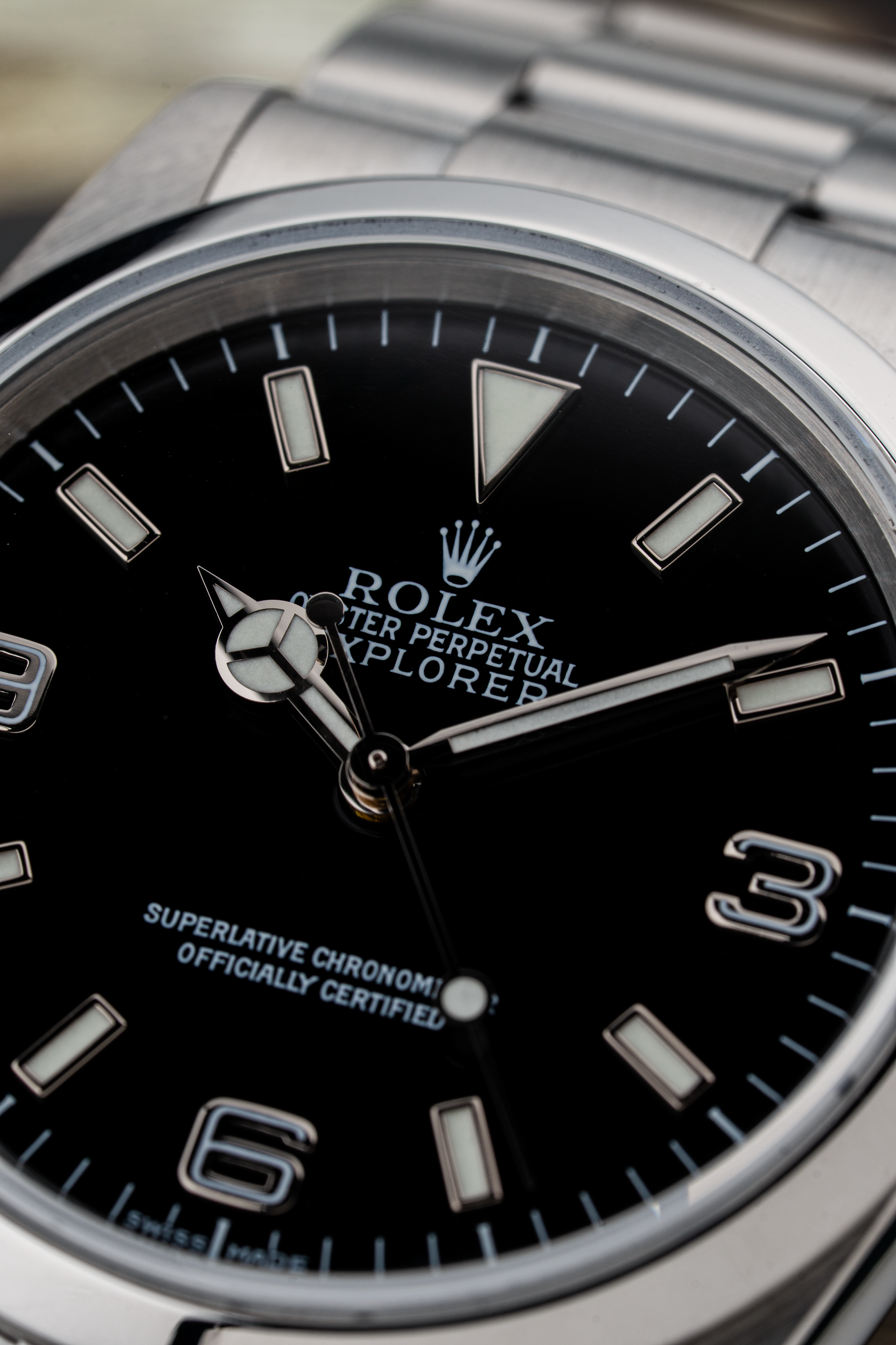 The Rolex Explorer 114270 is known for its durability, simplicity, and historical significance. It maintains the classic Explorer look with a 36mm stainless steel case, oyster bracelet and smooth bezel.
