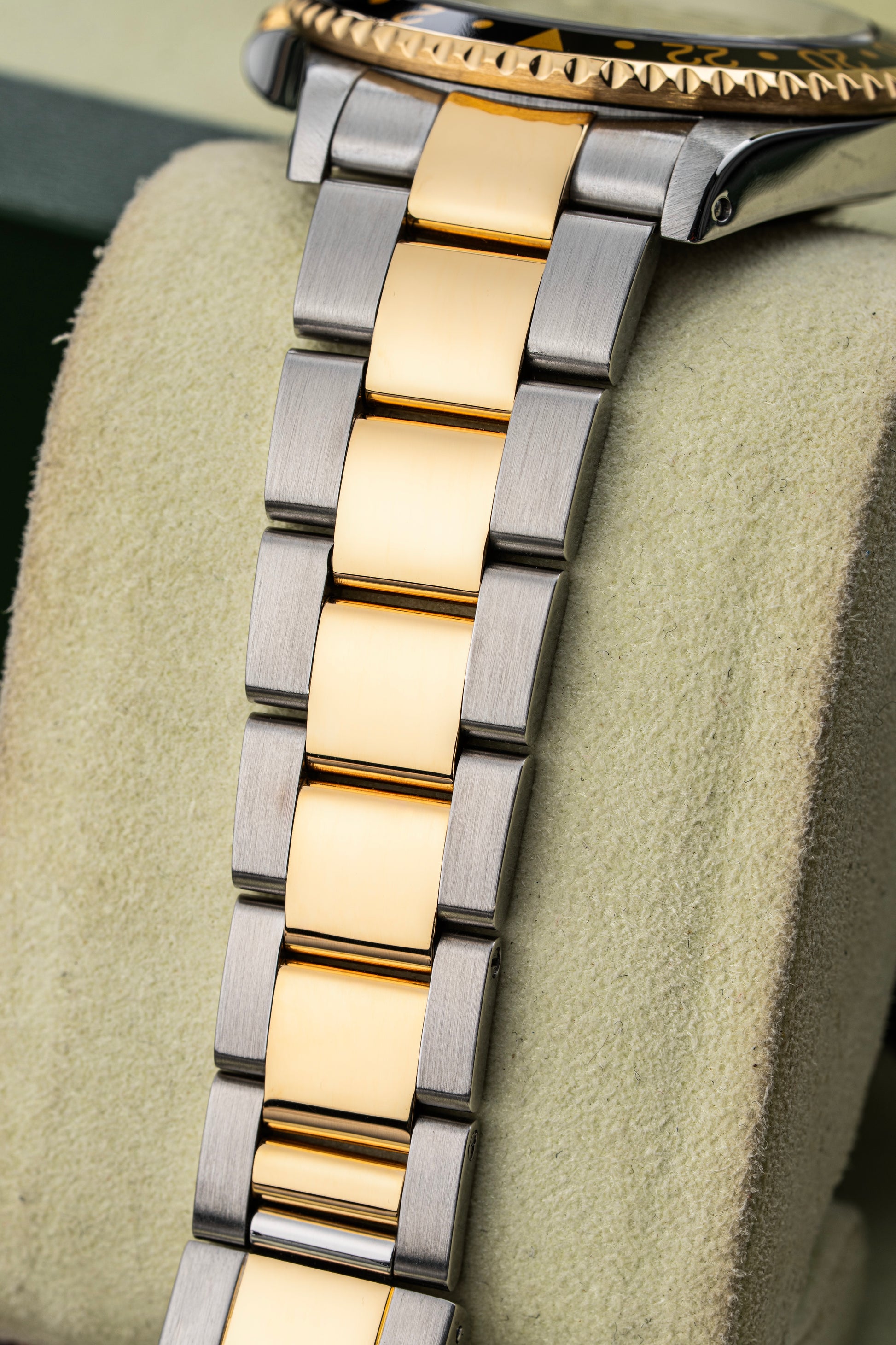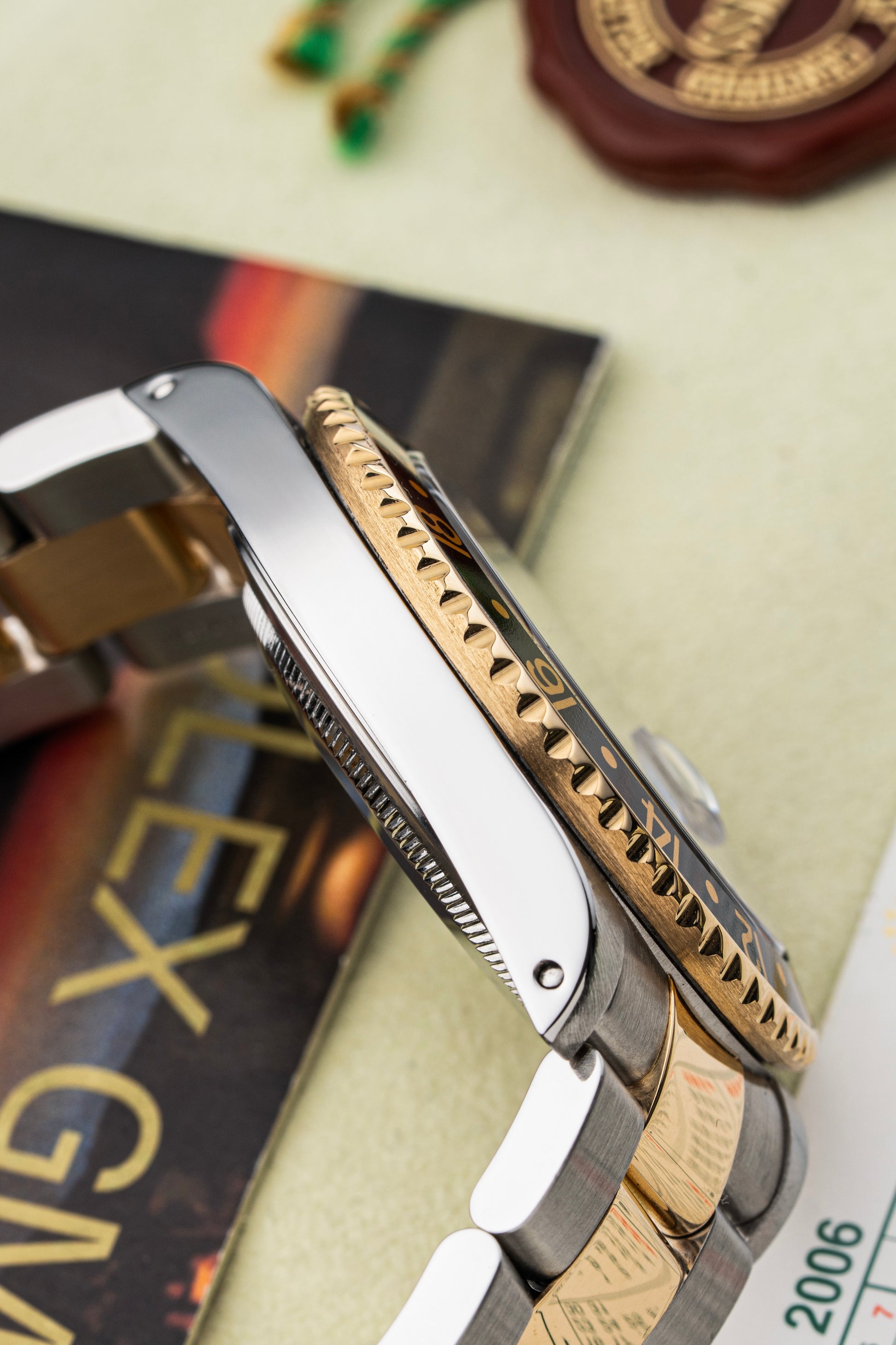 This model is fitted with a black aluminum bezel insert featuring gold numerals, lending the watch a sleek and elegant appearance. The bi-directional bezel is used in conjunction with the 24-hour GMT hand to track a second time zone.