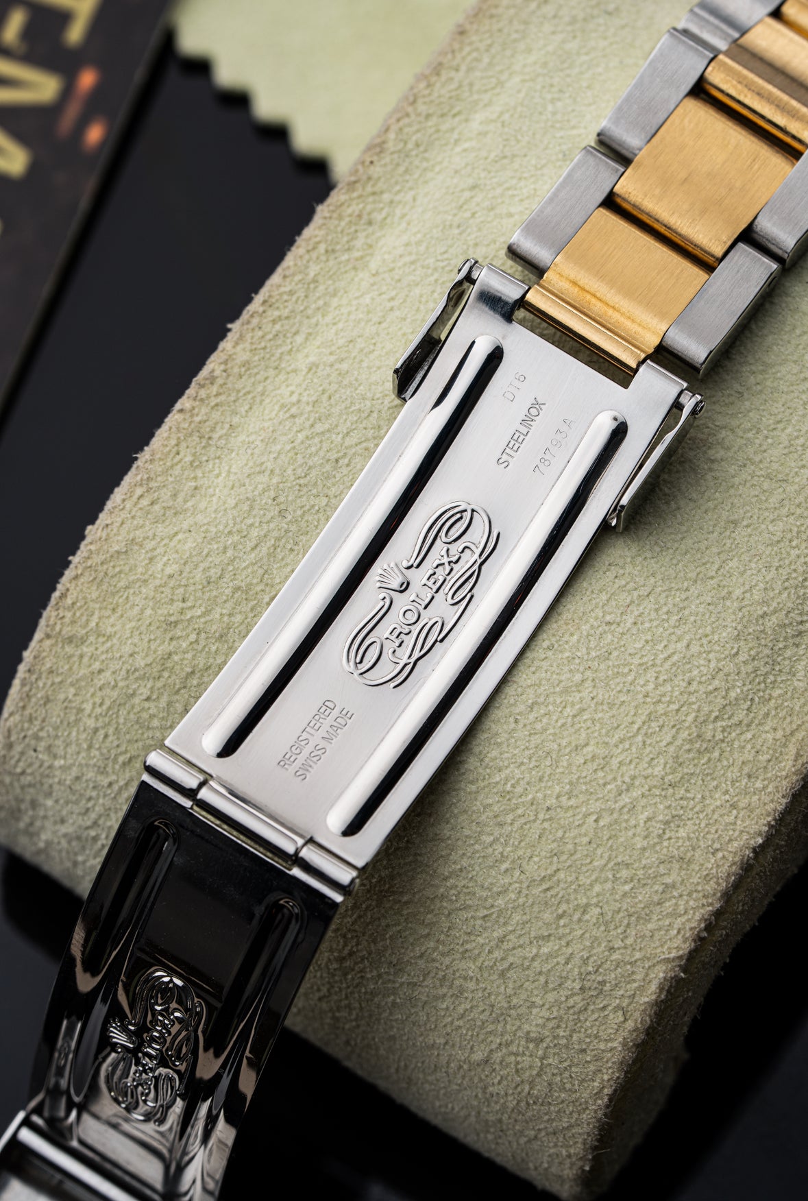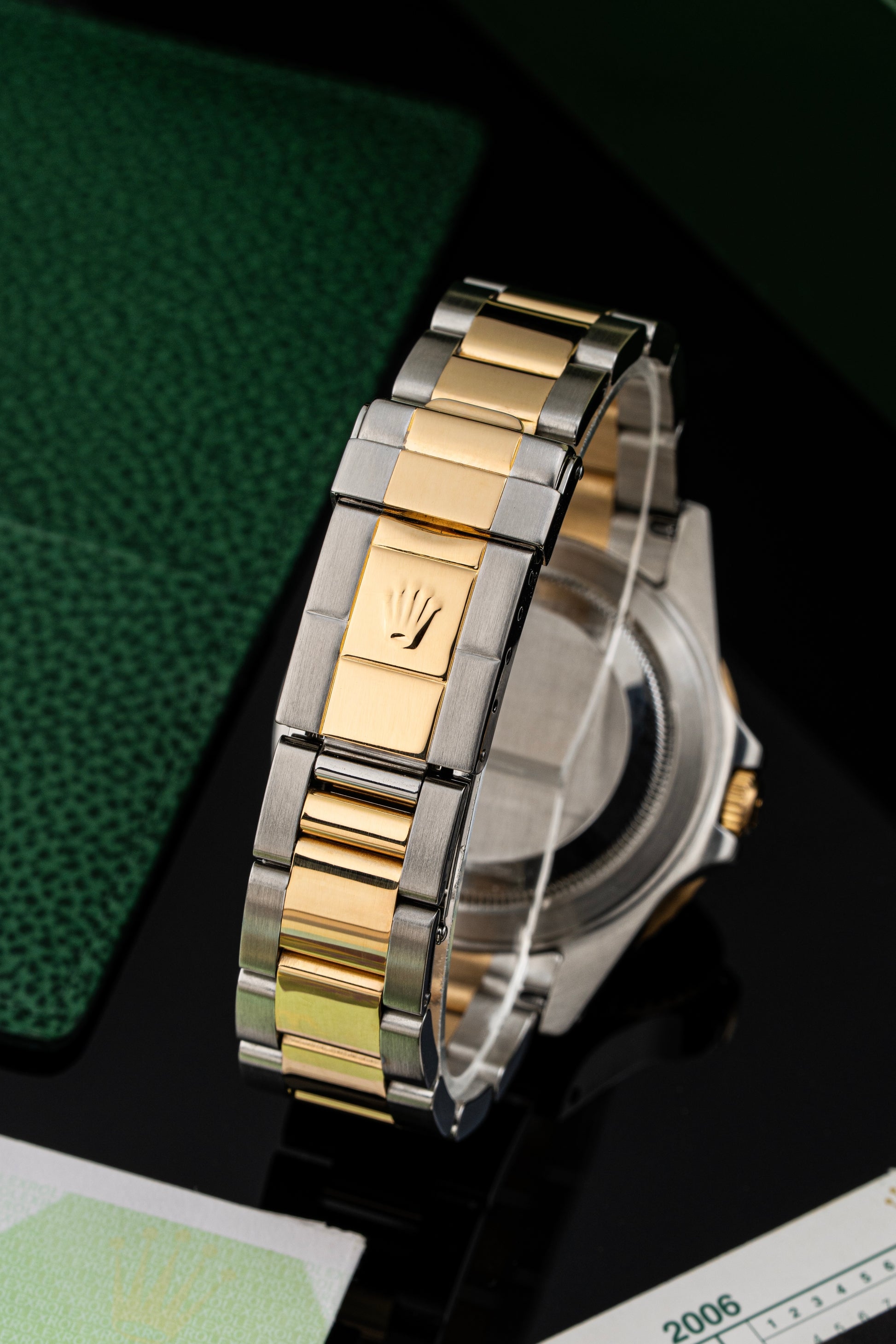 The watch comes on a Rolex Oyster bracelet in stainless steel and 18k yellow gold, known for its durability and comfort. The polished gold center links add a touch of sophistication, while the folding Oysterlock clasp ensures secure wear.