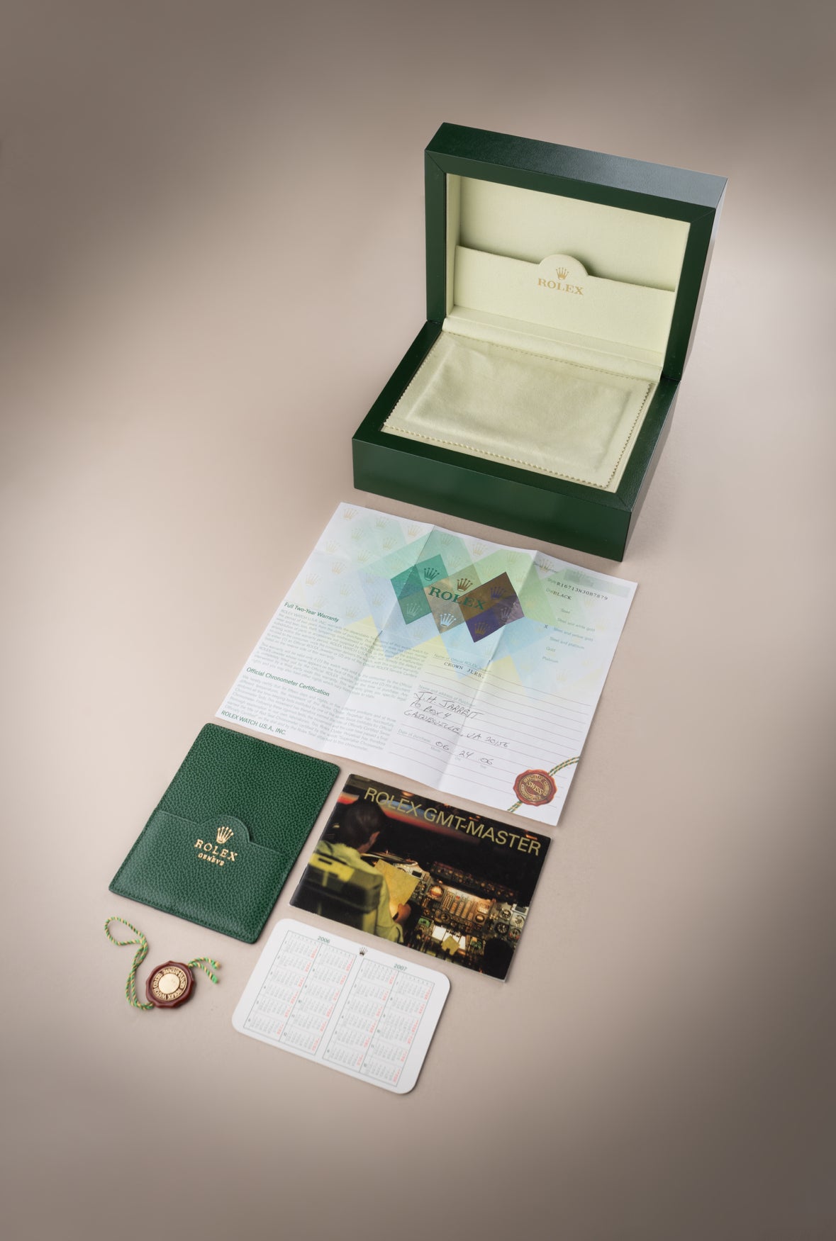 Up for sale is a Rolex GMT-Master II Ref. 16713, a classic dual-time sports watch from Rolex, produced in 2006 and offered here as a complete set with everything it originally came with from the factory.
