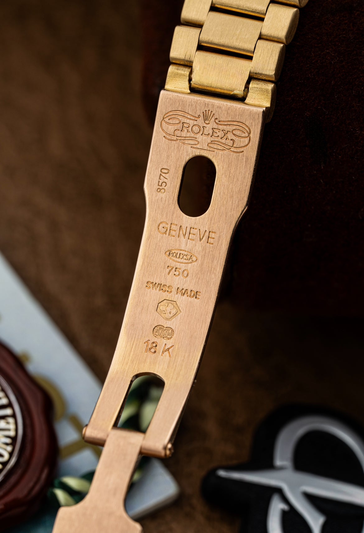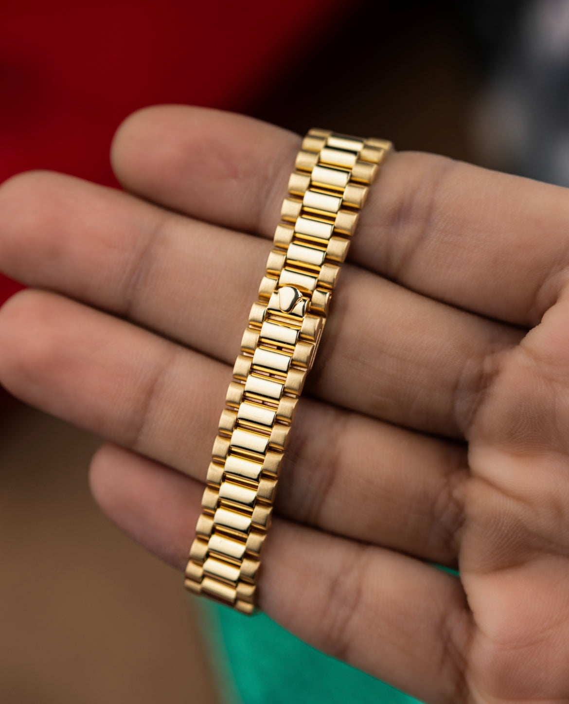 The watch is fitted with its original 18k yellow gold President bracelet, the iconic triple-link design that provides both comfort and unmistakable elegance. The bracelet is in excellent condition, and while the clasp remains fully functional, it is worth noting that the coronet logo has been slightly over-polished. The silhouette of the coronet is still visible, though the finer details have been smoothed.