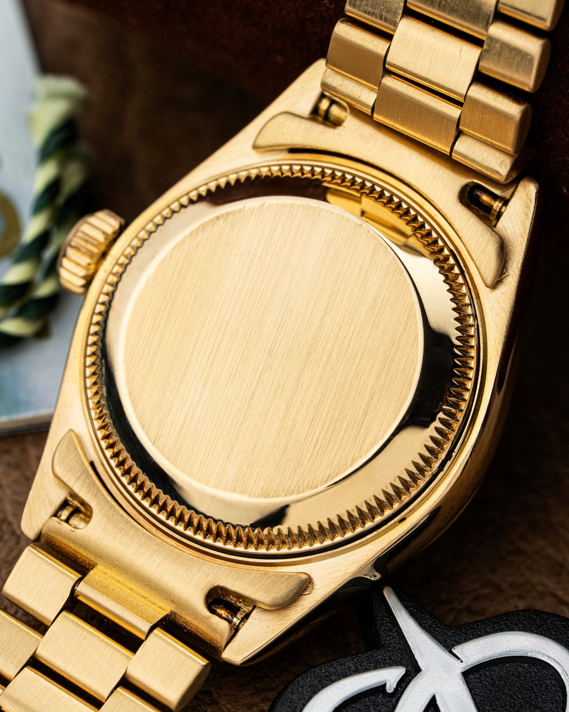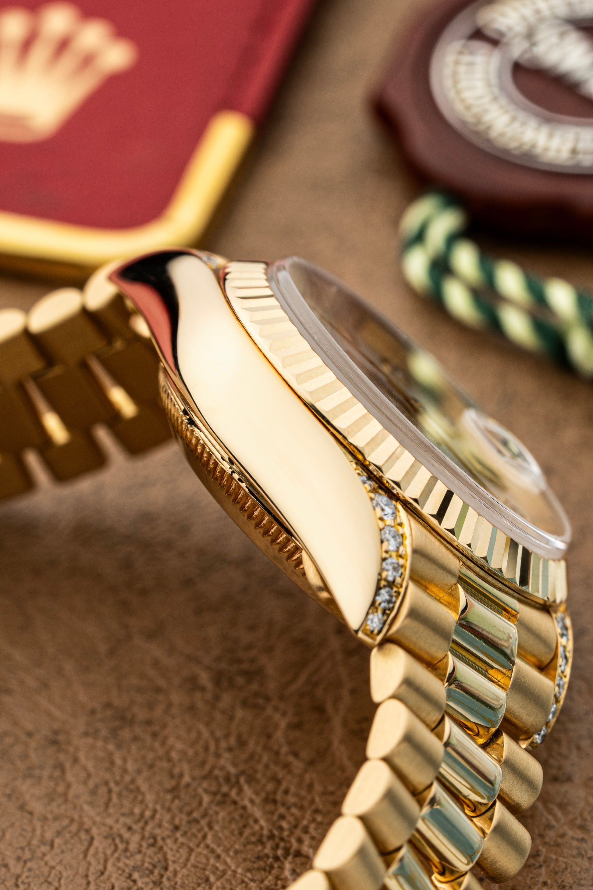 One of the standout features of this reference is its factory-set diamond lugs, an attribute rarely encountered and highly sought after. The diamonds add an elevated touch of brilliance, framing the case with elegant sparkle and enhancing the watch’s already opulent yellow-gold construction.