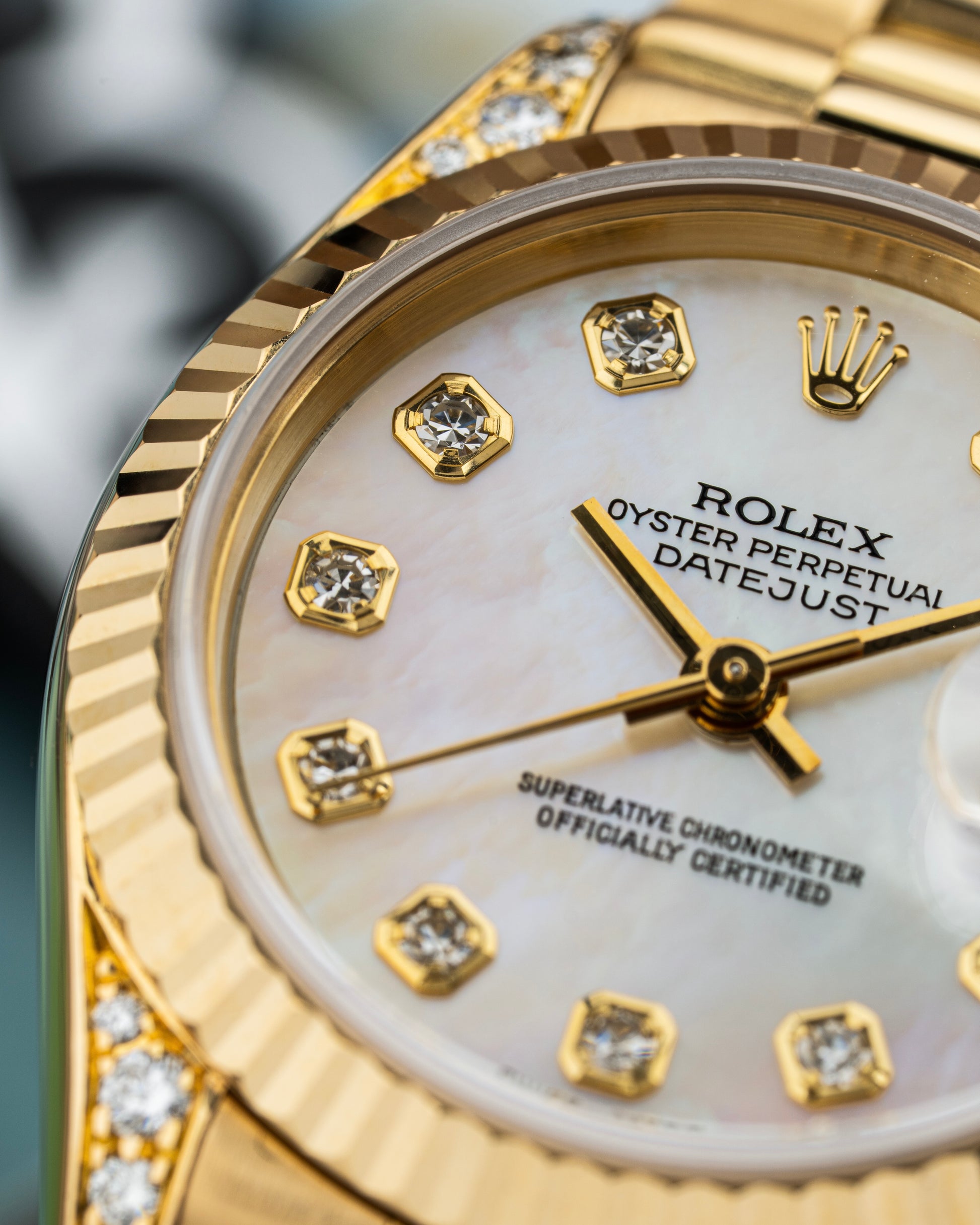 This example features a factory mother-of-pearl diamond dial, each hour marker set with a brilliant-cut diamond. The natural iridescence of the MOP surface shifts across tones of pearlescent white, pink, and silver depending on the light—offering a unique, ever-changing visual character. Combined with the diamond lugs, the dial creates a sophisticated and luxurious aesthetic that remains unmistakably Rolex.
