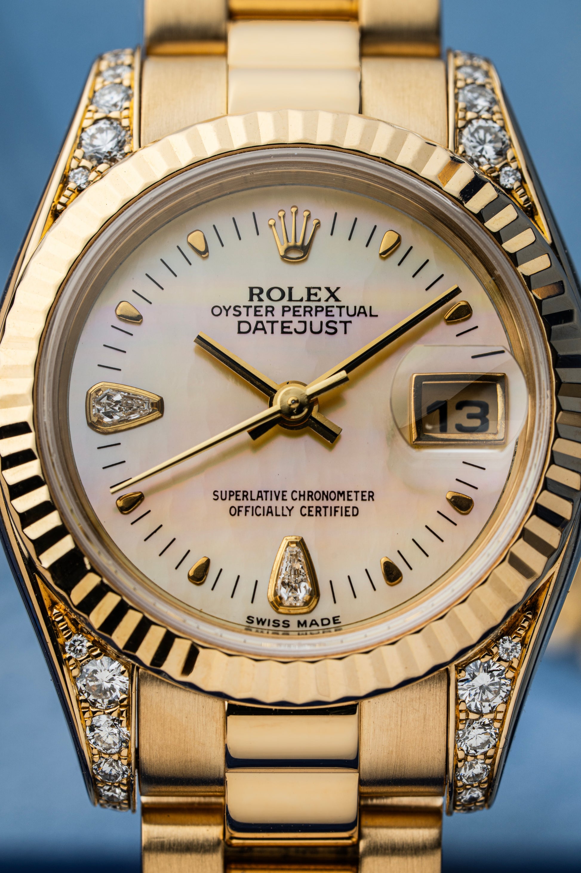 For sale is a beautiful and rare Rolex Lady-Datejust Ref. 179238, crafted entirely from solid 18k yellow gold and featuring highly desirable factory diamond-set lugs along with an exquisite factory mother-of-pearl dial with teardrop diamond hour markers at 6 and 9 o’clock.