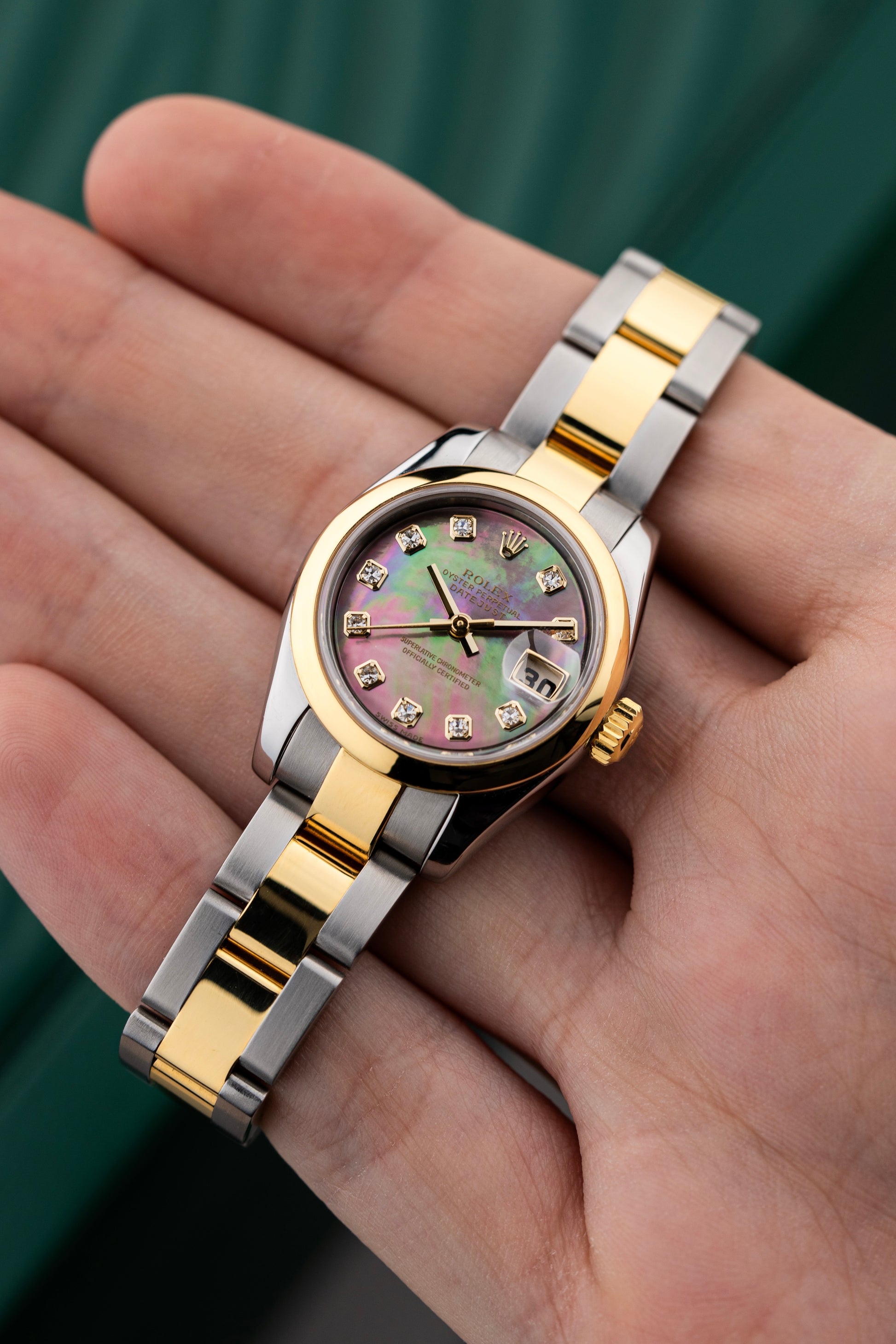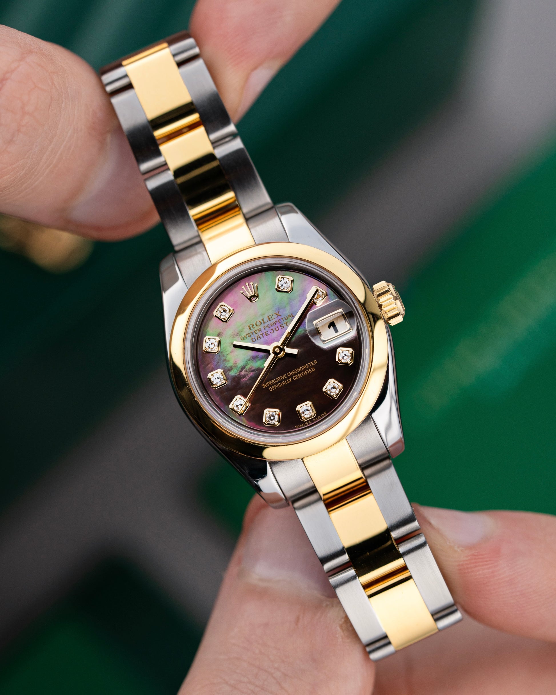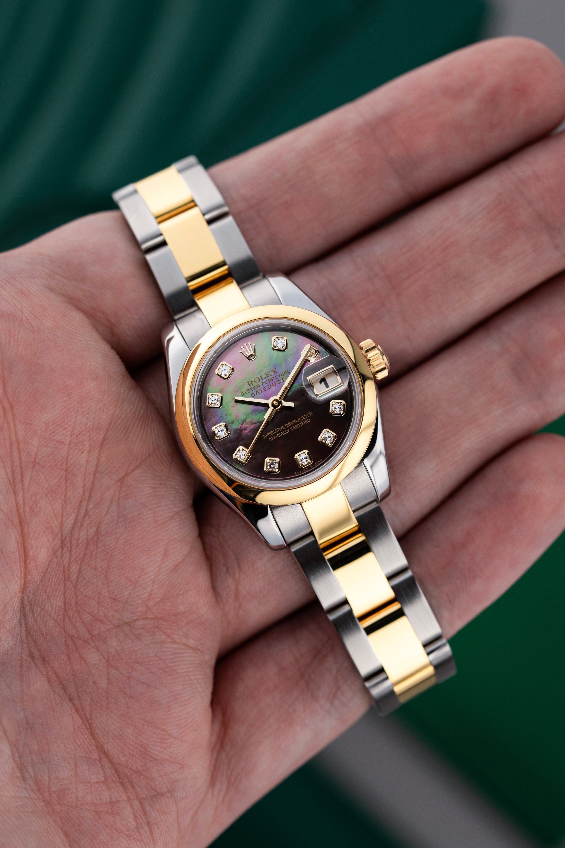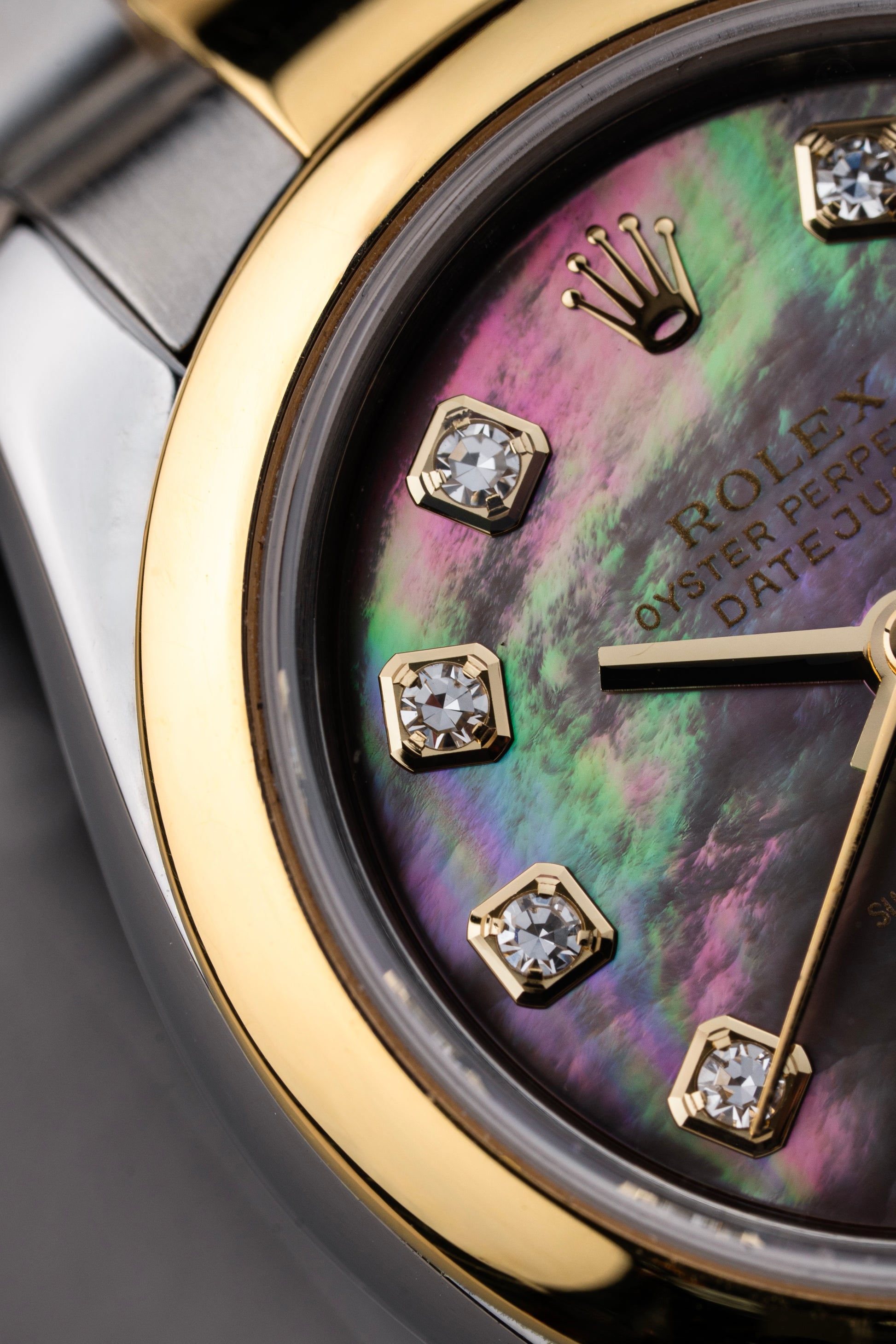 For sale is a Ladies Rolex Datejust 26mm Ref. 179163 in Steel & 18k Yellow Gold with a Rare Factory Tahitian Mother of Pearl Diamond Dial.