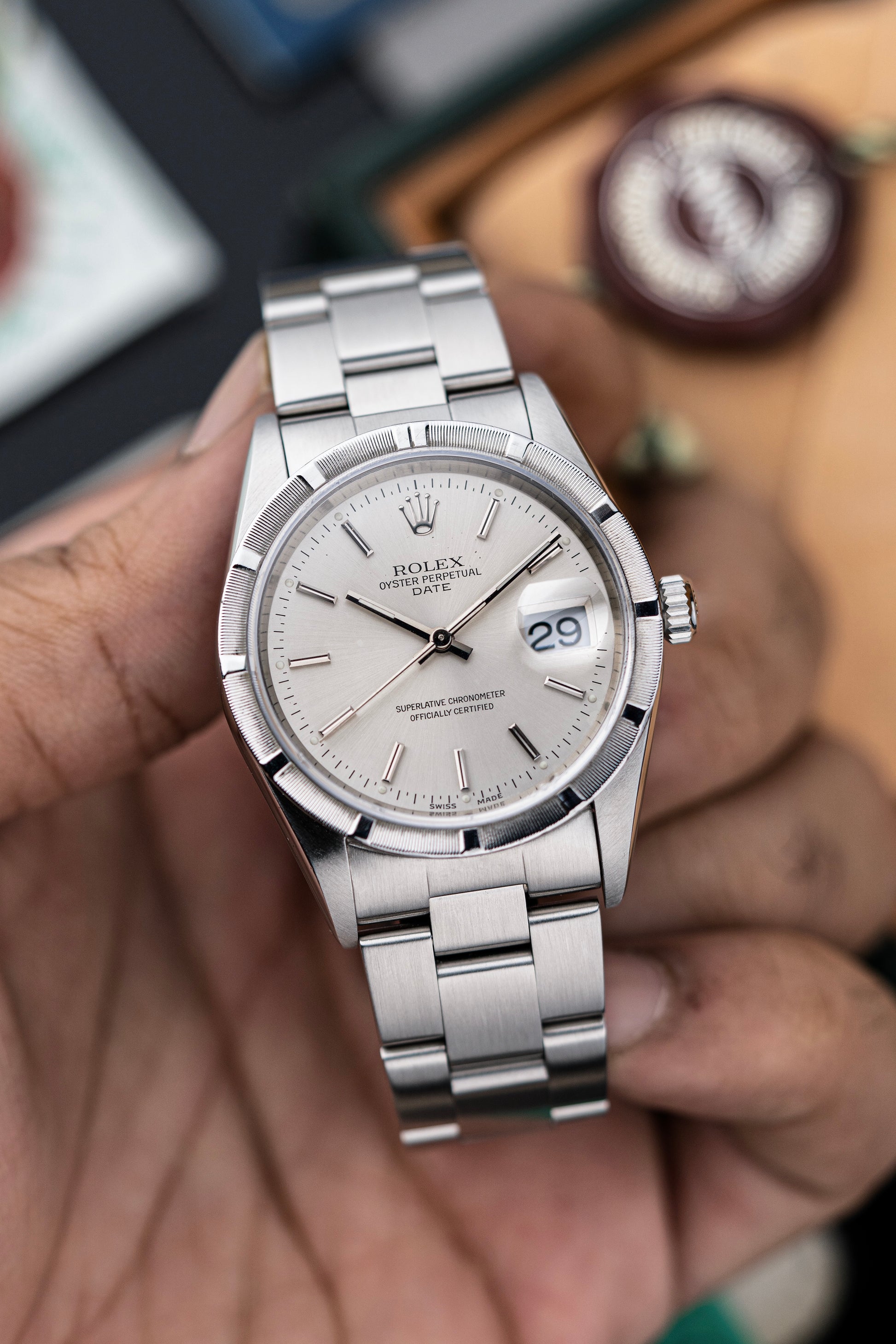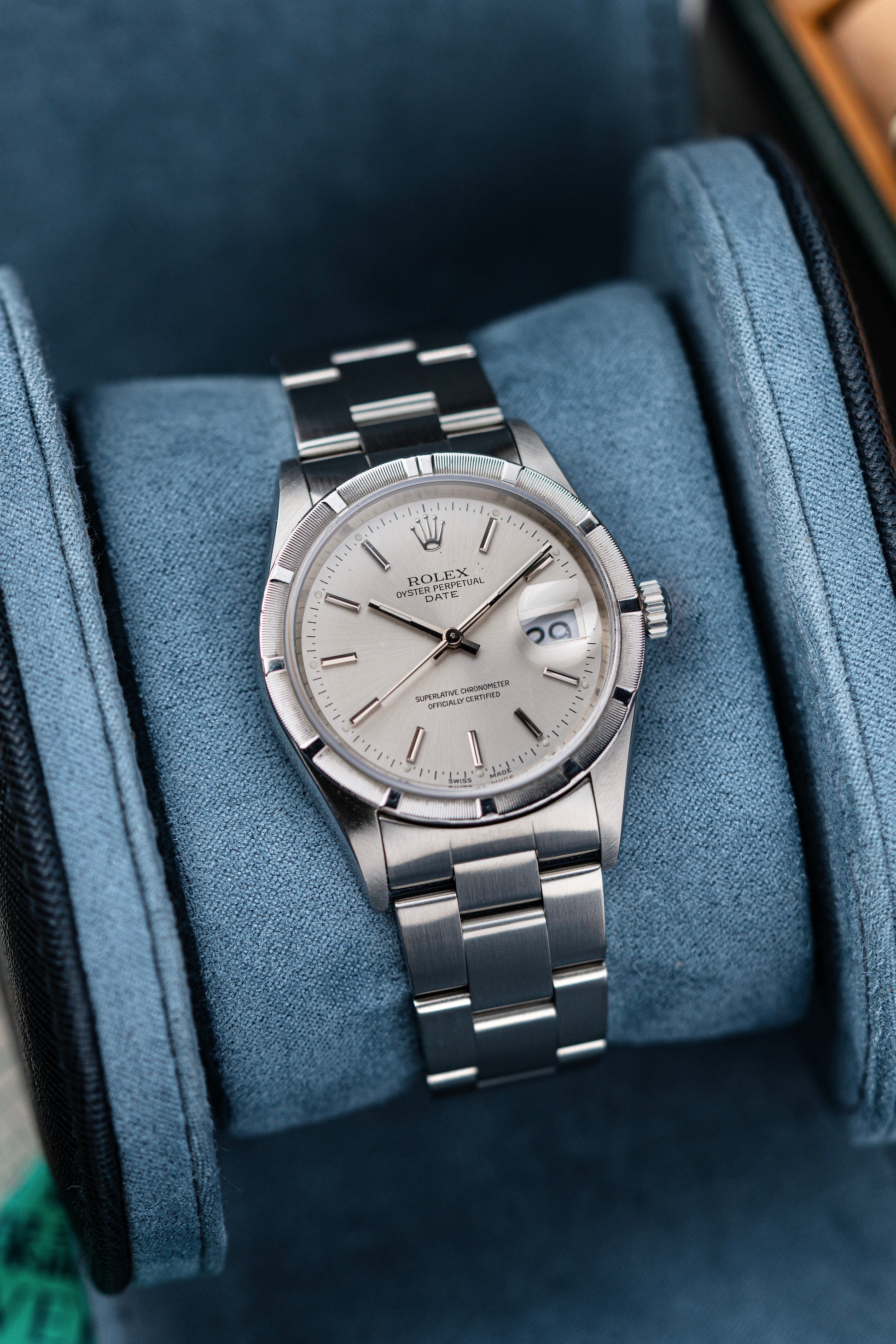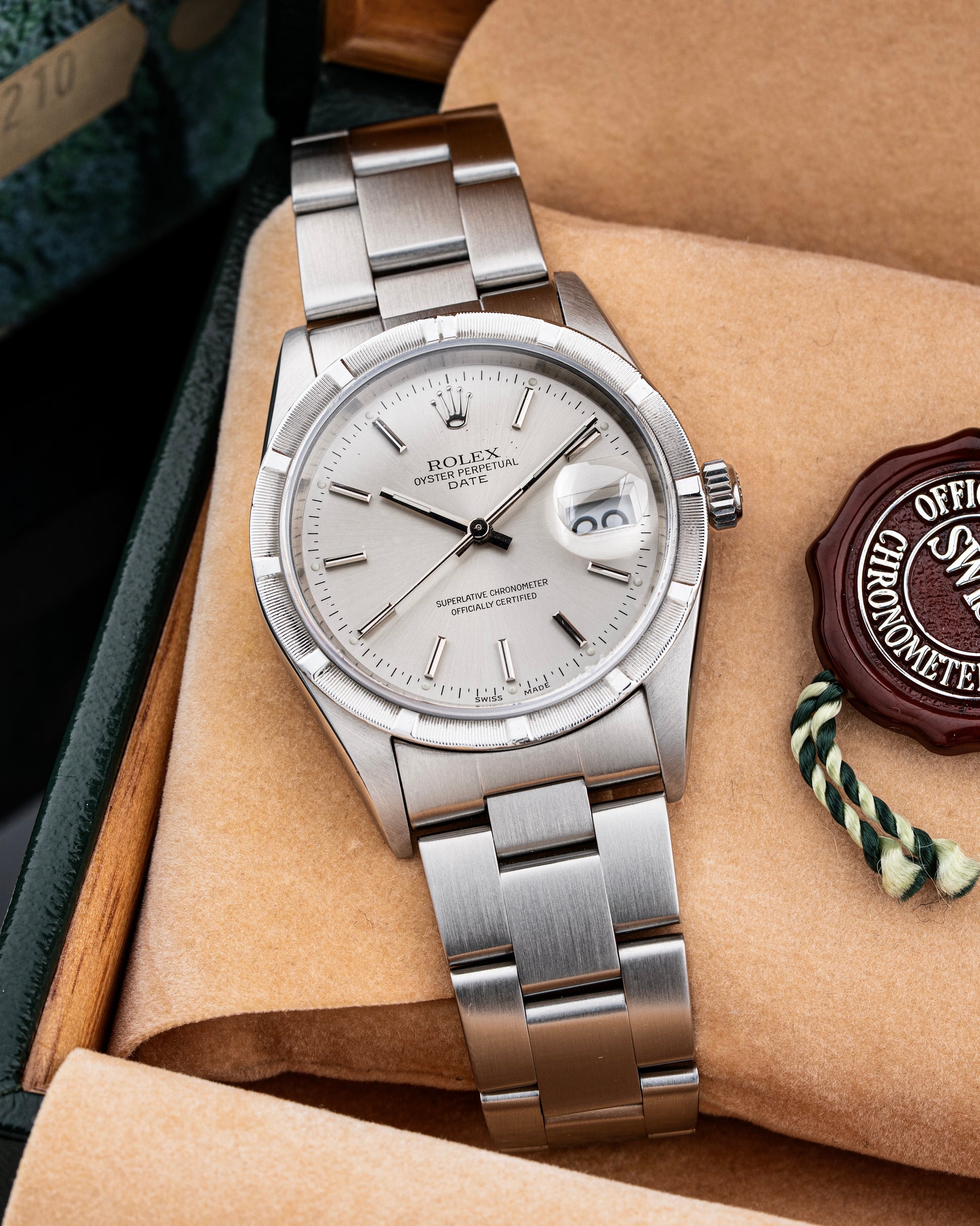 The Rolex Oyster Perpetual Date Ref. 15210 is a timeless classic from Rolex’s mid-size collection. At 34mm, it offers a versatile case size suitable for a wide range of wrists, pairing robust Oystersteel construction with the brand’s signature refinement. This reference stands out with its distinctive engine-turned bezel, a design element that adds texture and character to the watch while maintaining understated elegance.