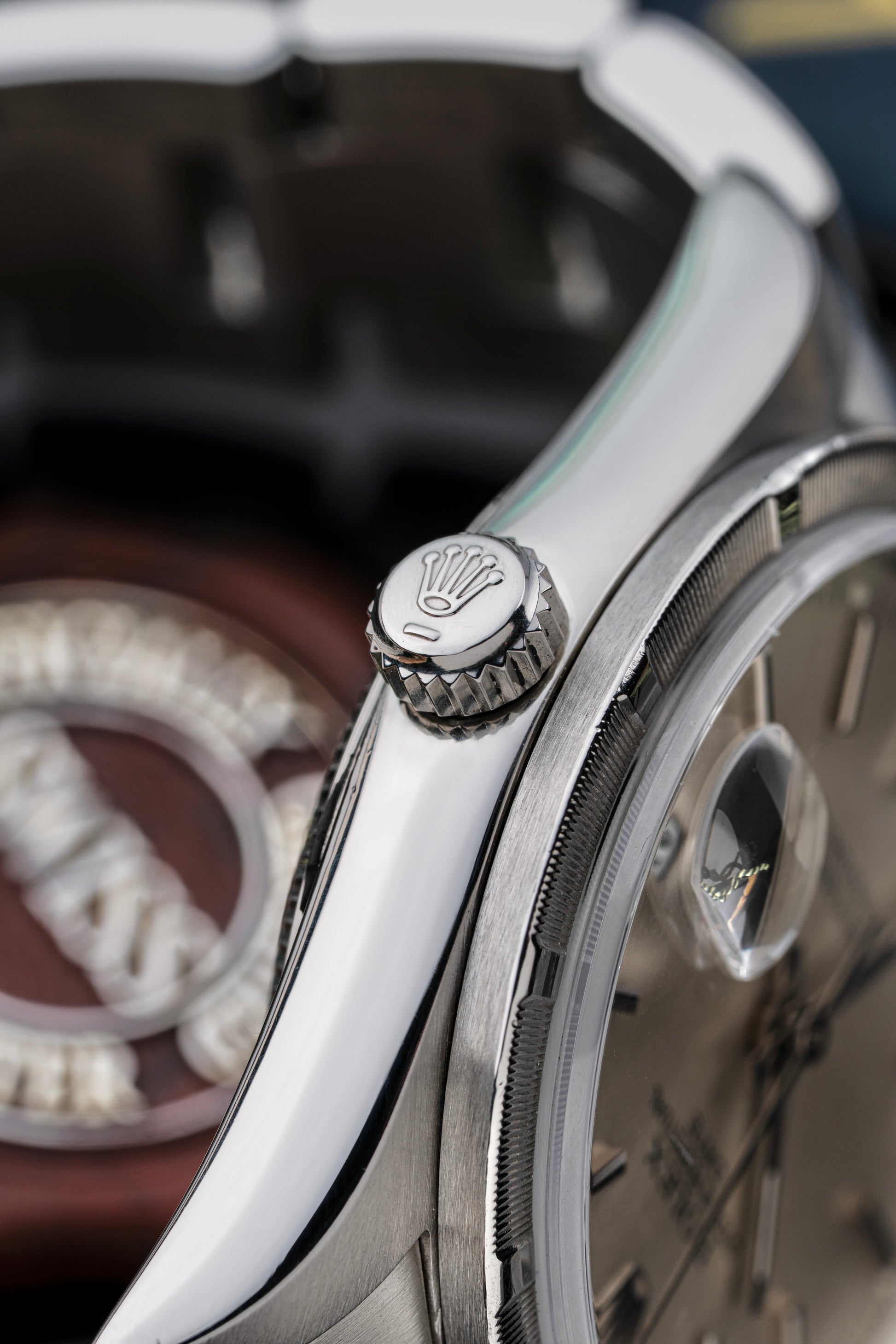 The watch features a refined silver sunburst dial, furnished with white gold baton hour markers and hands. The date is displayed at 3 O’clock which is magnified by the cyclops lens on the sapphire crystal.