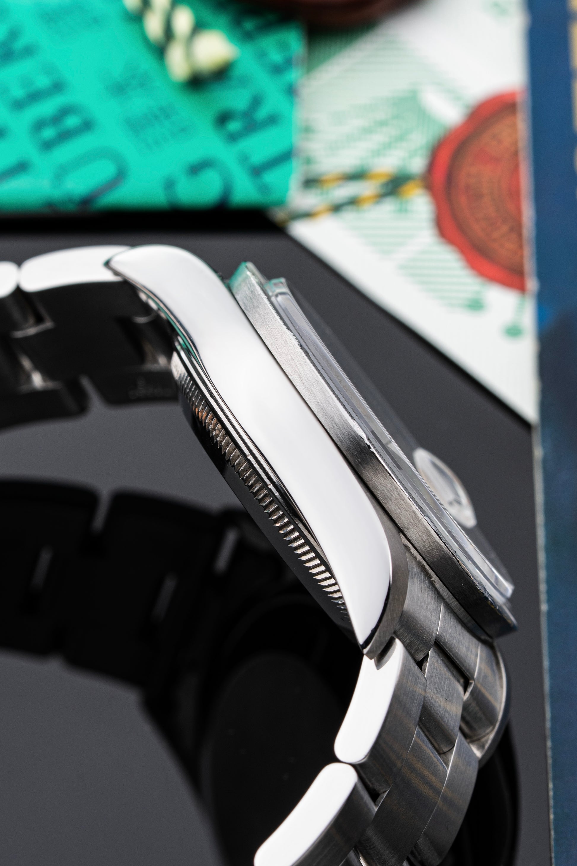 Measuring 34mm in diameter, the Oyster case is crafted from stainless steel and fitted with an engine-turned bezel — a distinctive feature that provides a sporty yet refined aesthetic.