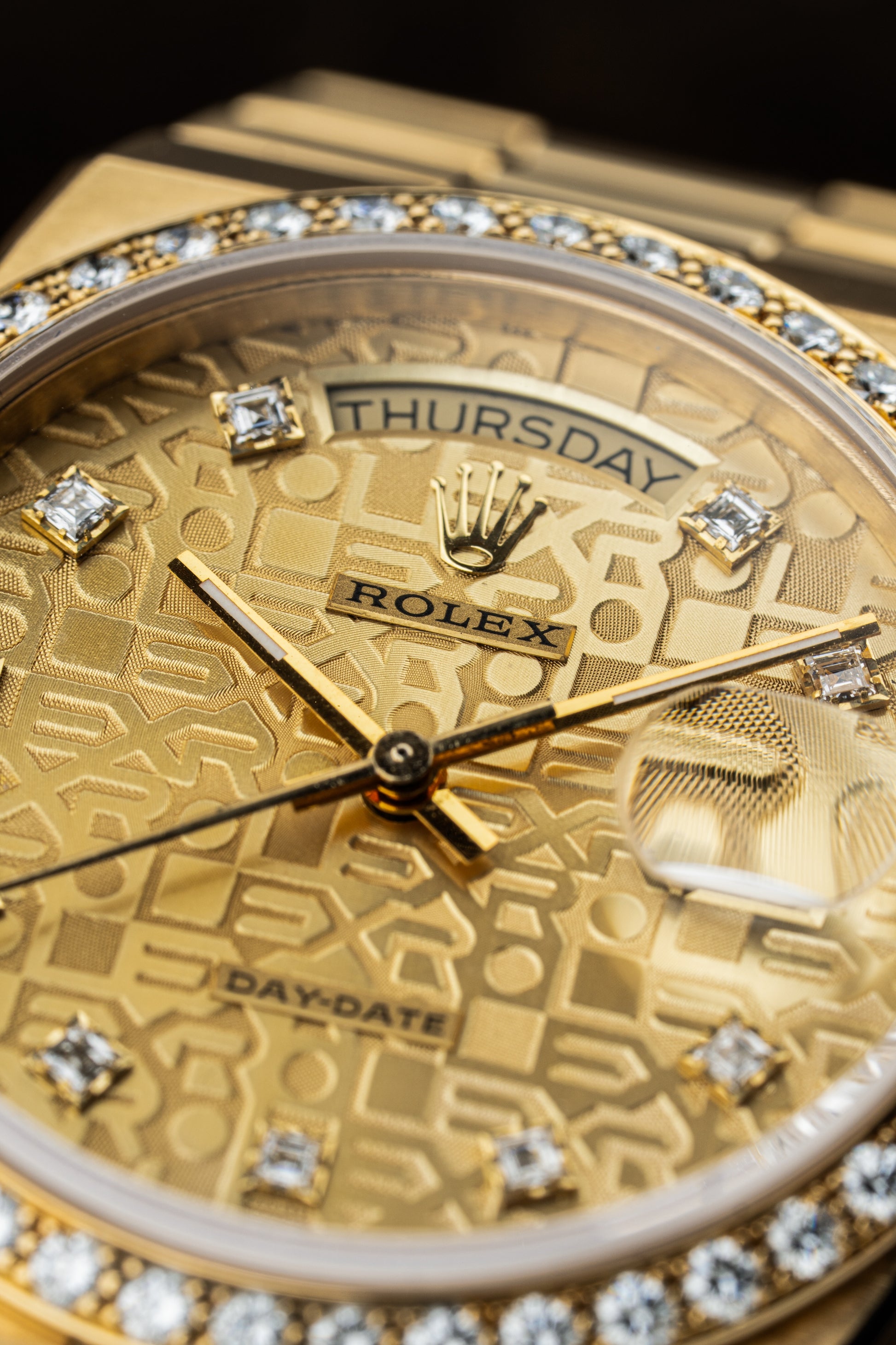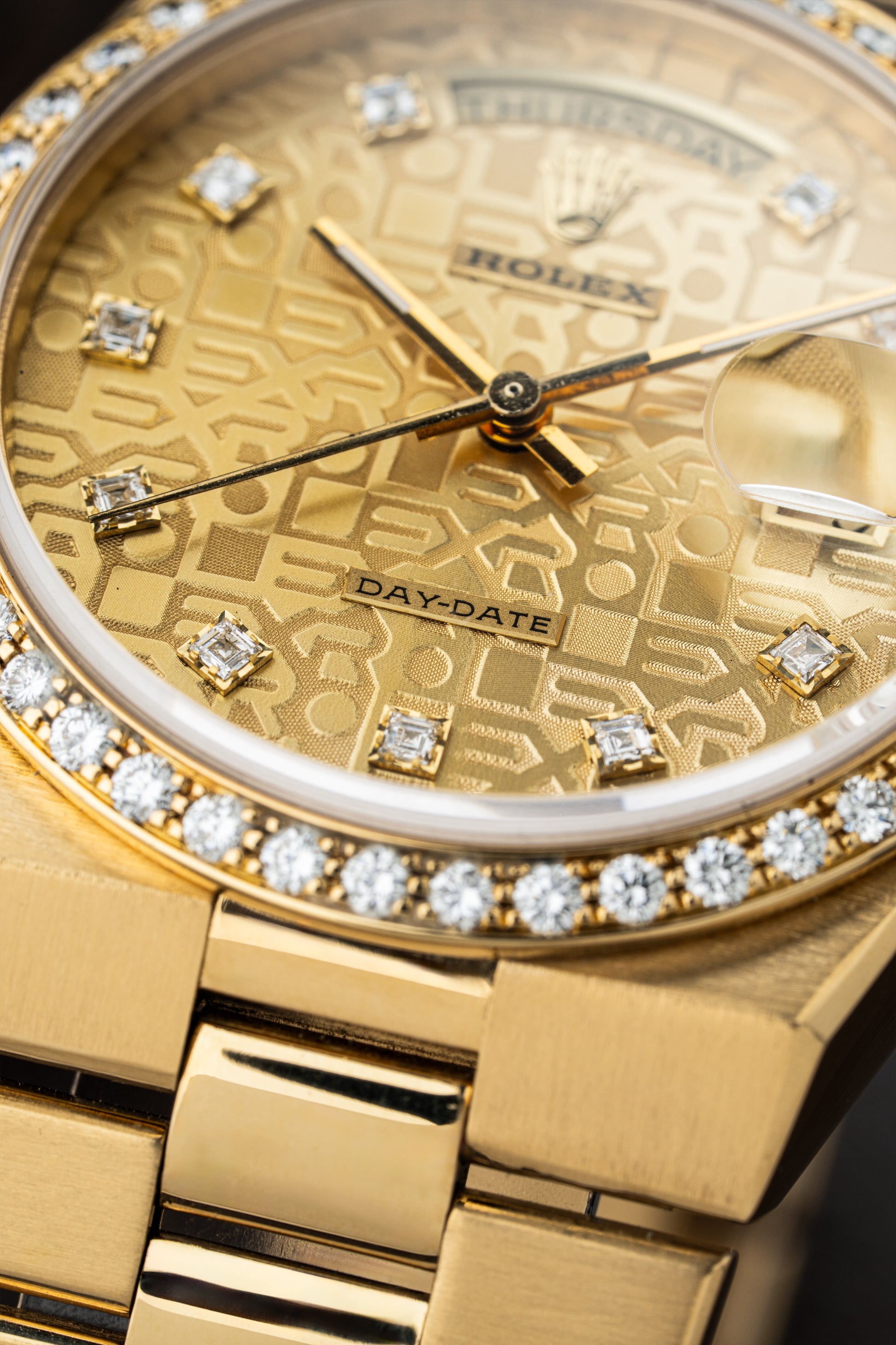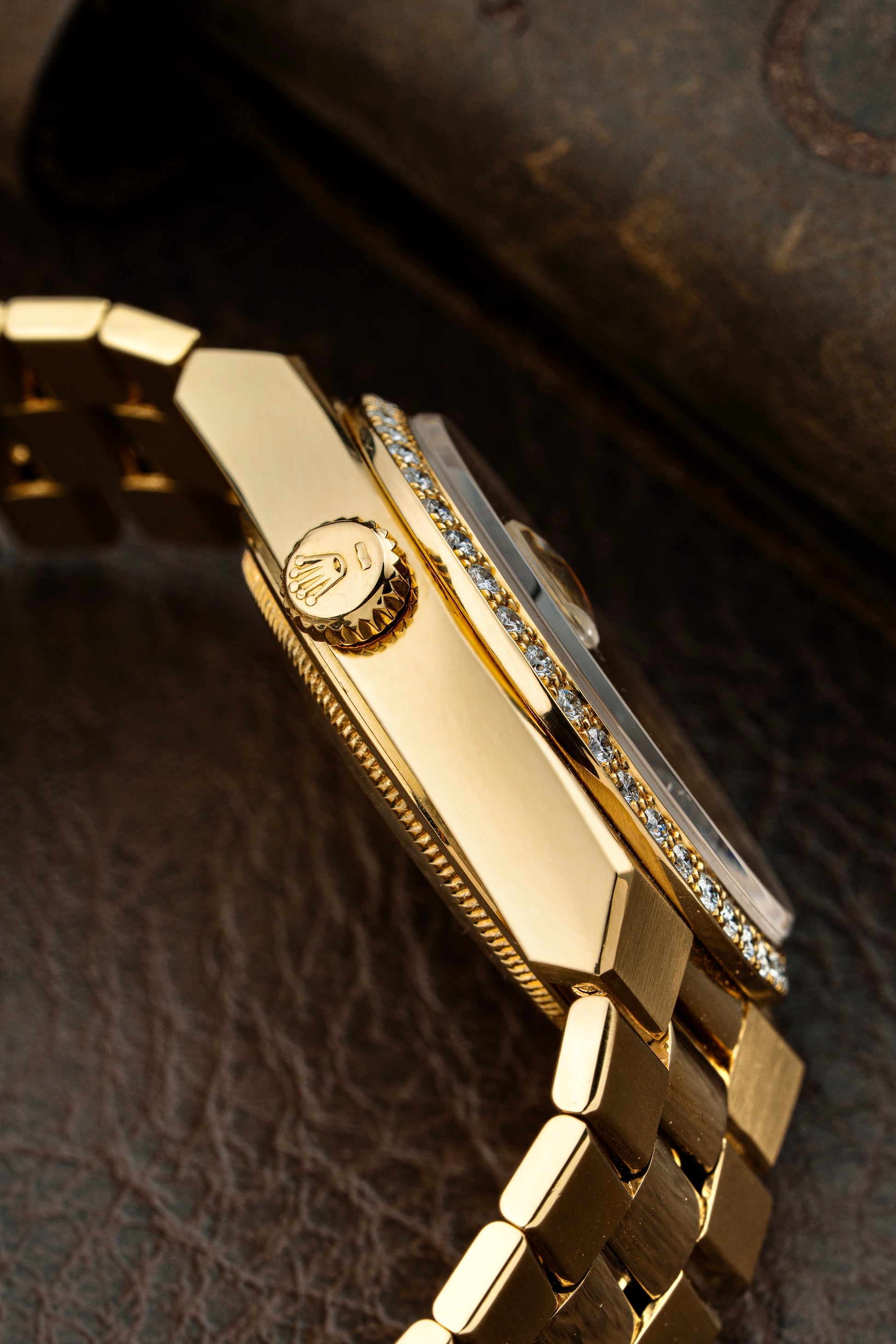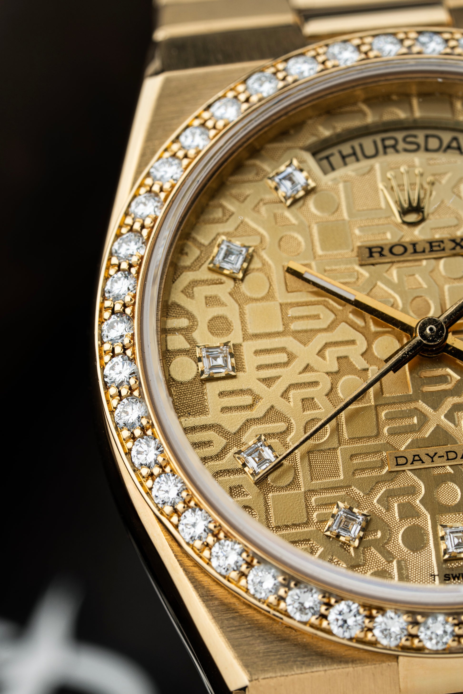 In addition to the diamond bezel, the watch is also fitted with a factory jubilee dial which features an intricate "Jubilee" motif — a repeating ROLEX pattern that adds depth and texture — celebrating the brand’s prestige. Sparkling diamond hour markers, meticulously set in gold, enhance the dial's elegance, offering both opulence and readability. This refined design is paired with the Day-Date’s iconic day and date display, exemplifying Rolex’s blend of sophistication and technical mastery.