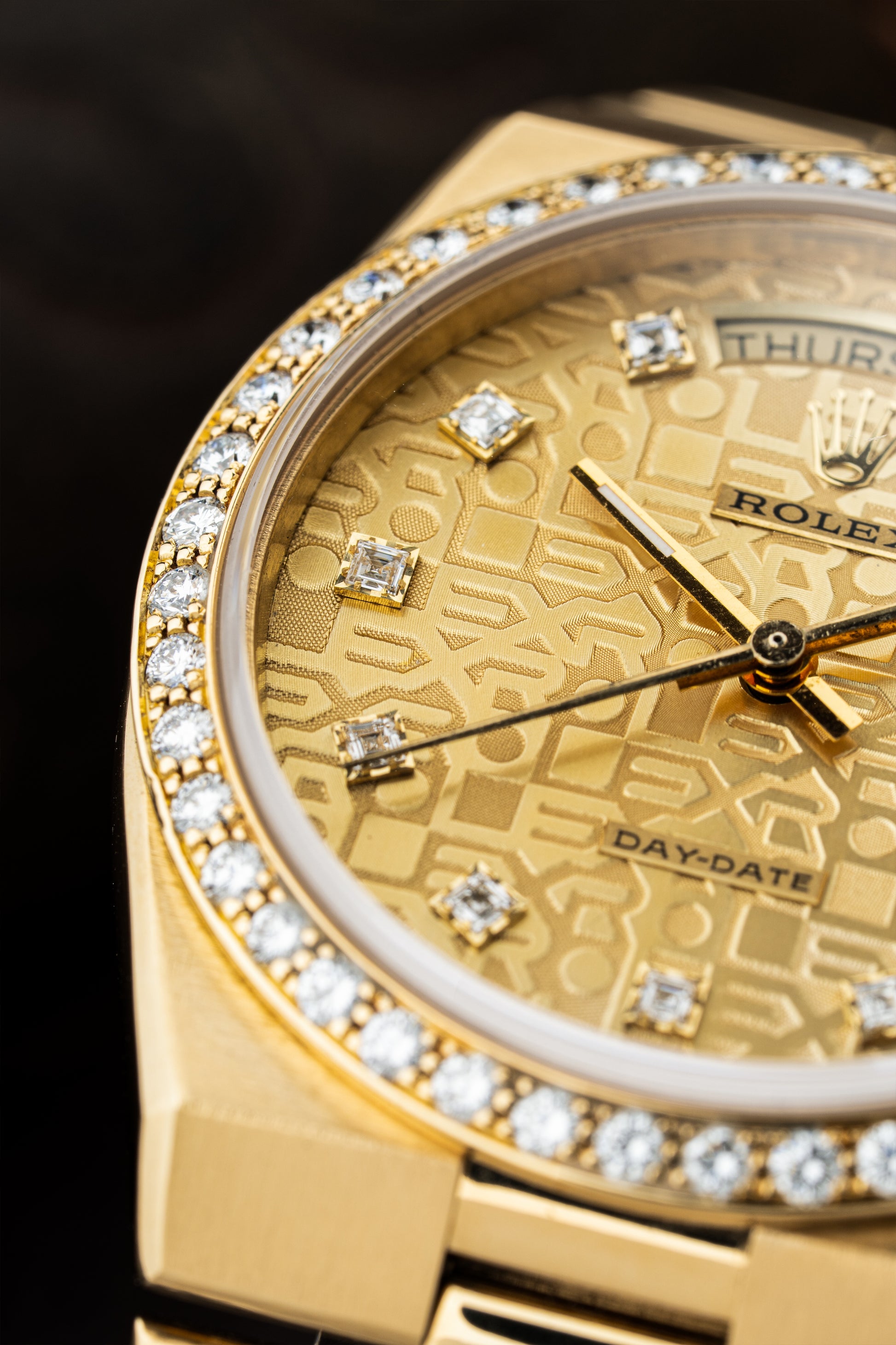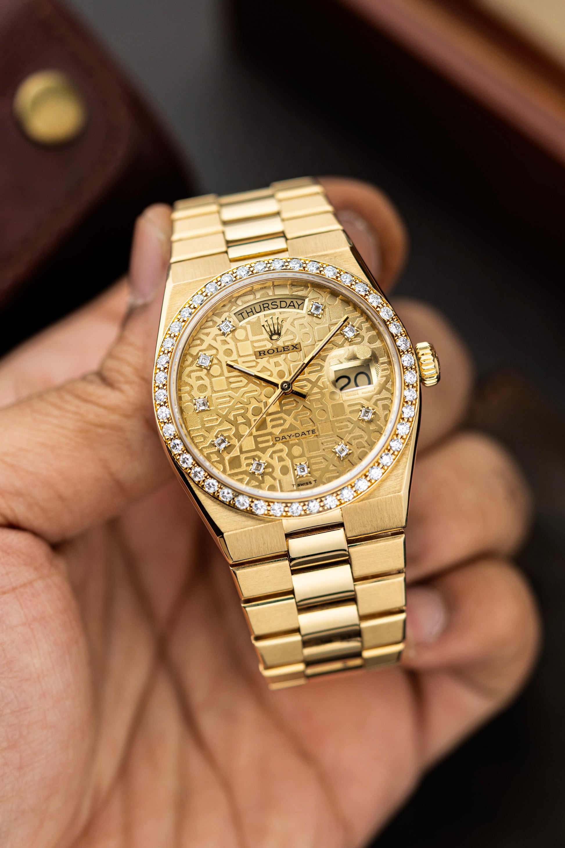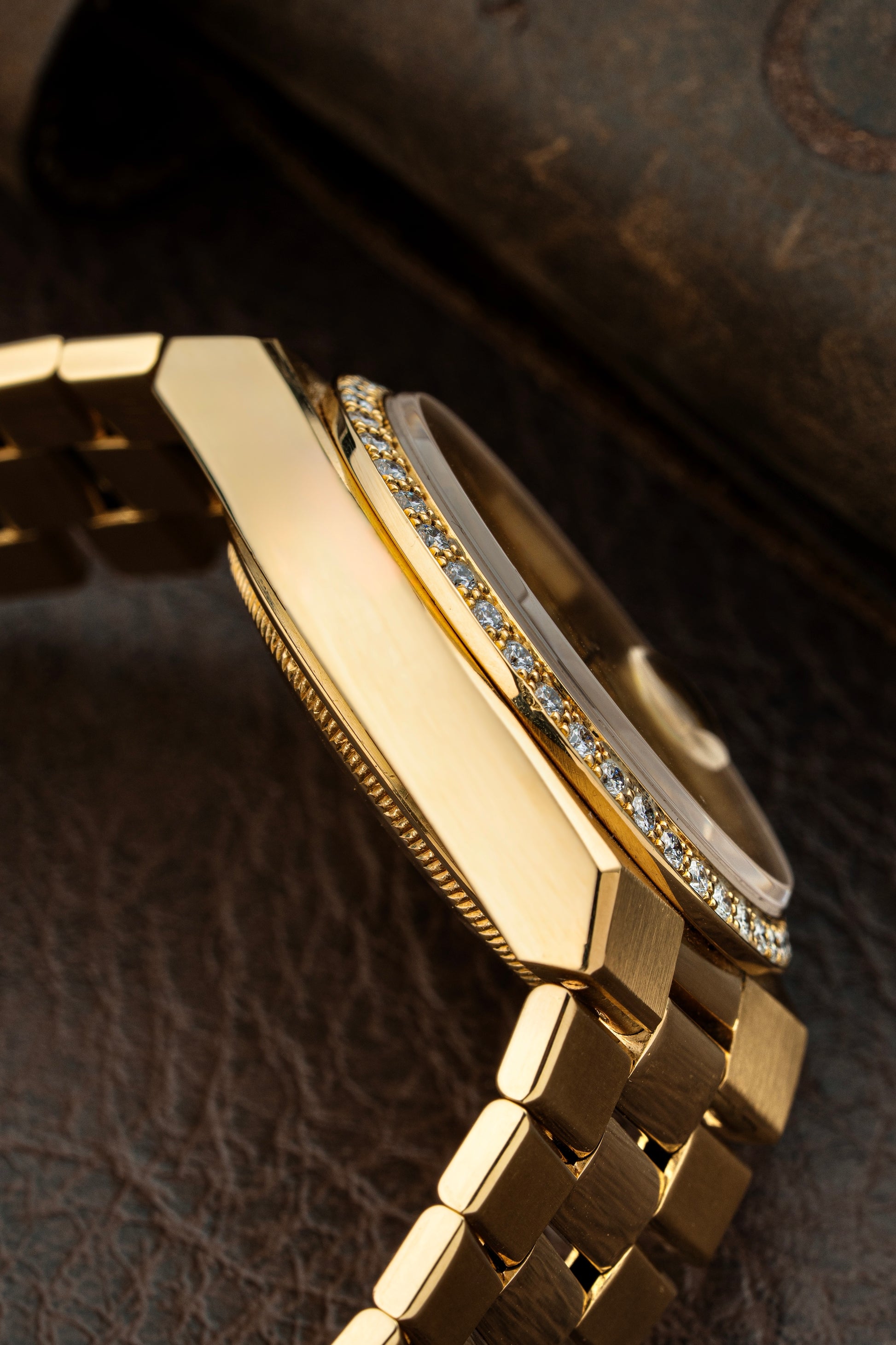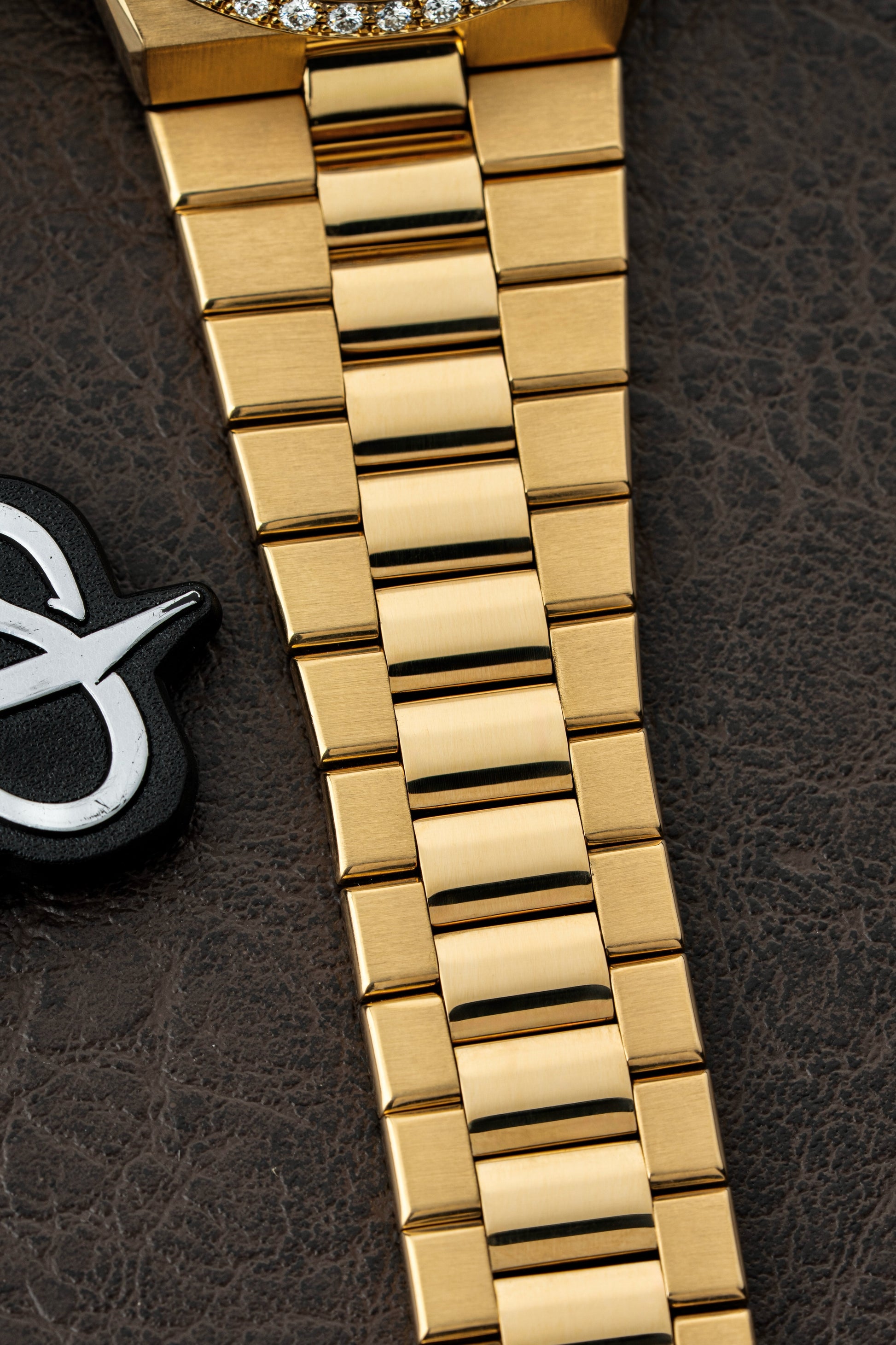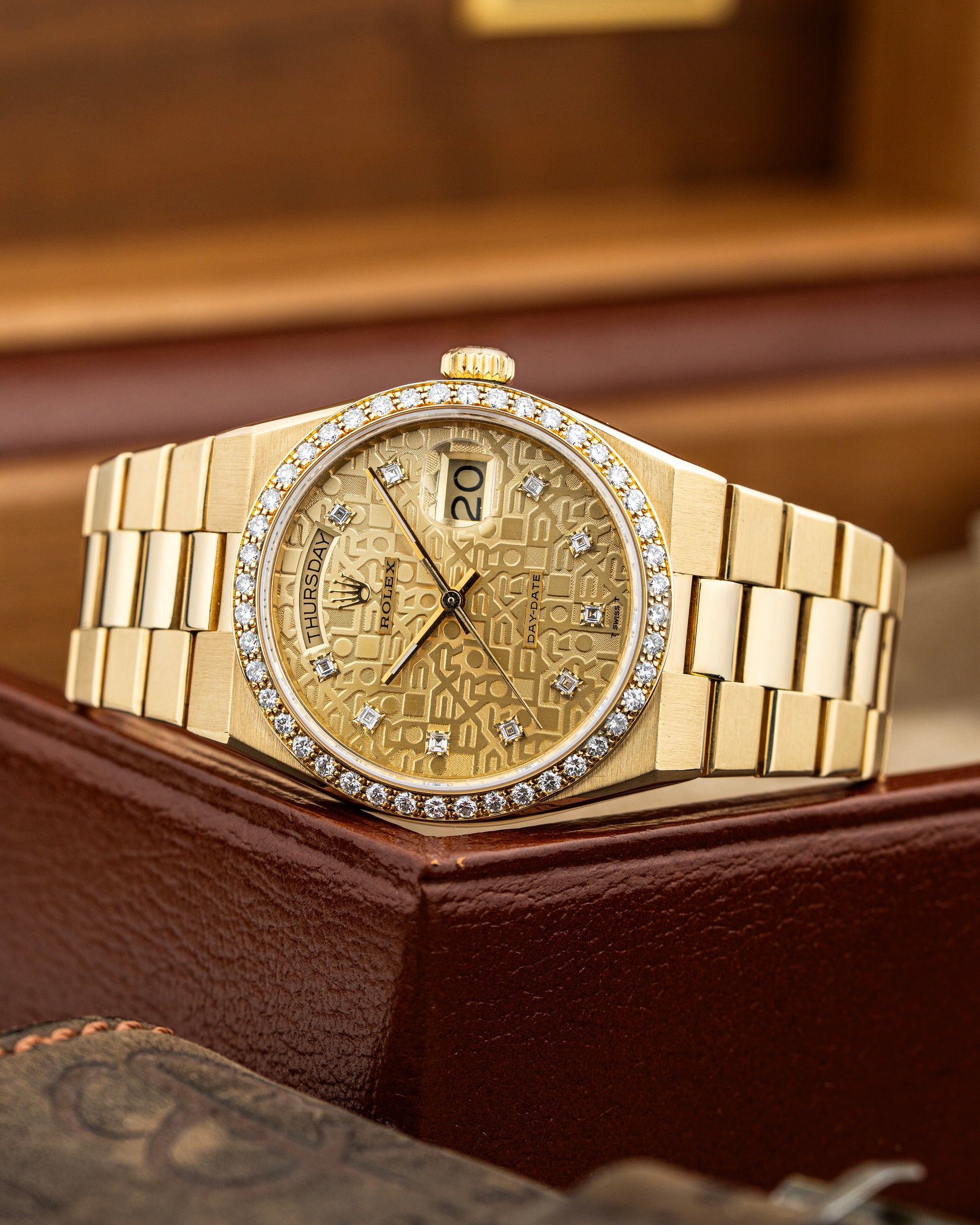 In addition to the diamond bezel, the watch is also fitted with a factory jubilee dial which features an intricate "Jubilee" motif — a repeating ROLEX pattern that adds depth and texture — celebrating the brand’s prestige. Sparkling diamond hour markers, meticulously set in gold, enhance the dial's elegance, offering both opulence and readability. This refined design is paired with the Day-Date’s iconic day and date display, exemplifying Rolex’s blend of sophistication and technical mastery.
