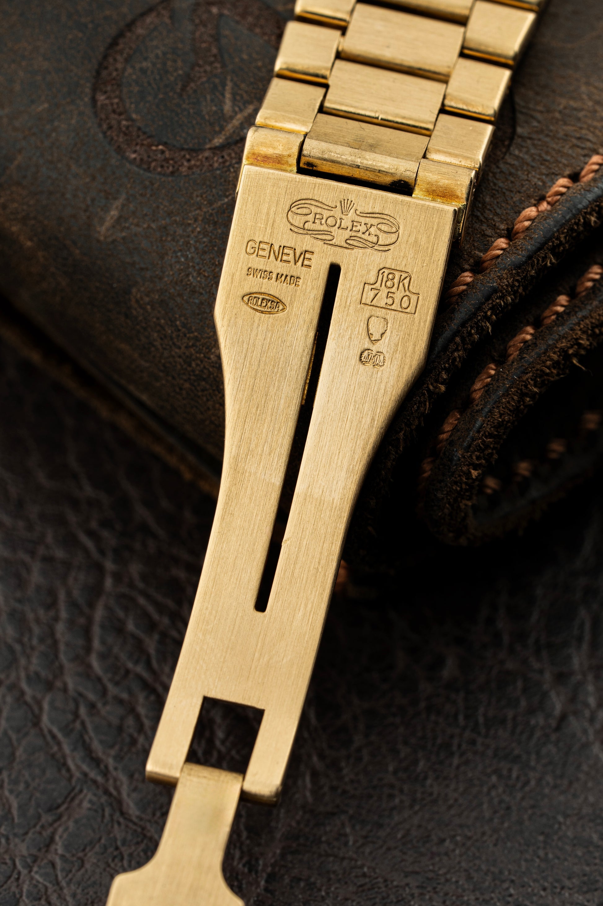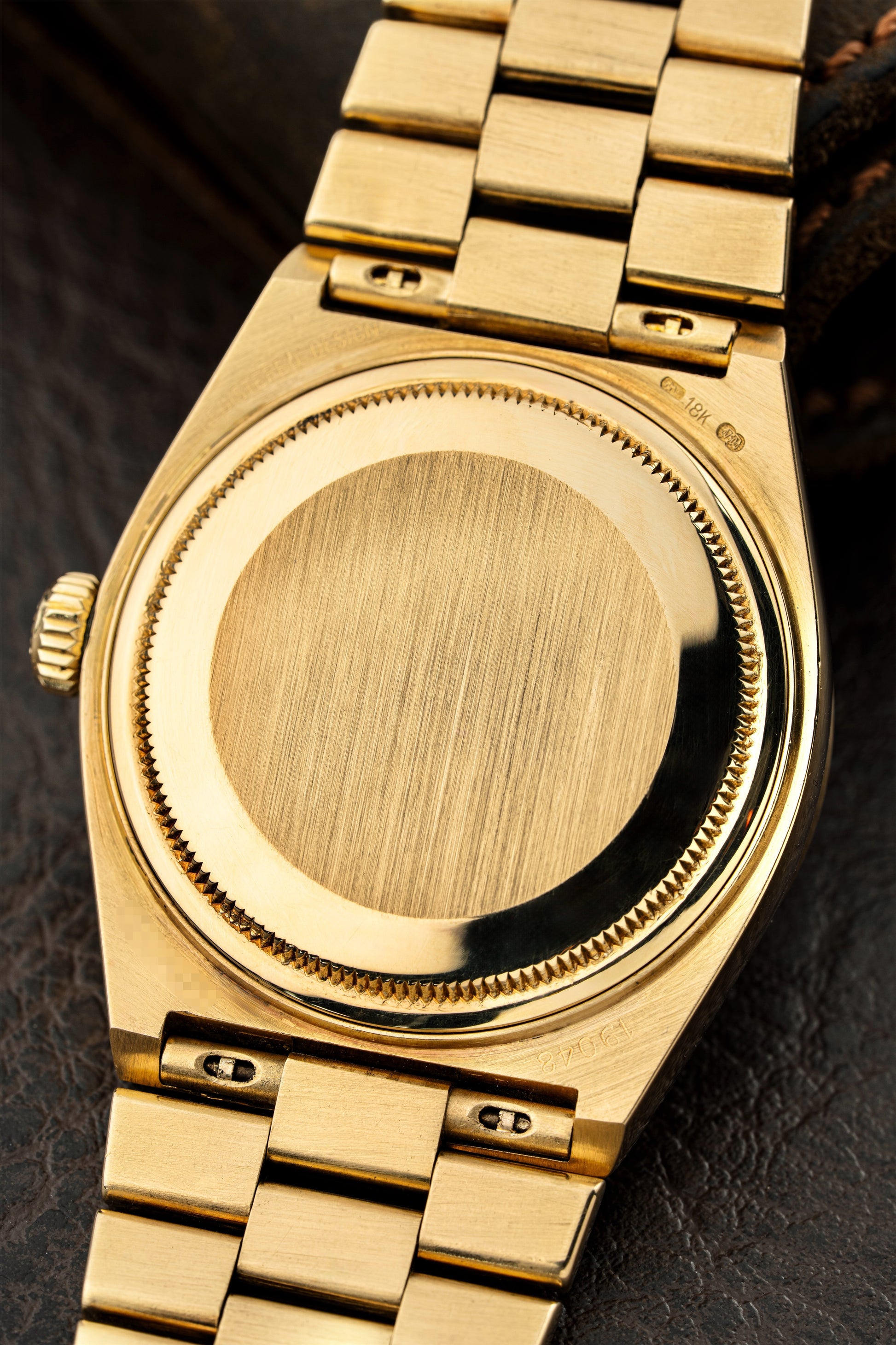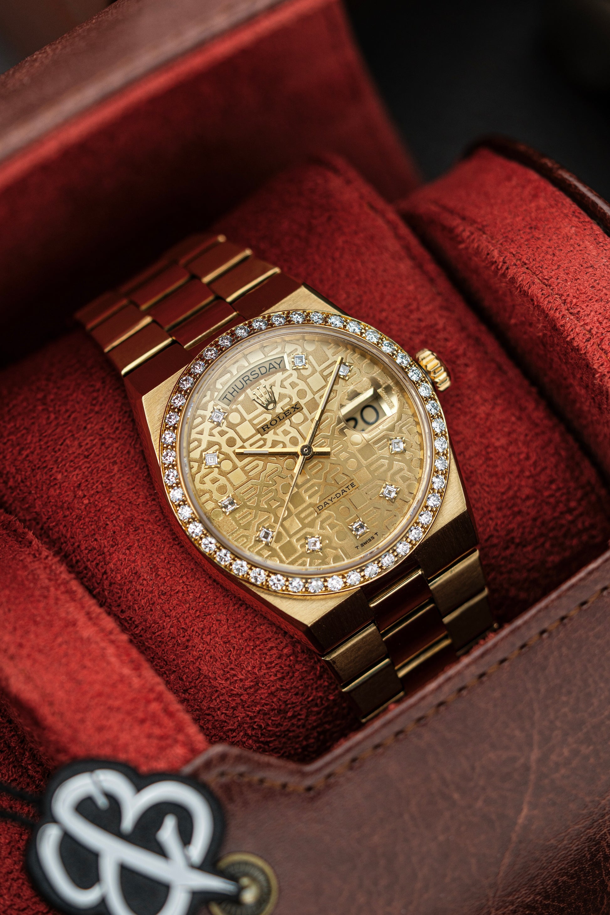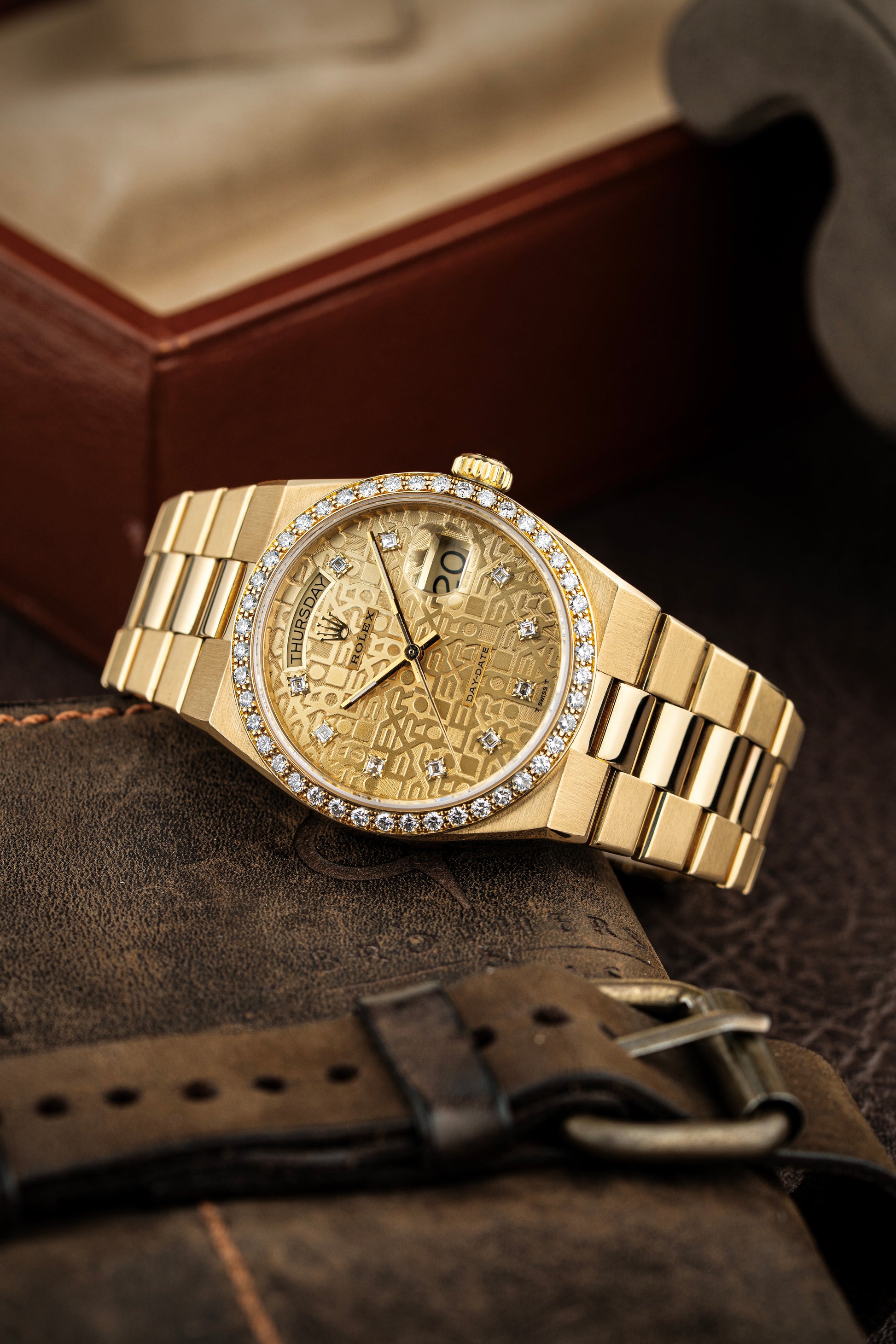 In addition to the diamond bezel, the watch is also fitted with a factory jubilee dial which features an intricate "Jubilee" motif — a repeating ROLEX pattern that adds depth and texture — celebrating the brand’s prestige. Sparkling diamond hour markers, meticulously set in gold, enhance the dial's elegance, offering both opulence and readability. This refined design is paired with the Day-Date’s iconic day and date display, exemplifying Rolex’s blend of sophistication and technical mastery.
