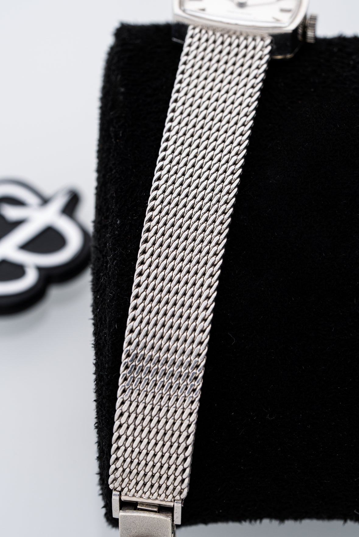 Bracelet: The case is paired with the original 9ct white gold Milanese (mesh) bracelet. The mesh/Milanese style gives the watch a sleek, continuous or woven-metal aesthetic, which enhances comfort and lends a vintage-luxury appeal.