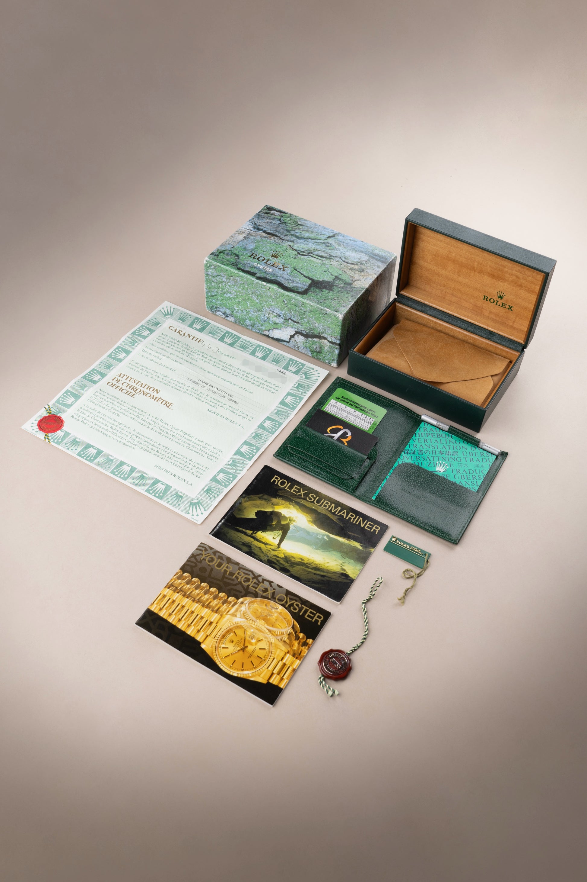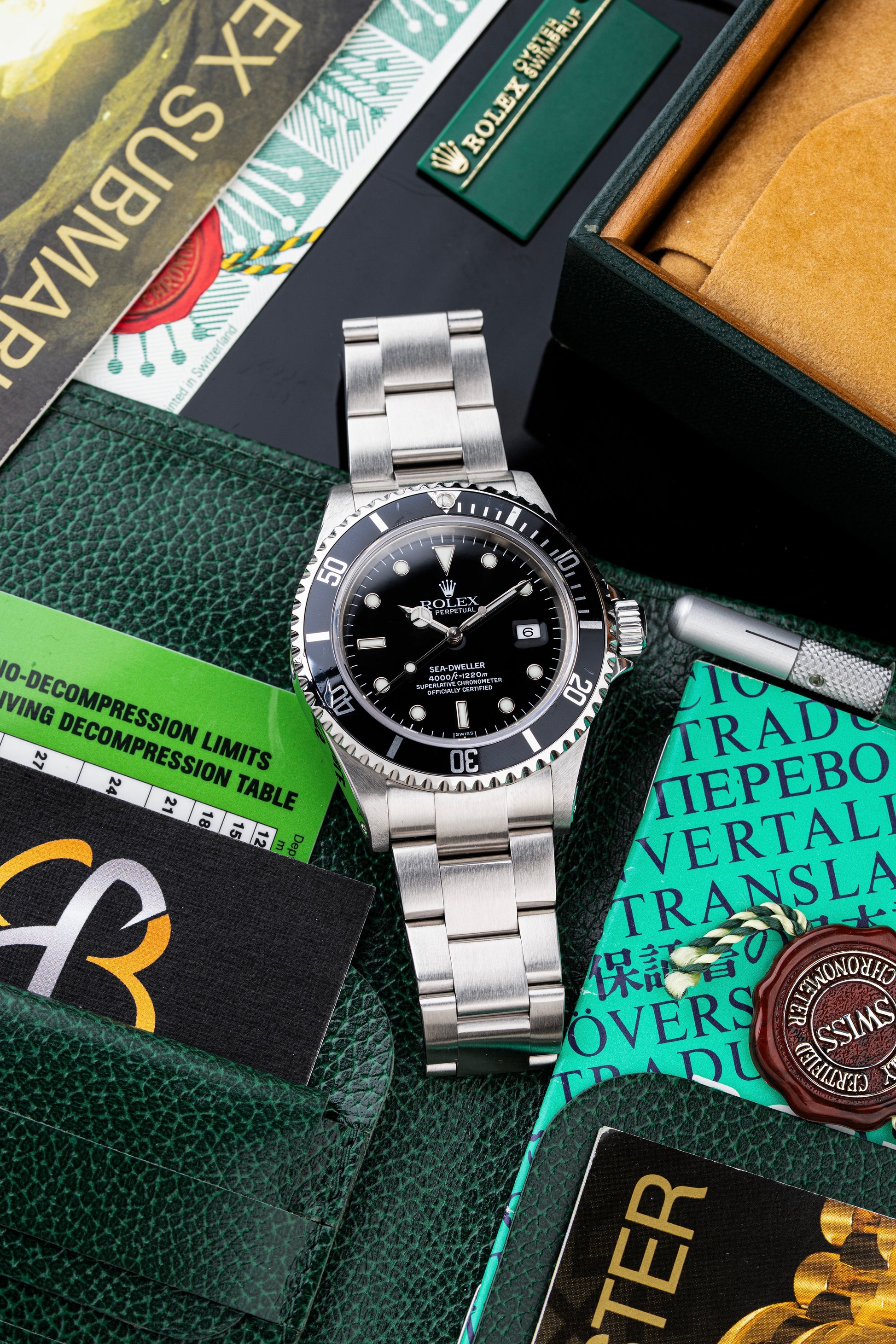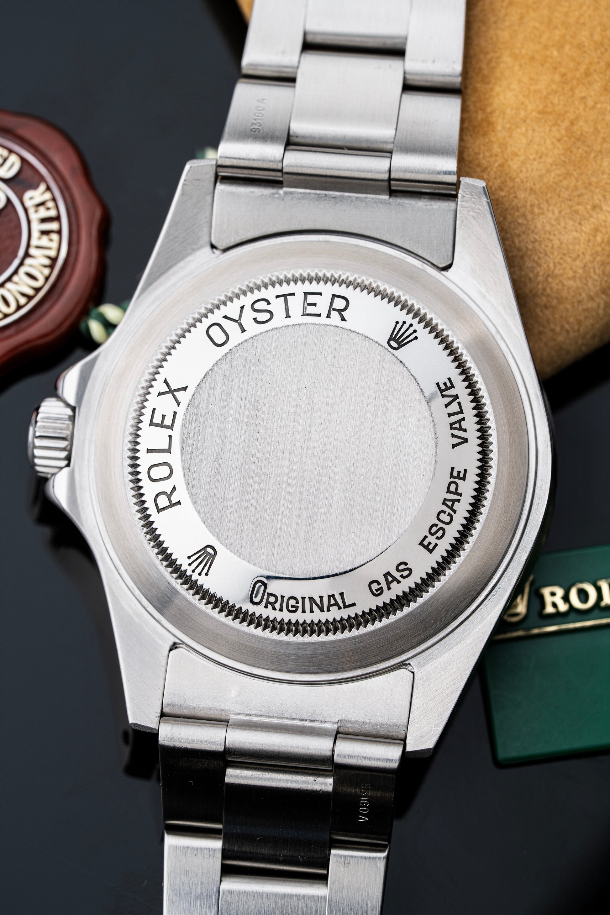 Provenance: This Sea-Dweller was produced in 1999 and is sold as a complete set, including the original inner and outer Rolex boxes, punched guarantee papers, both green and red swing tags, Rolex leather wallet, and associated manuals.