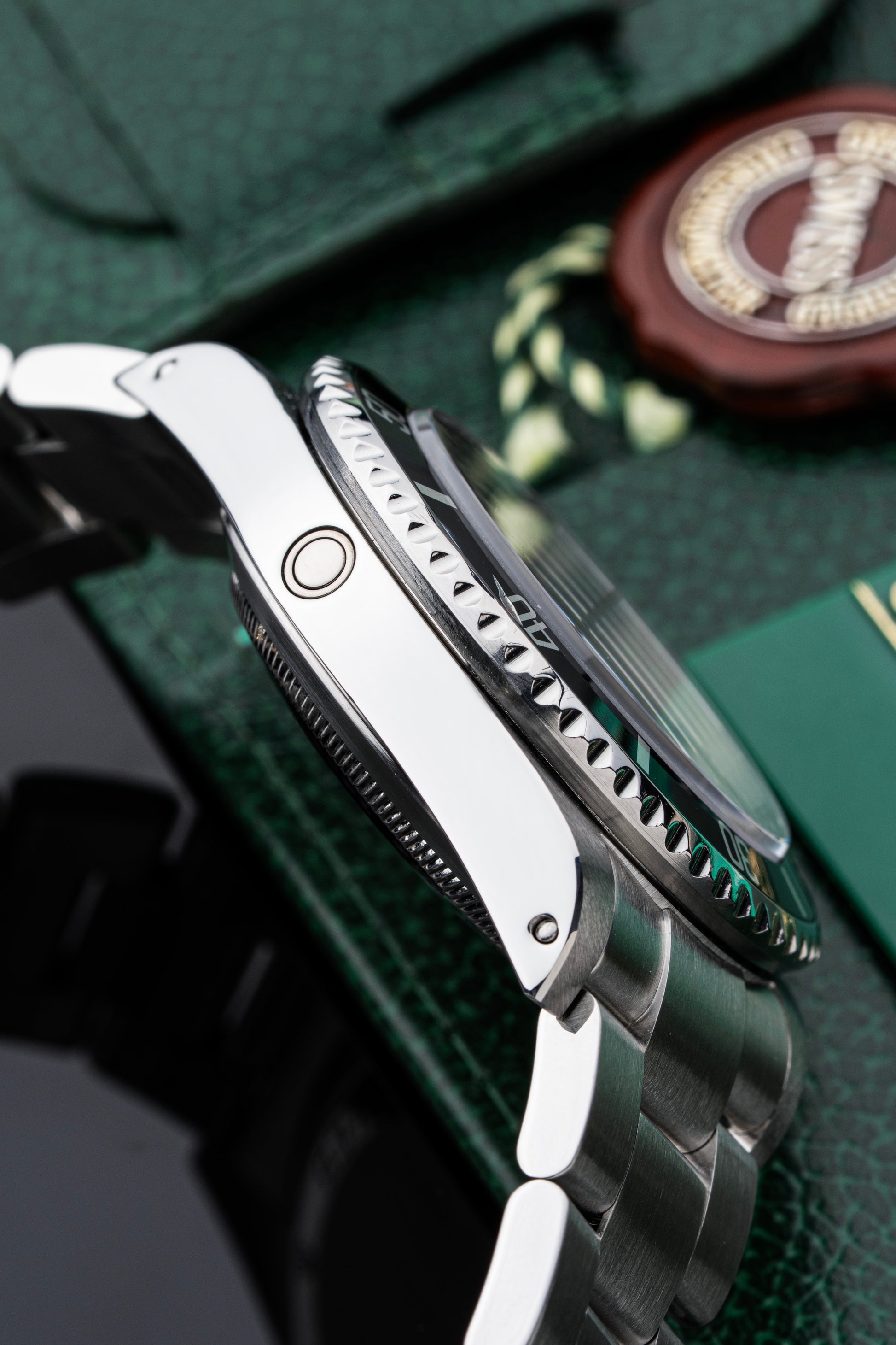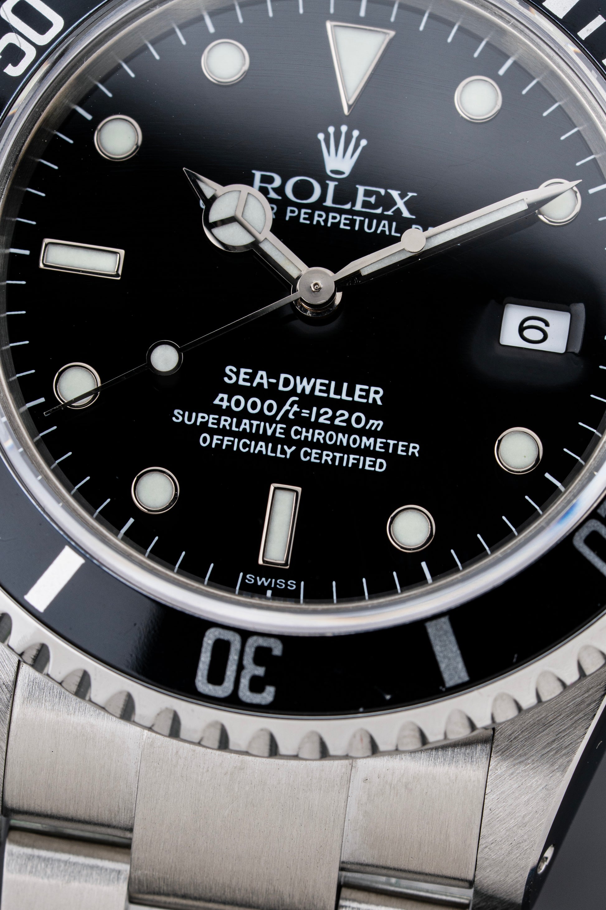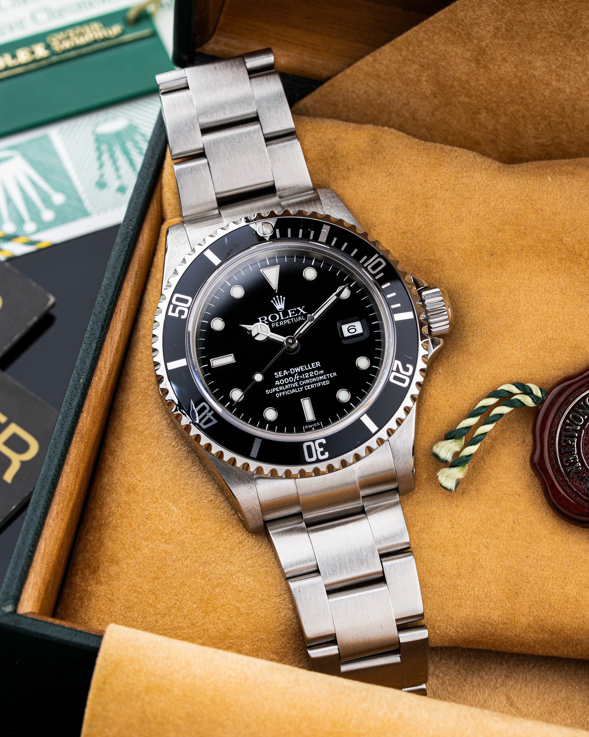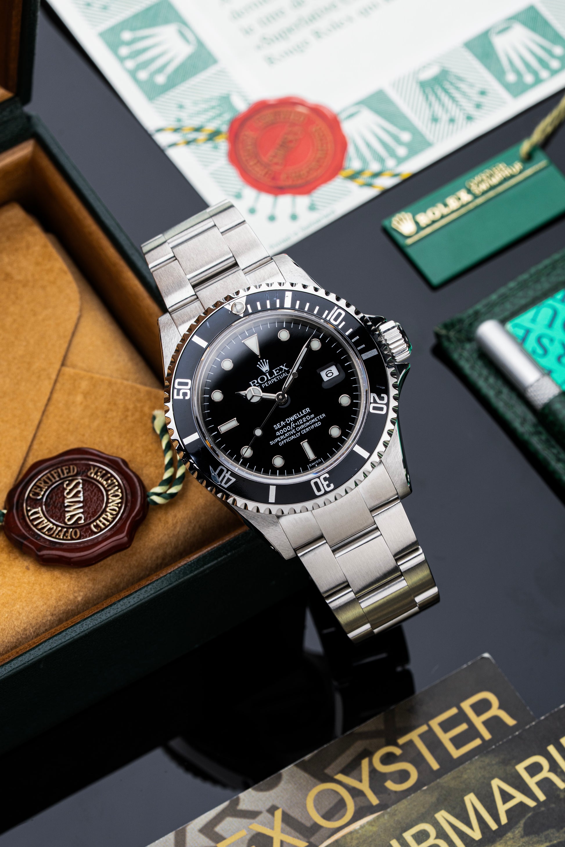 Provenance: This Sea-Dweller was produced in 1999 and is sold as a complete set, including the original inner and outer Rolex boxes, punched guarantee papers, both green and red swing tags, Rolex leather wallet, and associated manuals.