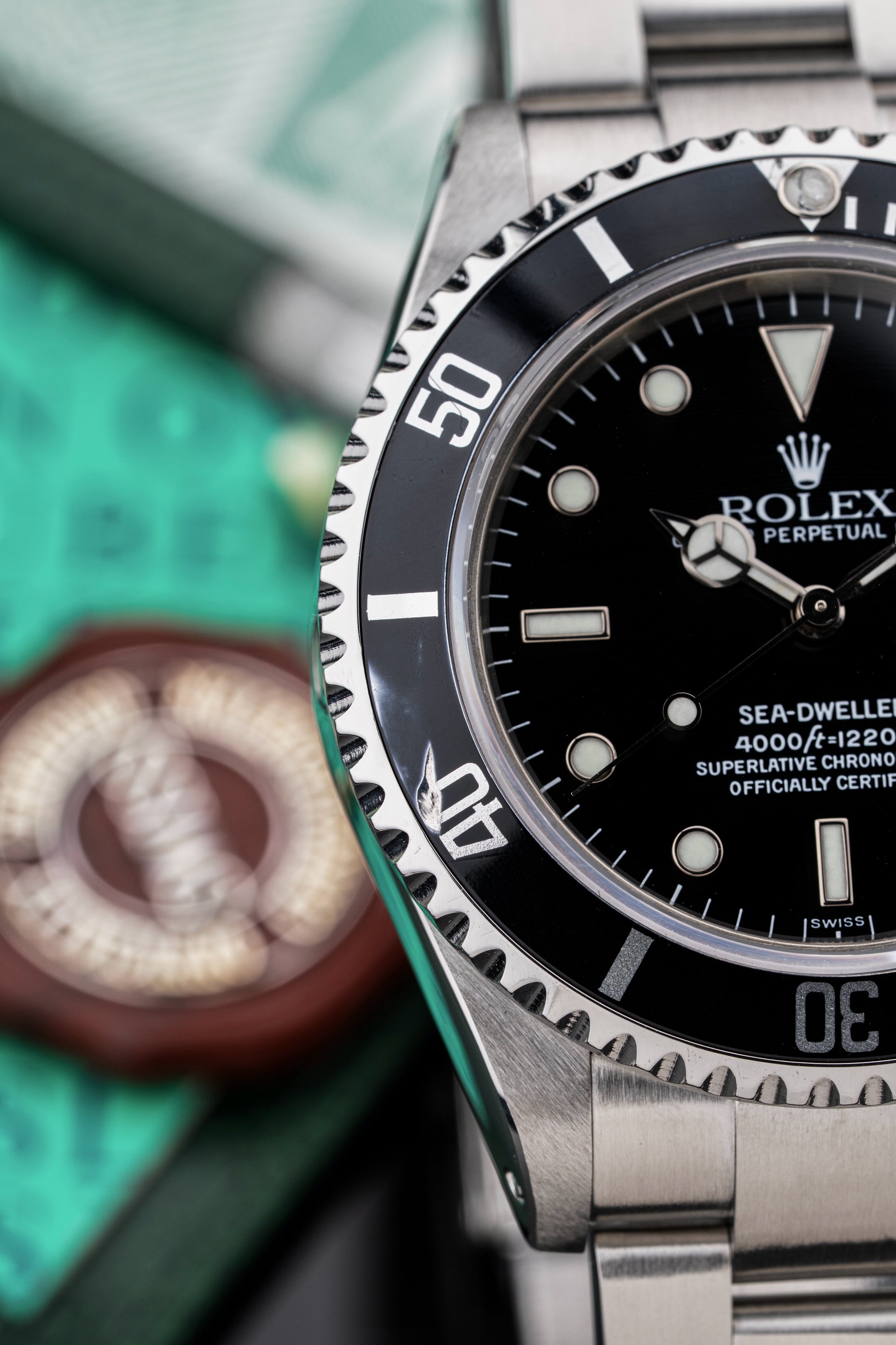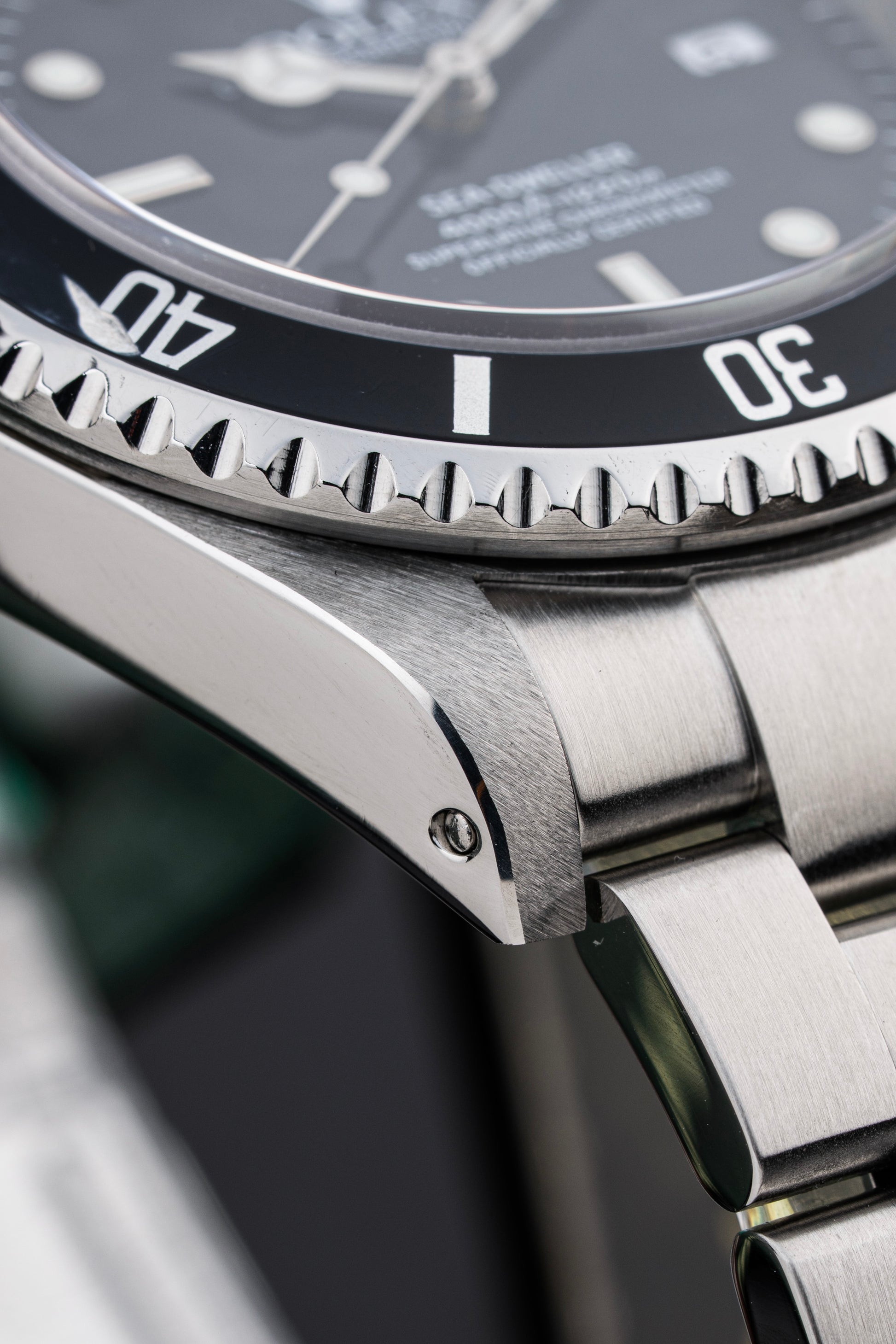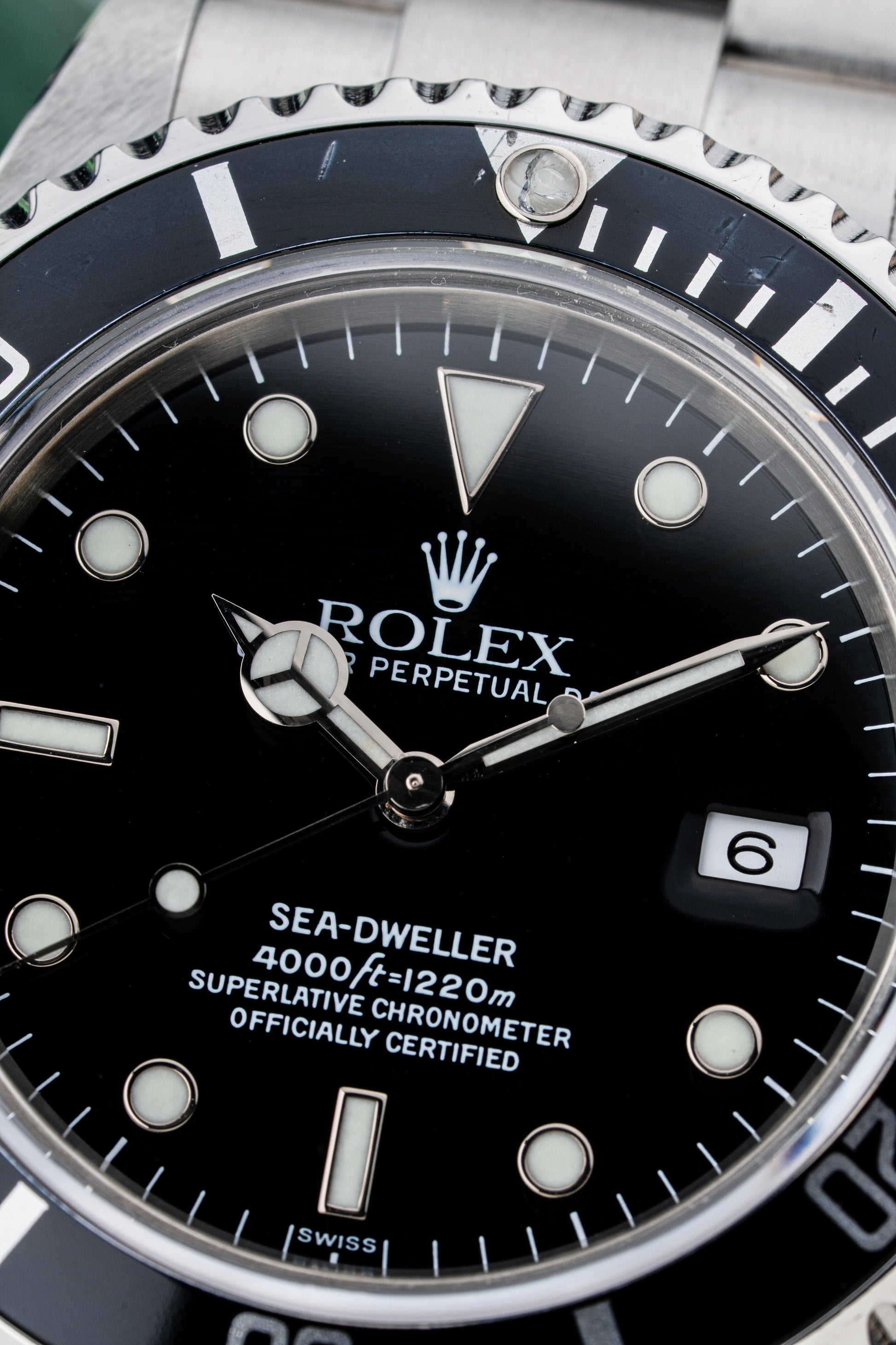 The Bezel: The Sea-Dweller is equipped with a unidirectional rotating bezel with a black aluminum insert, used to time decompression stops or elapsed dive time. While the case and crystal are pristine, the insert shows some scuffs and wear-related marks, consistent with light use. These surface imperfections do not detract from the functionality of the bezel and offer a touch of character for collectors who appreciate signs of genuine wear on a tool watch.