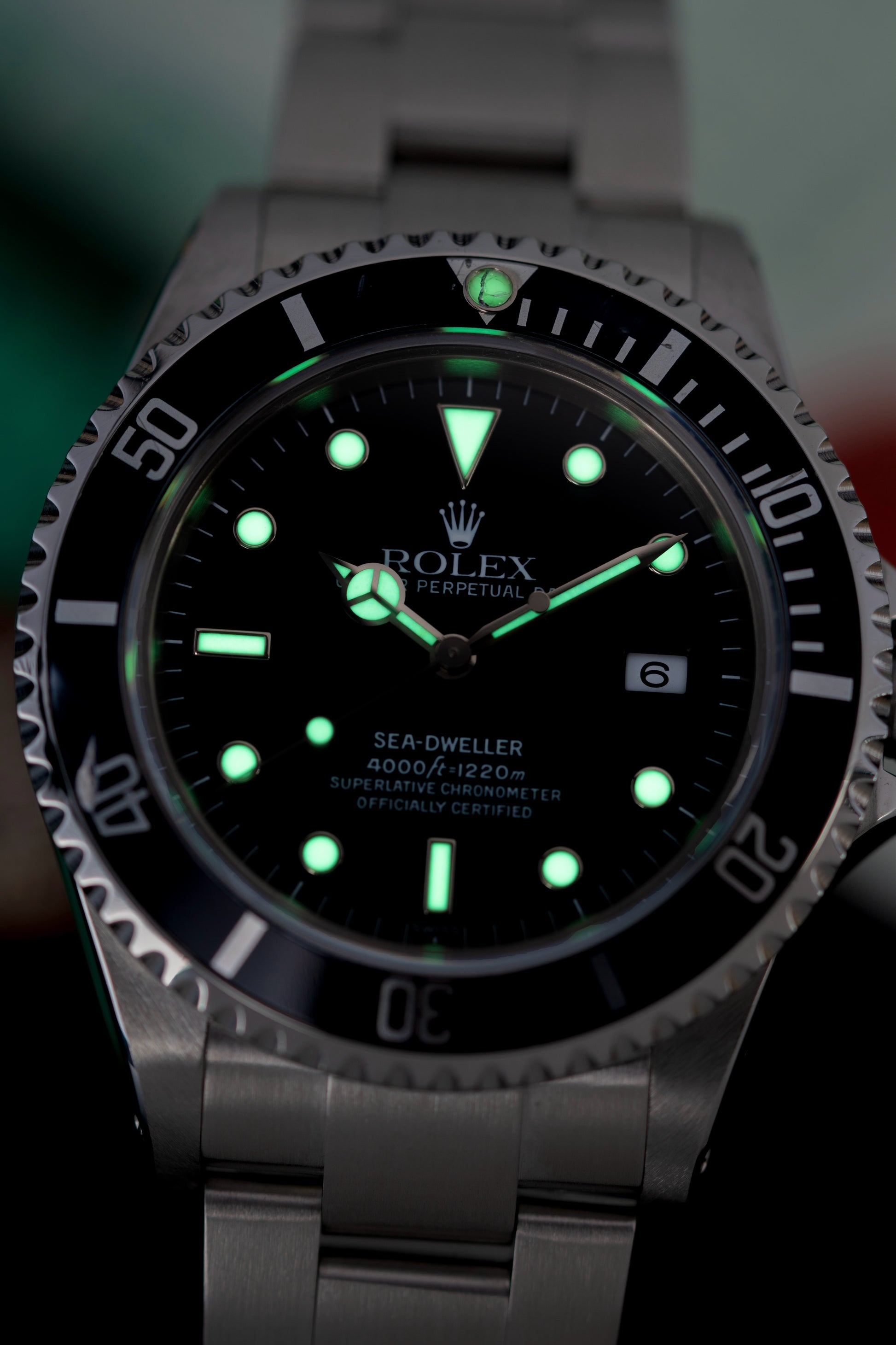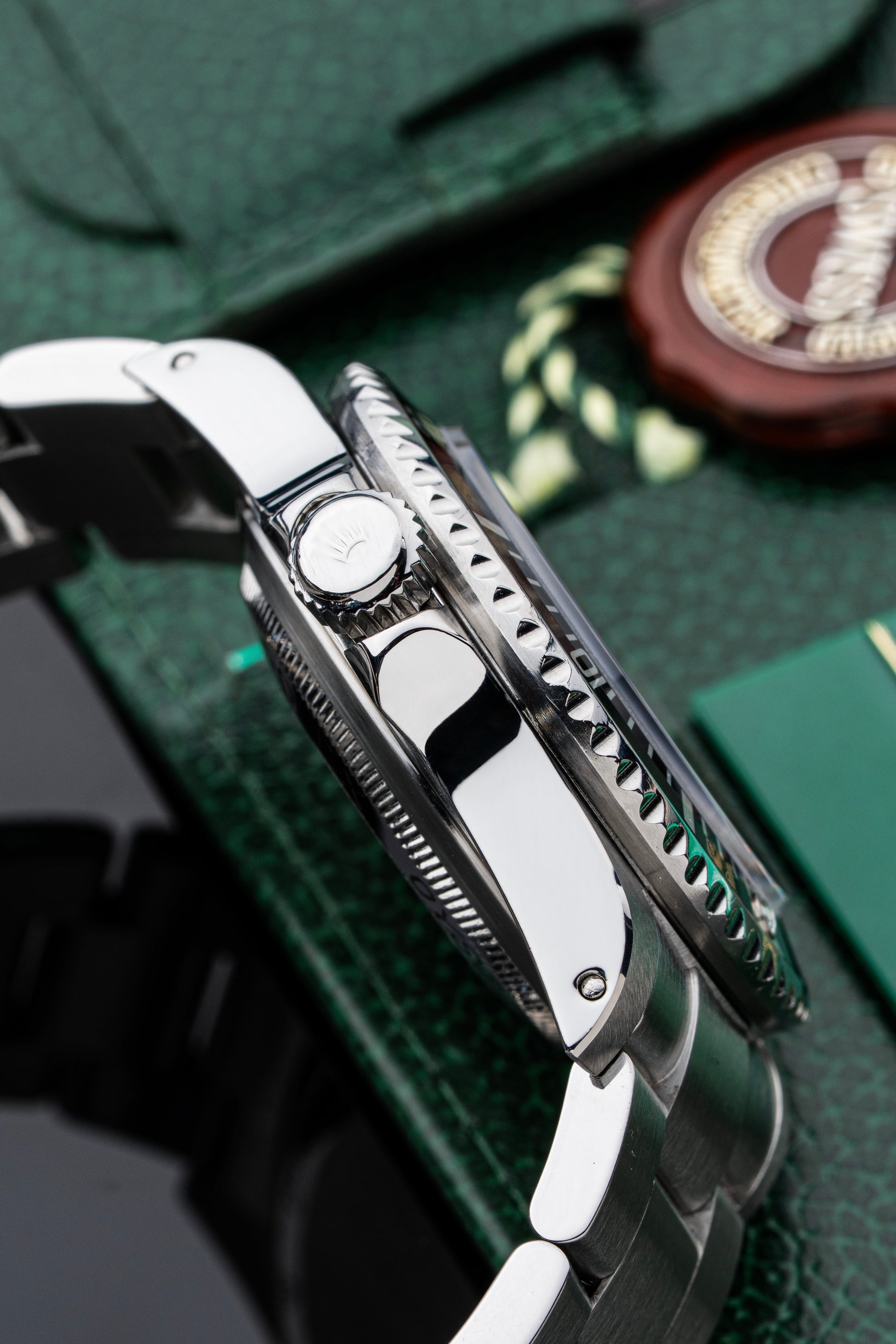 The Case: The case of the Sea-Dweller 16600 is crafted from 904L stainless steel and measures 40mm in diameter. Unlike the Submariner, the Sea-Dweller features a thicker case and deeper depth rating of 1220 meters / 4000 feet, enabled by the inclusion of a helium escape valve on the left side of the case. The case remains in outstanding condition, with sharp lugs, thick crown guards, and no signs of over-polishing. The Triplock crown ensures water resistance and is securely screwed down. This watch features a sapphire crystal with no magnification bubble, offering a clean, flat profile that divers and collectors appreciate.