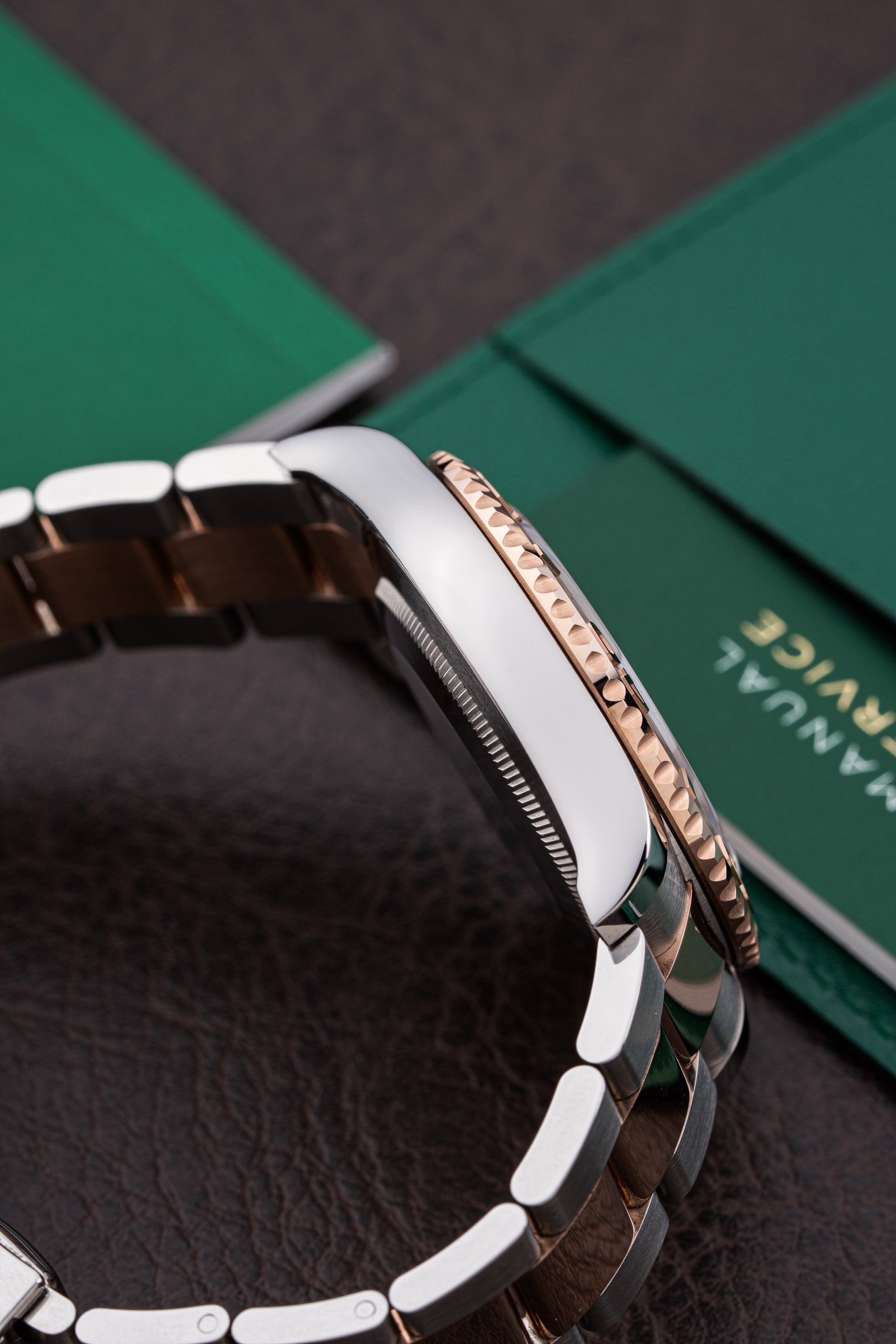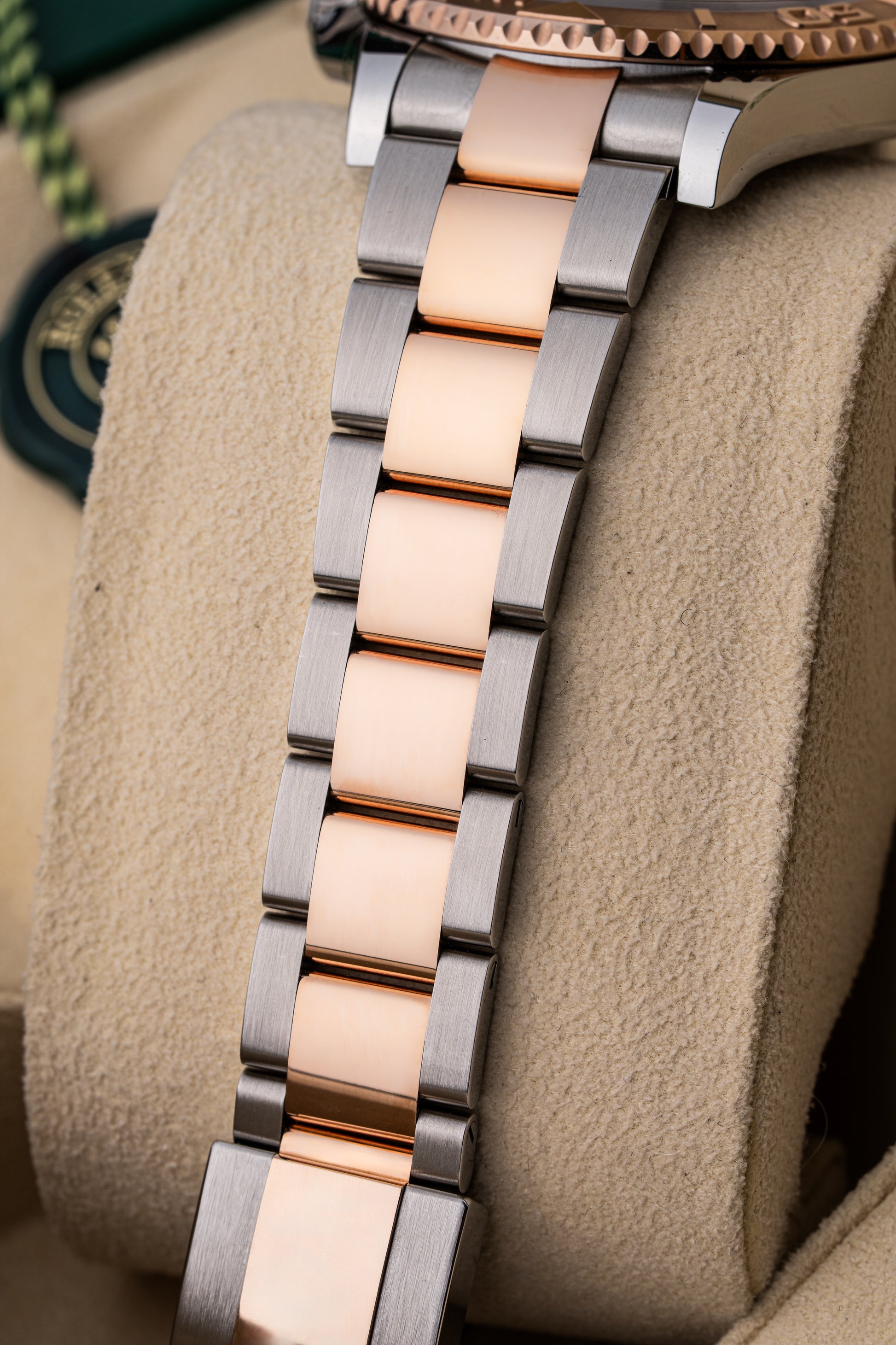 The 40mm stainless steel case is fitted with an 18k Everose gold bidirectional bezel featuring raised polished numerals set against a matte background — a signature characteristic of the Yacht-Master’s sporty yet luxurious design. The Everose Rolesor Oyster bracelet pairs brushed steel outer links with 18k Everose gold polished center links, creating a striking visual contrast and delivering excellent comfort on the wrist.